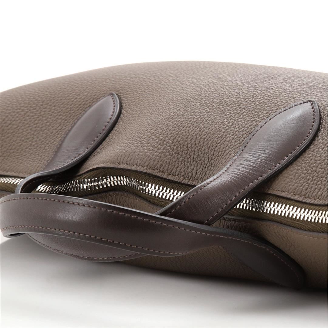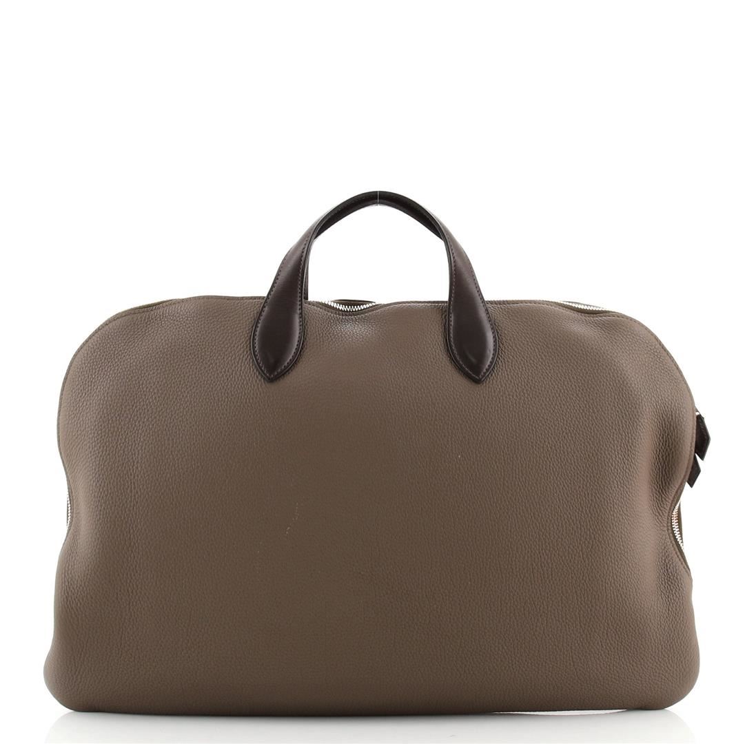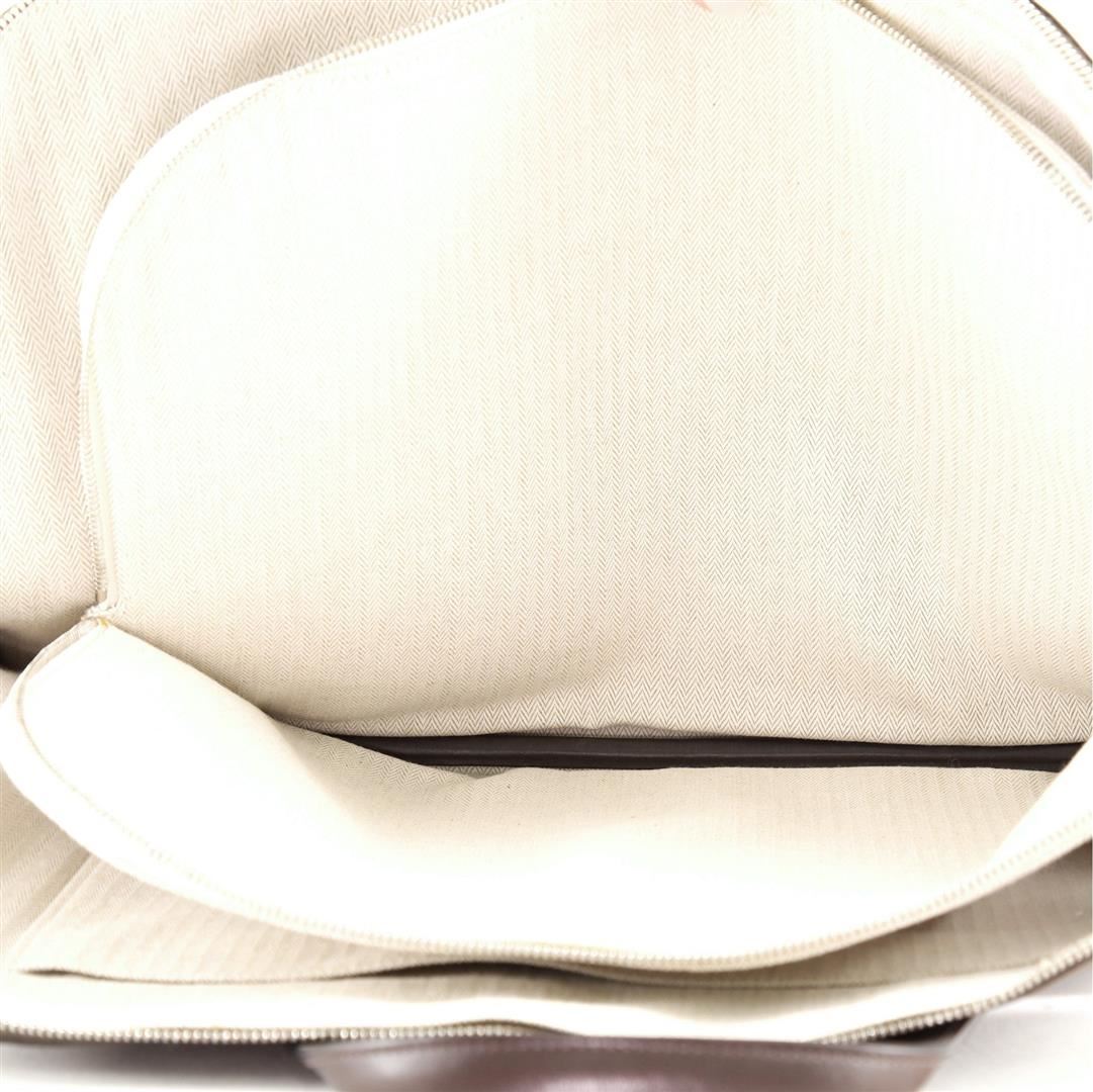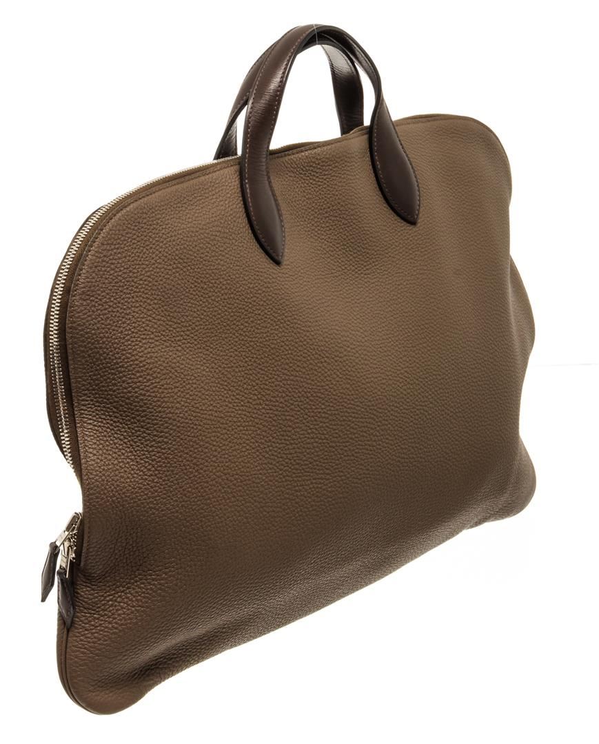 One Hermes Brown Togo Leather Victoria Travel Briefcase. Item is sold AS-IS. All available information is listed in the description and shown in the photo. Hermes Brown Togo Leather Victoria Travel Briefcase with brown Togo leather, silver-tone hardware, trim leather, interior slip pocket, dual top handle, and zipper closure. Height 13", Width 19", Depth 2"