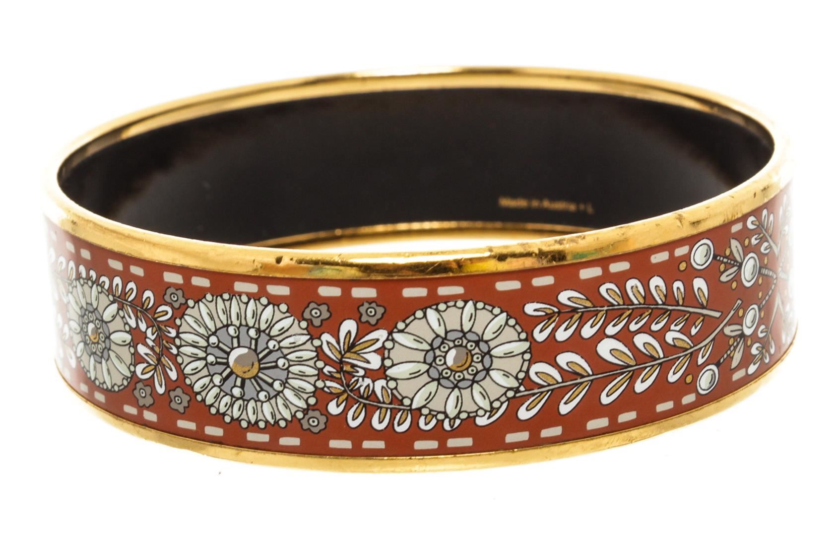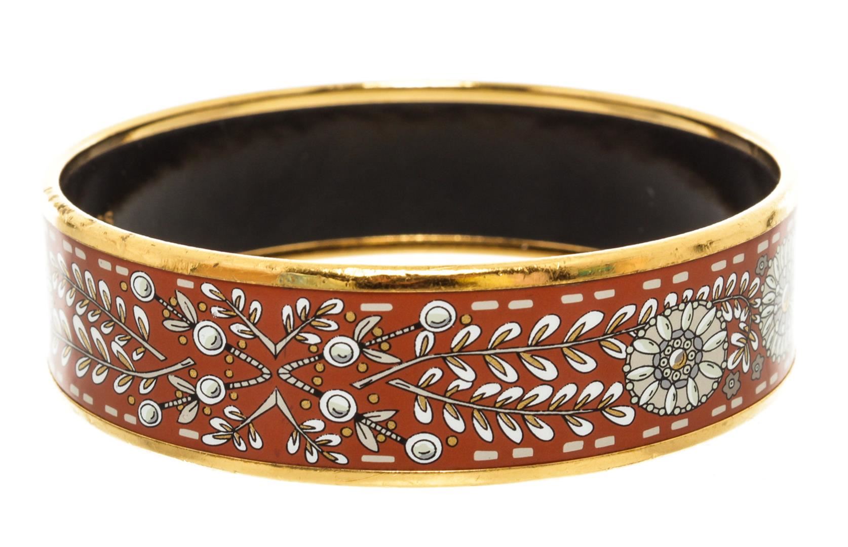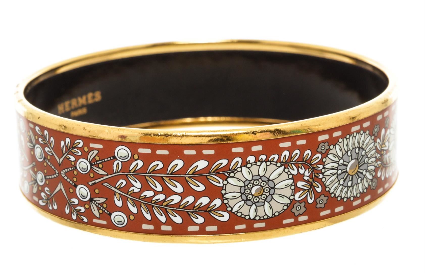 Hermes gold plated brown white multicolor enamel bangle bracelet. Authentic.