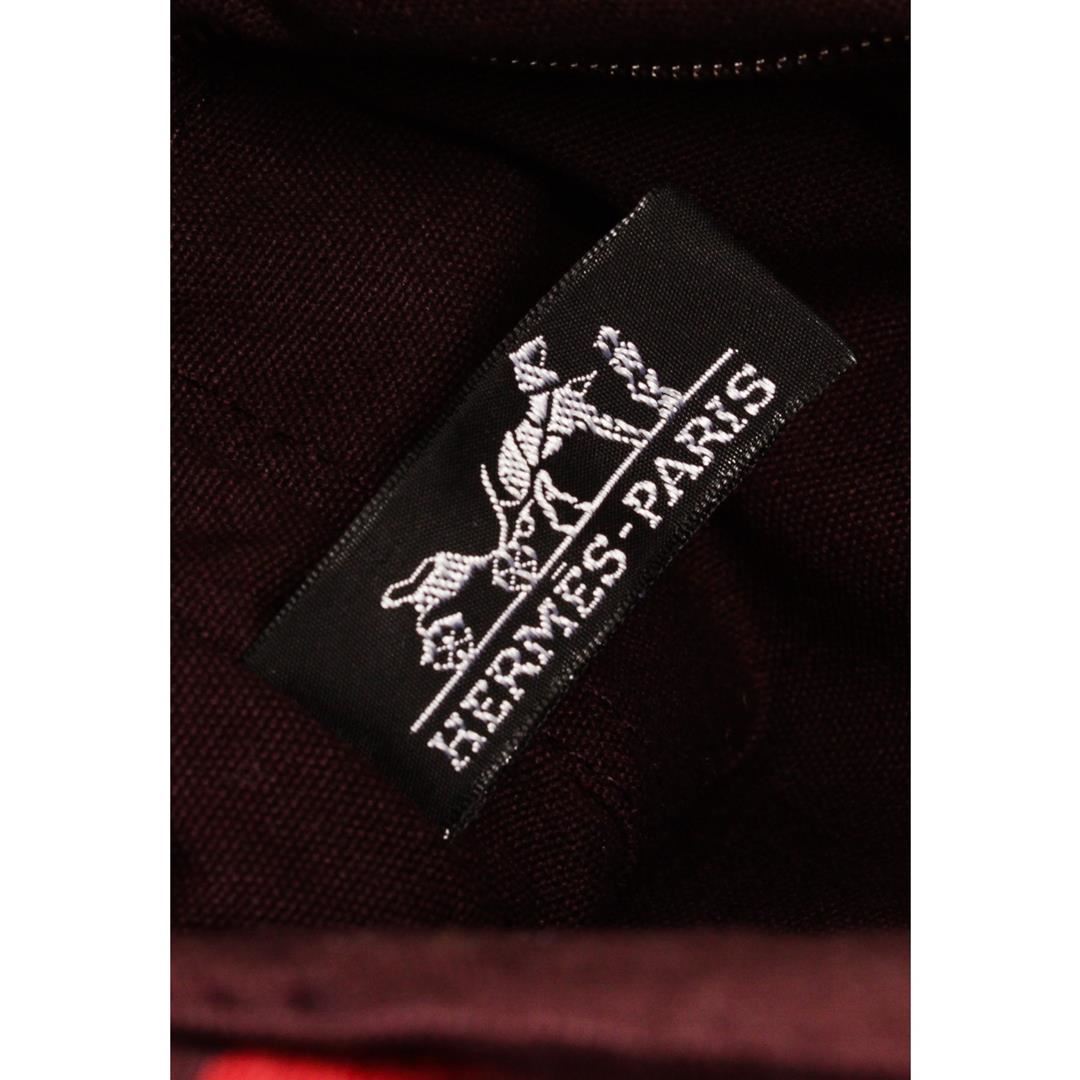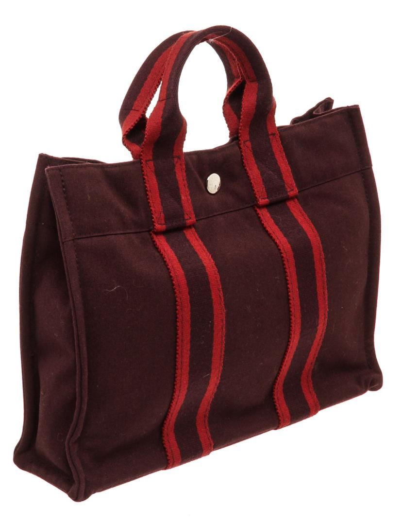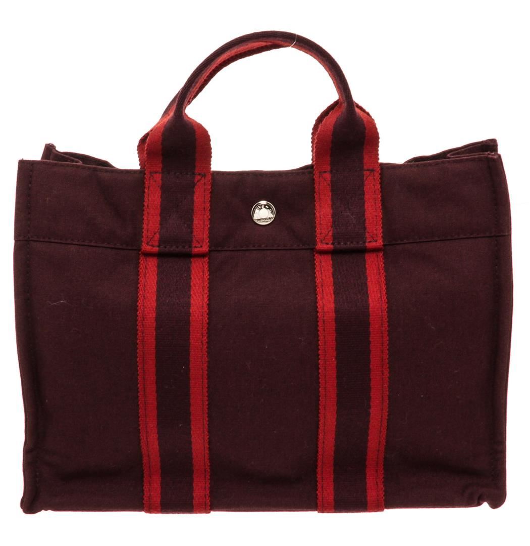 Hermes red canvas Sac Fourre PM tote bag with stripe handles, interior zip pocket, and snap closure. Authentic.