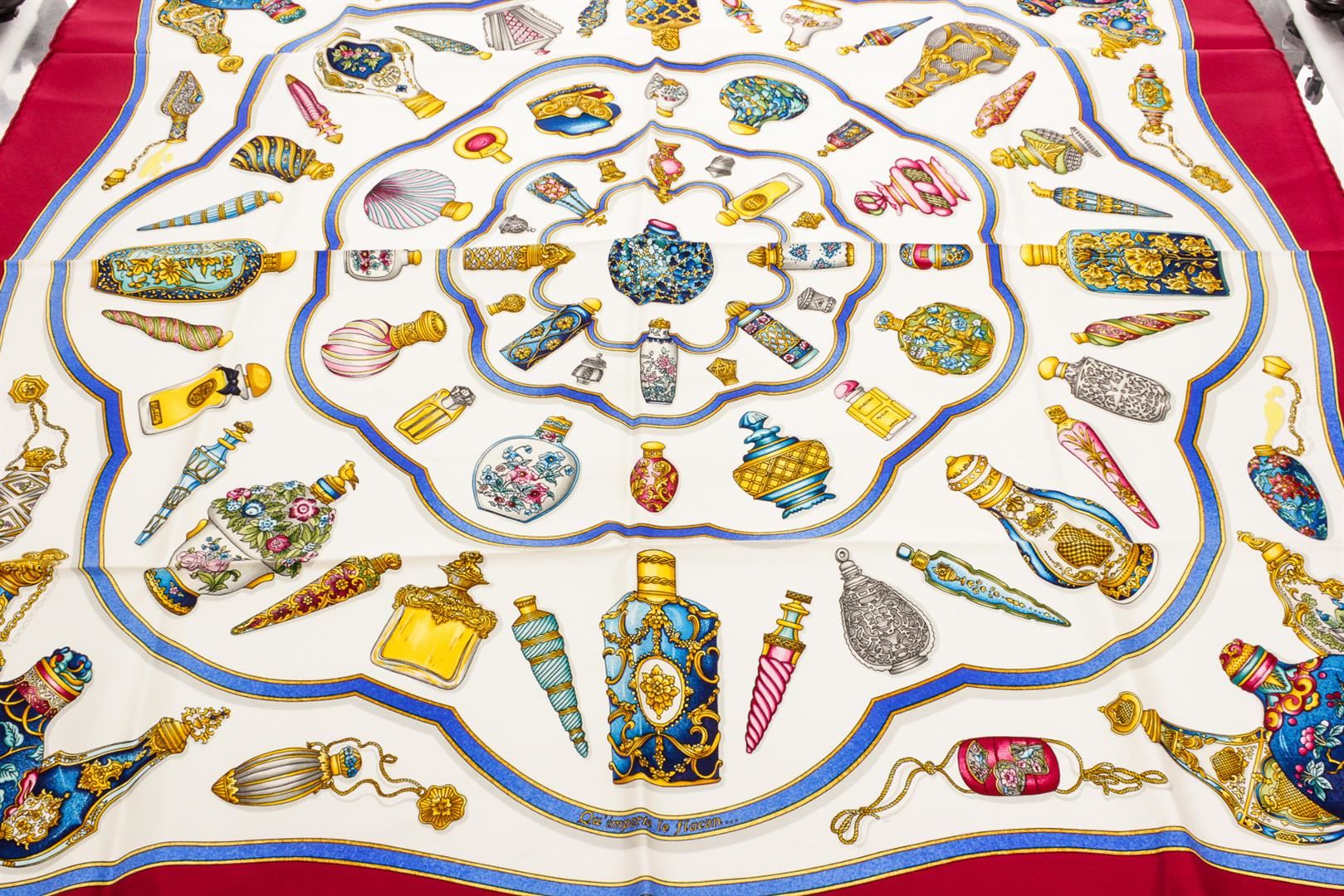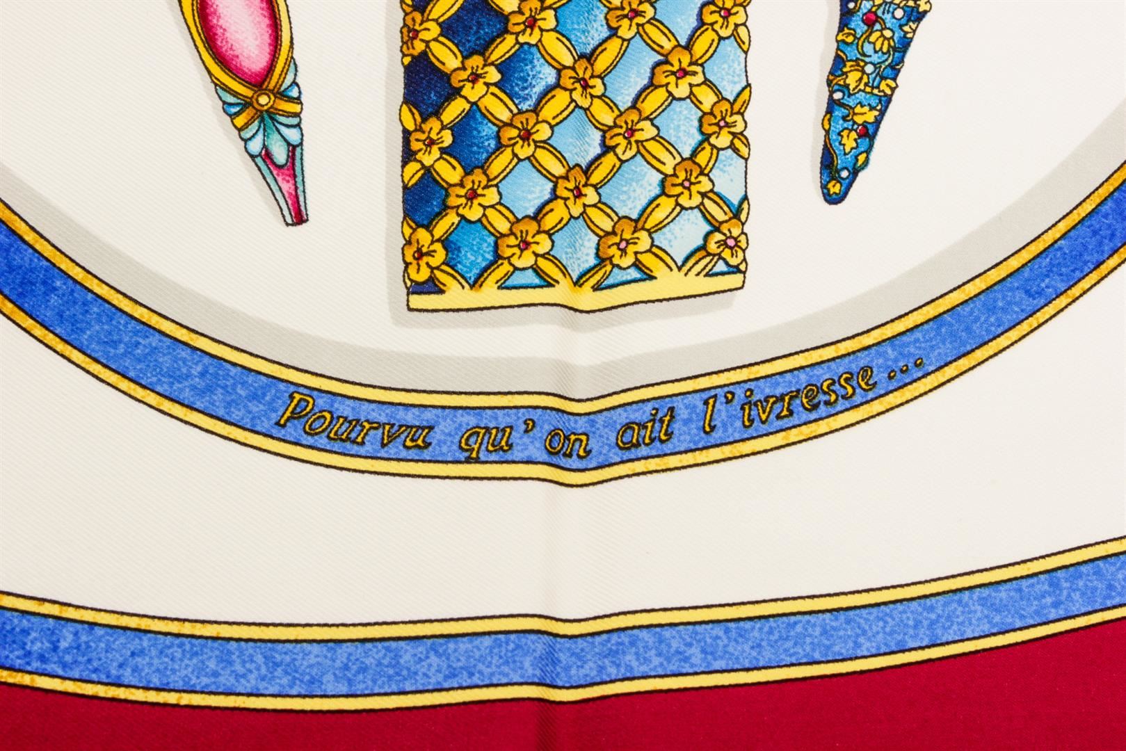 Hermes burgundy blue multicolor Qu'importe le Flacon Catherine Baschet Silk Scarf 90, hand rolled edges.