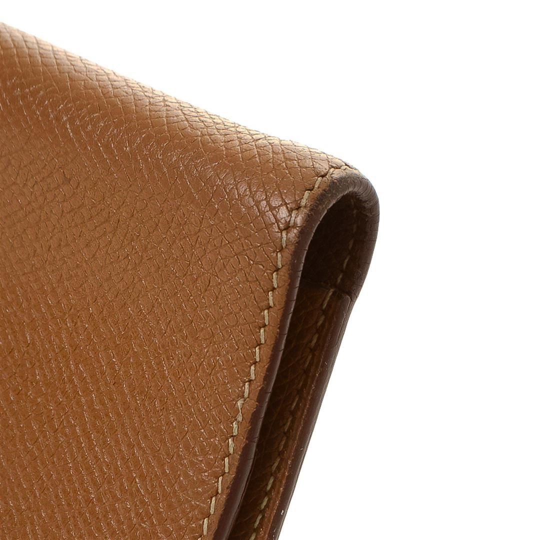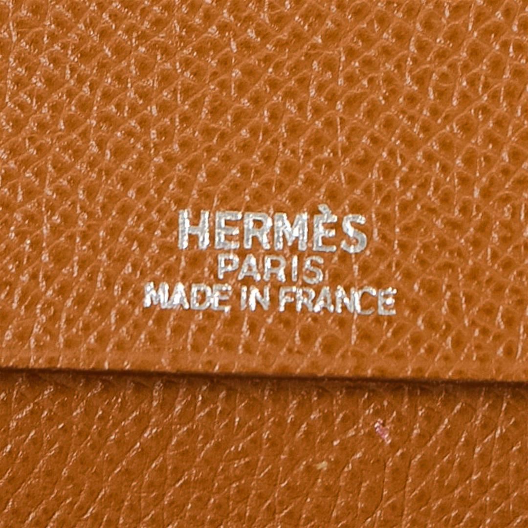 Hermes Camel Leather Flip Wallet with gold-tone hardware, brown leather trim, interior flap pockets, leather lining, bifold closure. Measurements: Length: 0.25 in / 1 cm Width: 4 in / 10 cm 7.25 in / 18 cm Condition: Pre-Owned Good overall, please see photographs for detail.