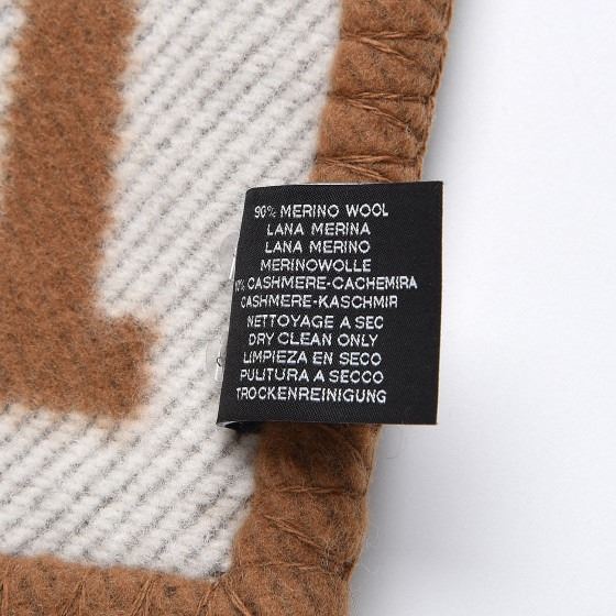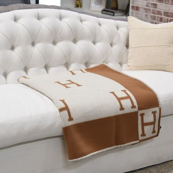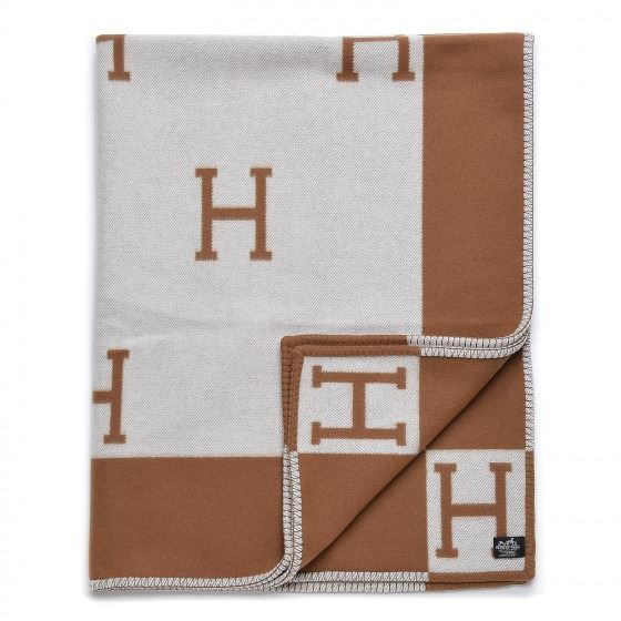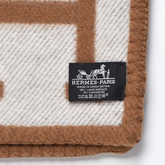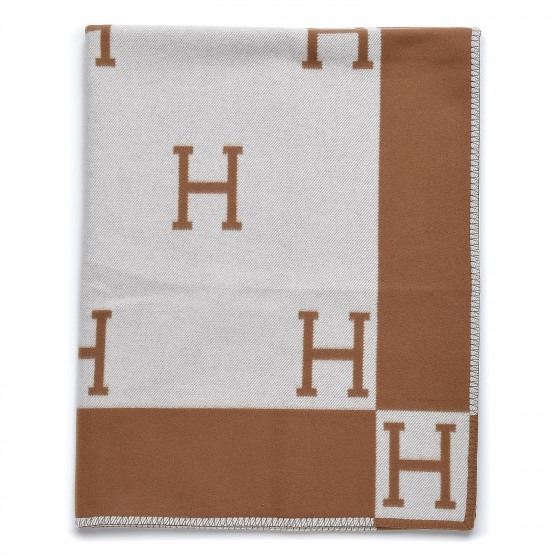 Ecru / Camel blanket in 90% wool and 10% cashmere. It is light beige and brown with iconic Hermes H logos and a stitched border.