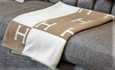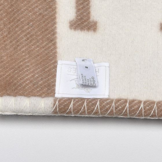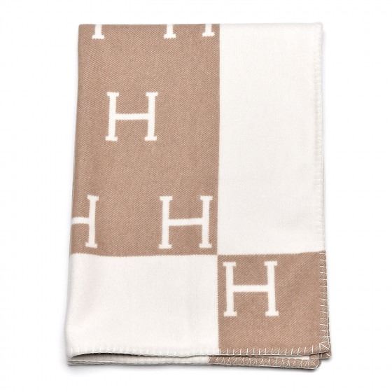 This s blanket is 90% wool and 10% cashmere. It is beige and white with iconic Hermes H logos throughout and a white stitched border.