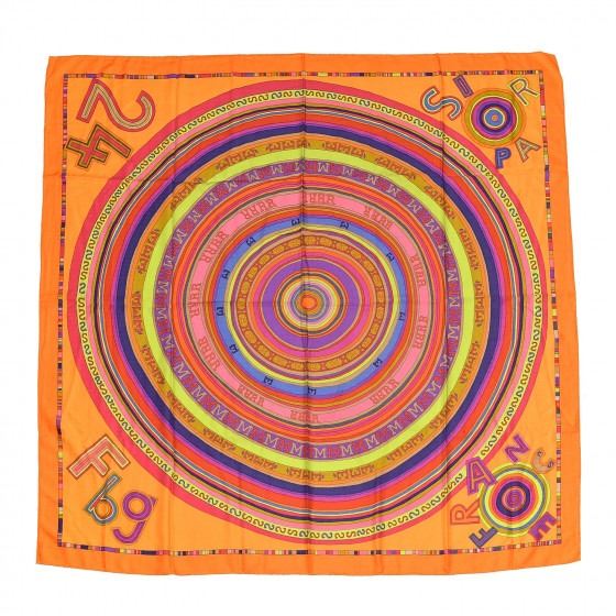 65% cashmere and 35% silk Hermes square scarf in orange that features a colorful circular graphic design of bright neon colors.