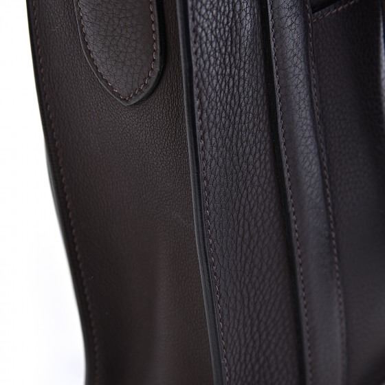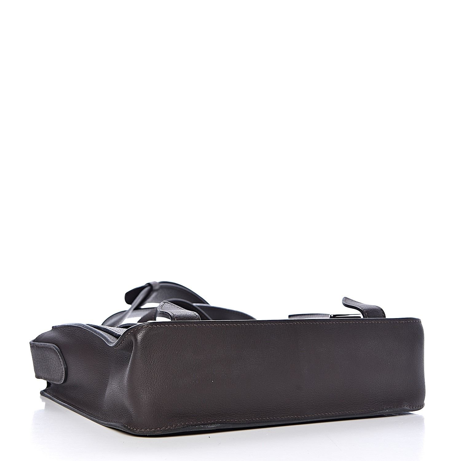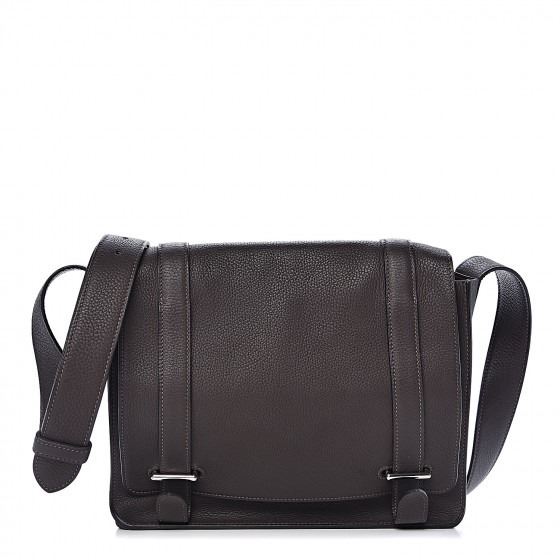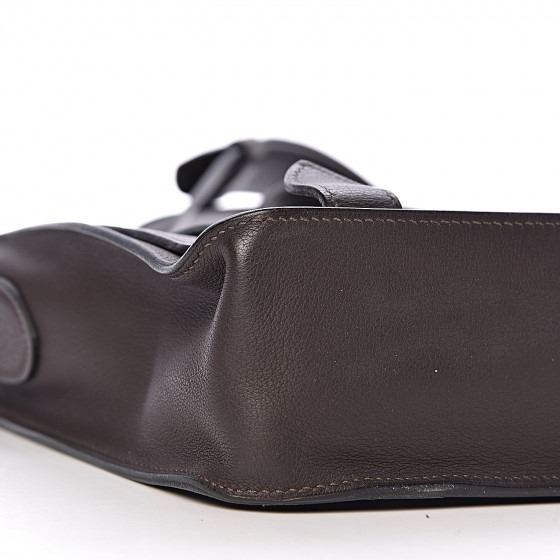Ebene shoulder bag in brown calfskin leather with an adjustable strap handle. The bag features polished palladium silver hardware and opens to a leather interior with a patch pocket.
