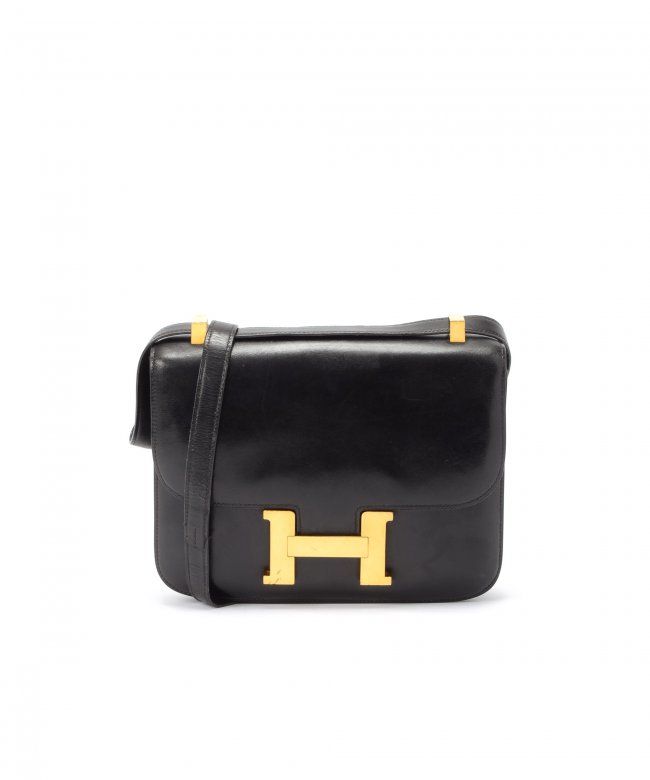 Hermes Constance (Stamp: Circle G, Gold Hardware). Black leather body, Black leather lining. Style: Box Calf. Size: 23W x 17H x 4D. Worn: Surface, Inside, Hardware, Straps, Outside Pocket. WF17985