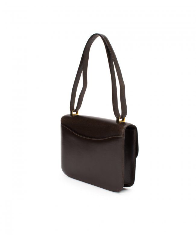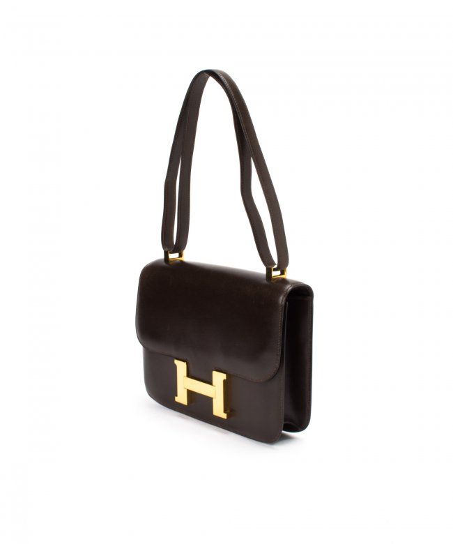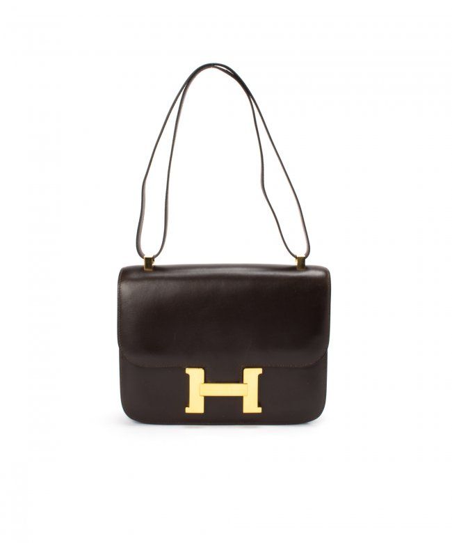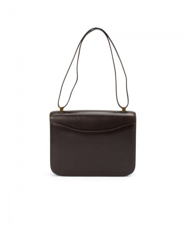 Hermes Constance (Stamp: Circle I, Gold Hardware). Faint Scratches on Hardware. Style: Box Calf. Size: 23W x 17H x 4D. Includes: Dust Bag. WF20985