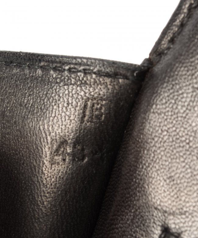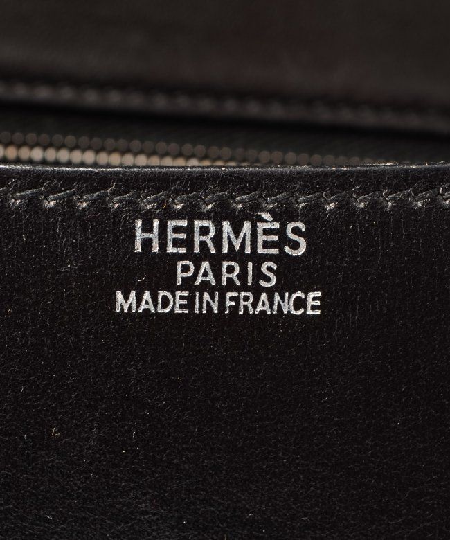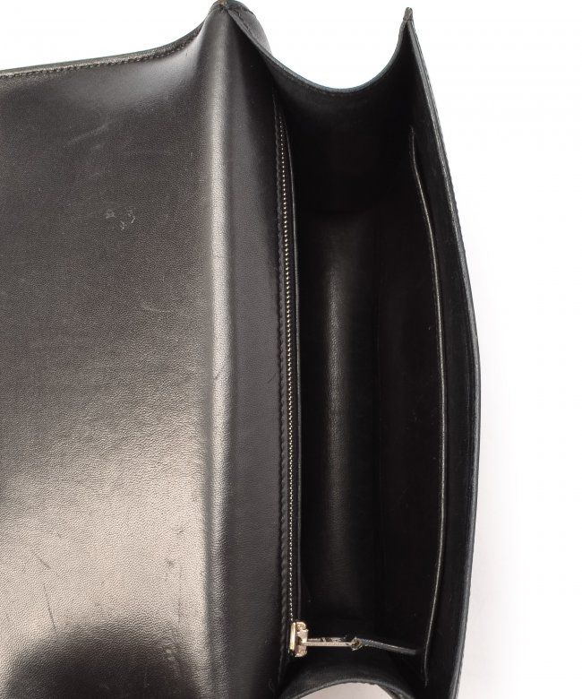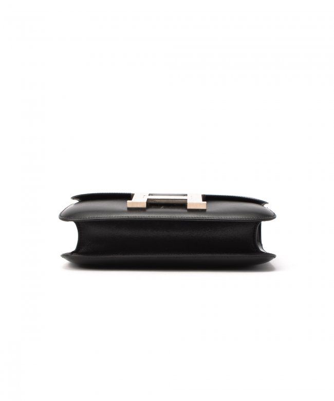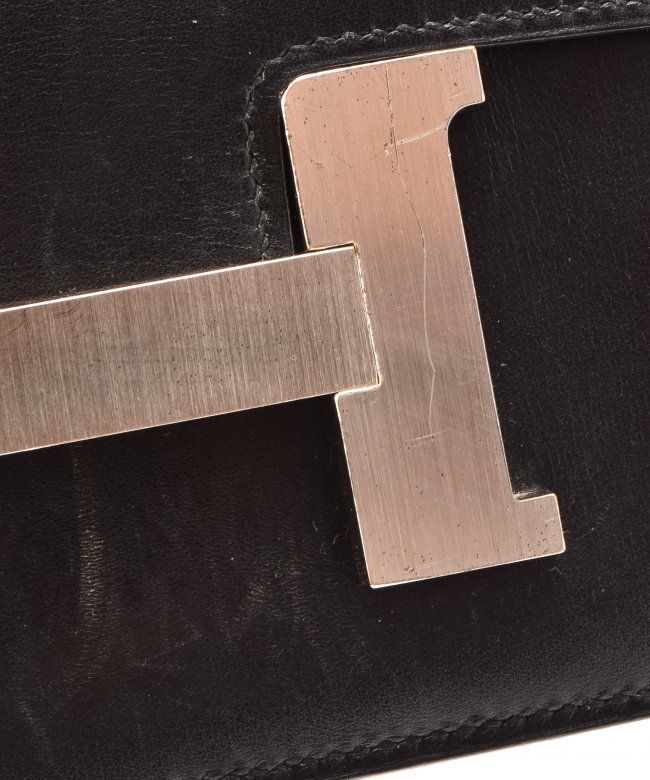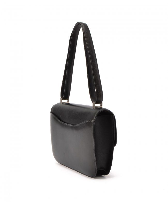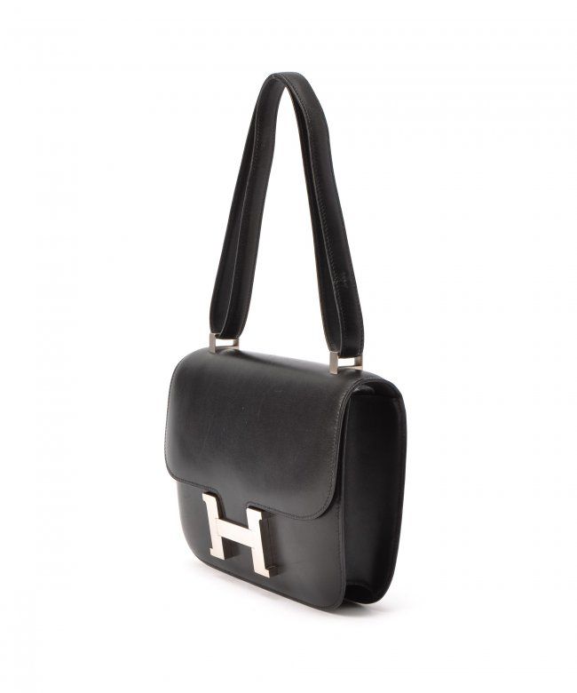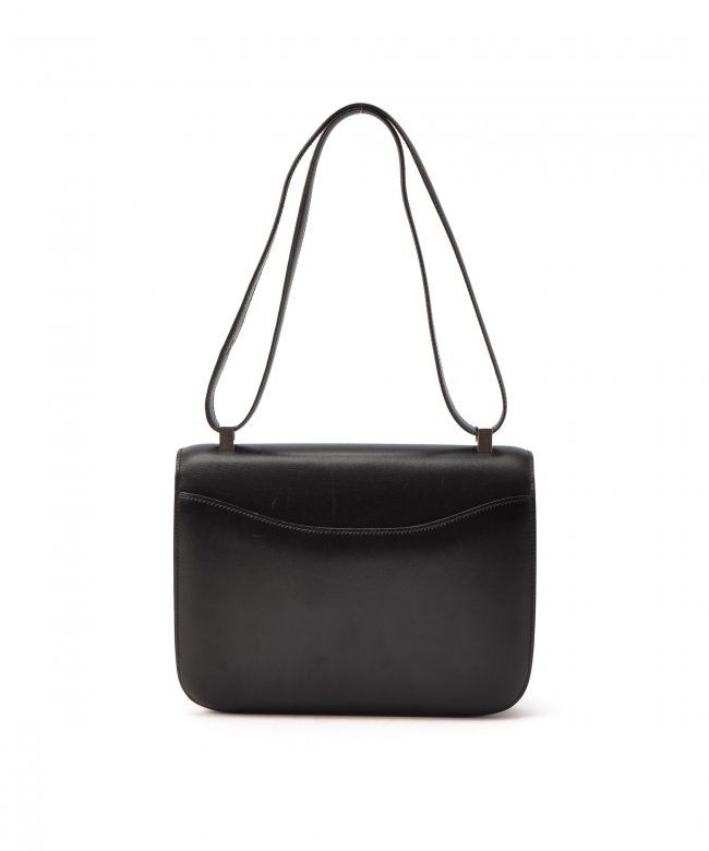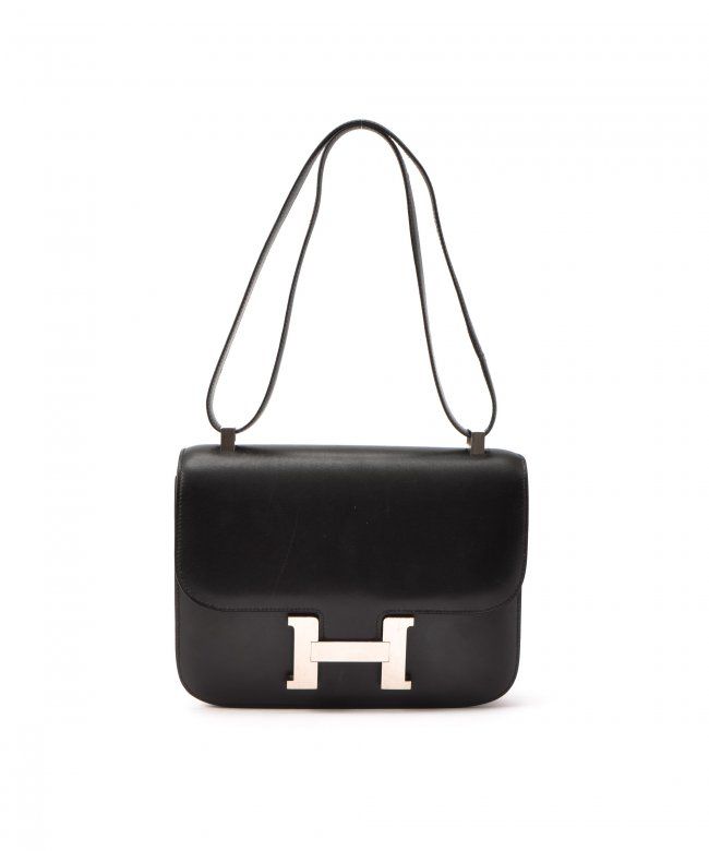 Hermes Constance (Stamp: Square B, Silver Hardware). Black leather body, Black leather lining, Indents on underside of flap, Scratch on Surface, Hardware and Inside, Worn straps. Style: Box Calf. Size: 23W x 17H x 5D. Includes: Dust Bag. WF23985