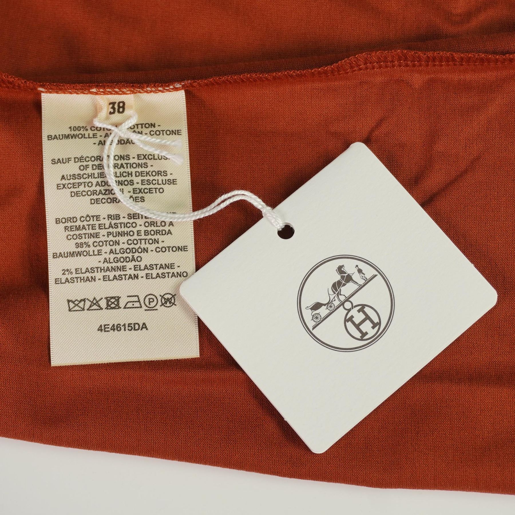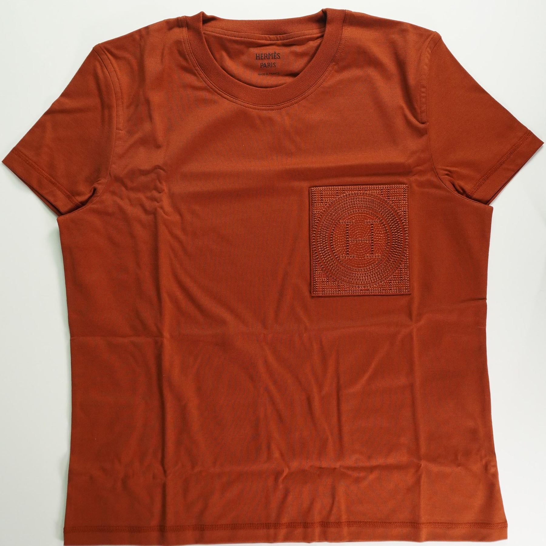 Hermes Paris straight-cut t-shirt crafted in rust-red plain cotton jersey (100% cotton), featuring a classic crewneck with rib trim. The design includes a front pocket detailed with the brand's signature "Mosaeque" embroidery, referencing the house's iconic motif. The label indicates Made in France, and the piece is size 38. Measurements are approximately 22.5"L in overall length, 19"W from underarm to underarm, 19.25"W at the waist, and 15"W across the shoulders. Includes original Hermes box and tag. This item has its original box.