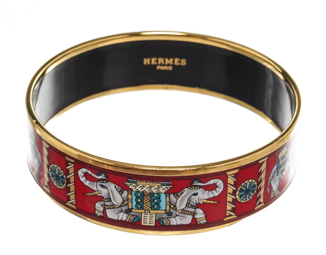 Hermes Enamel Torana Elephants Bracelet gold-tone rim, red background with elephant enamel design.