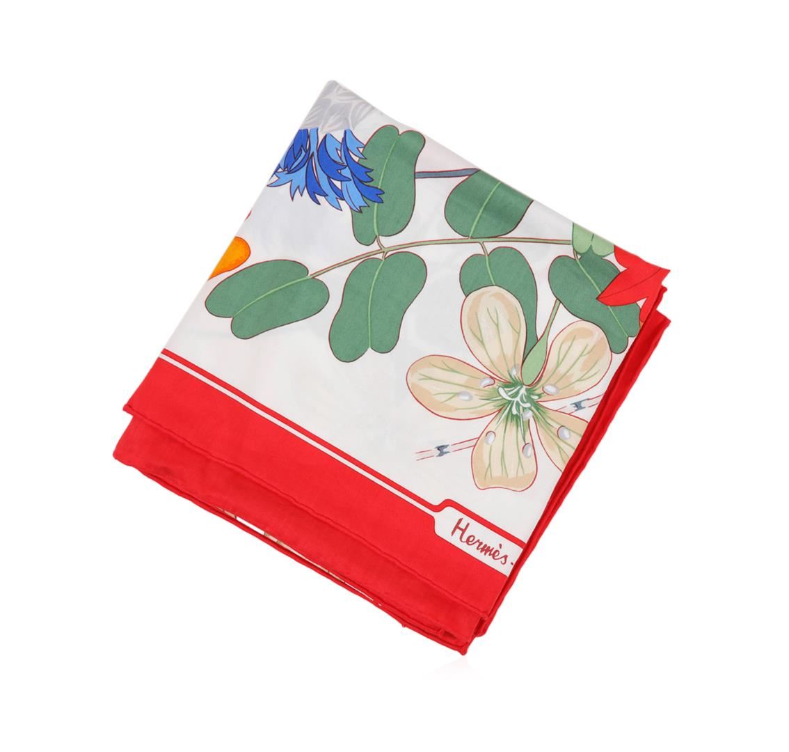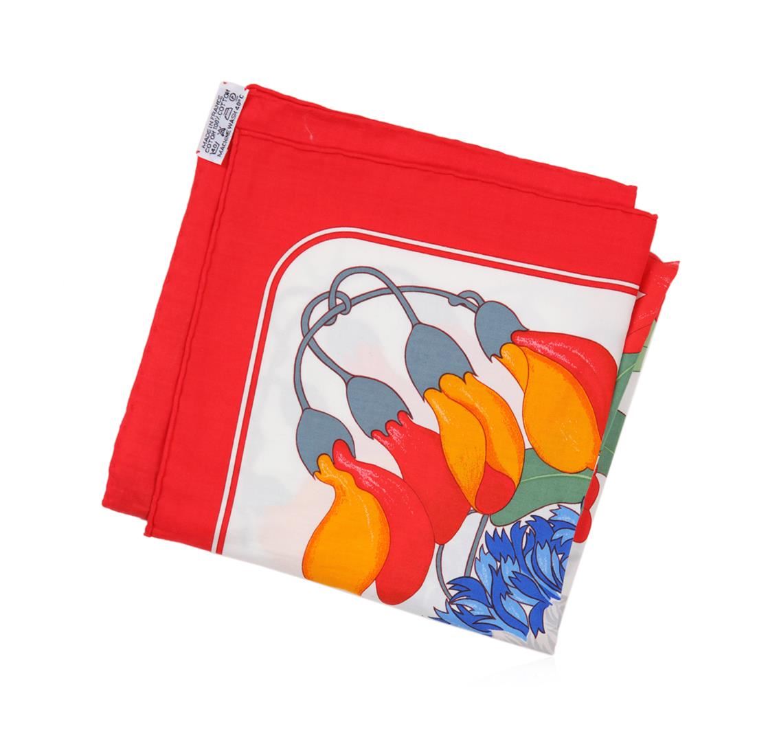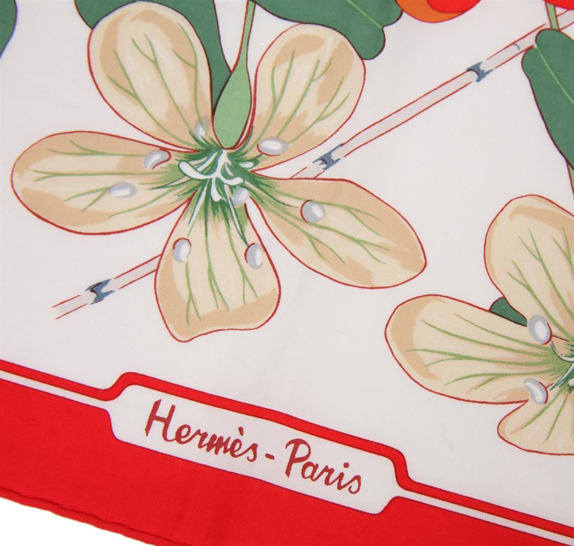 One Hermes cotton scarf in good condition, measuring 60cm by 60cm. The scarf features the 'Flora Graeca' design by Niki Goulandris. The design features vibrant flowers in orange, blue, green and red hues set against a light background and bordered with a deep red trim.