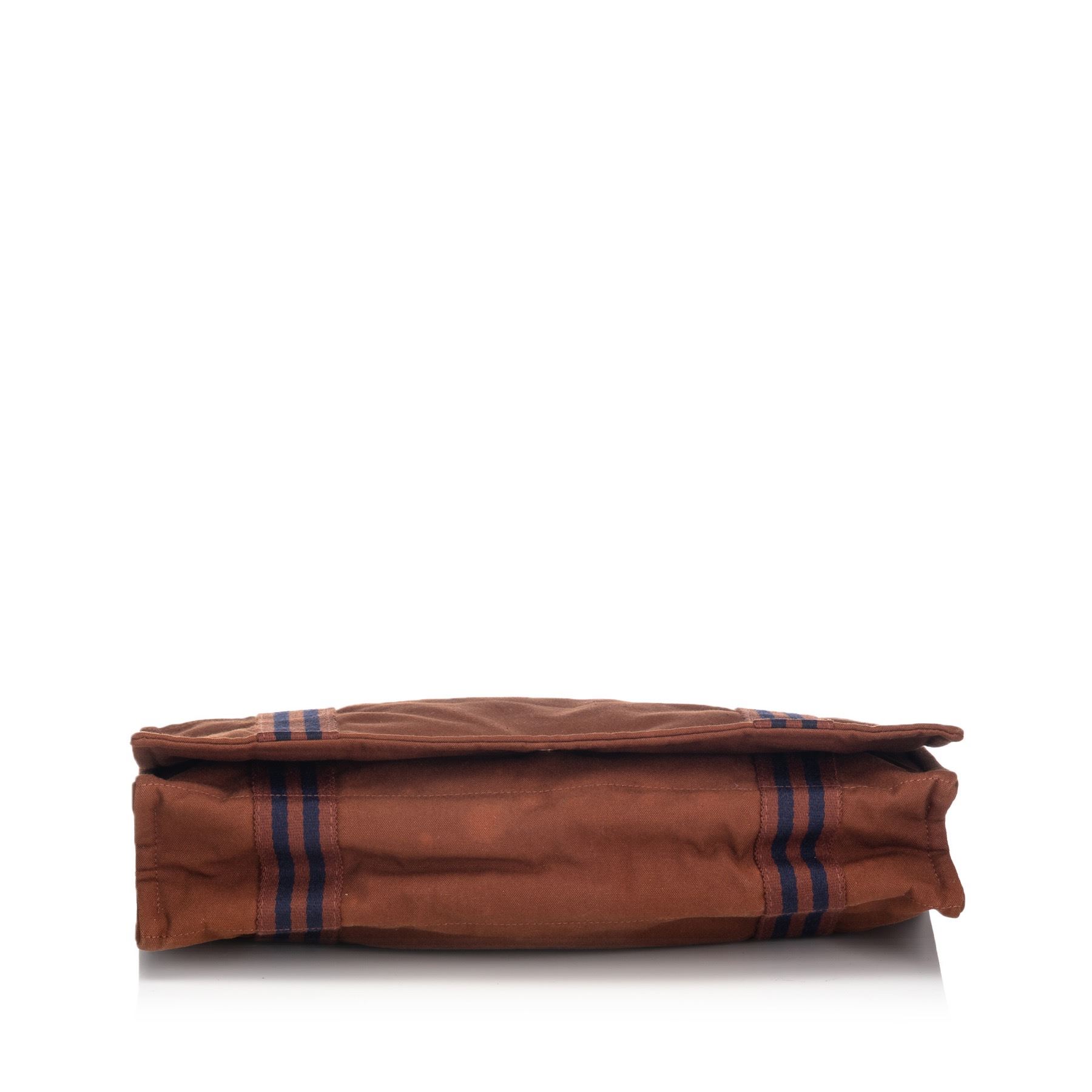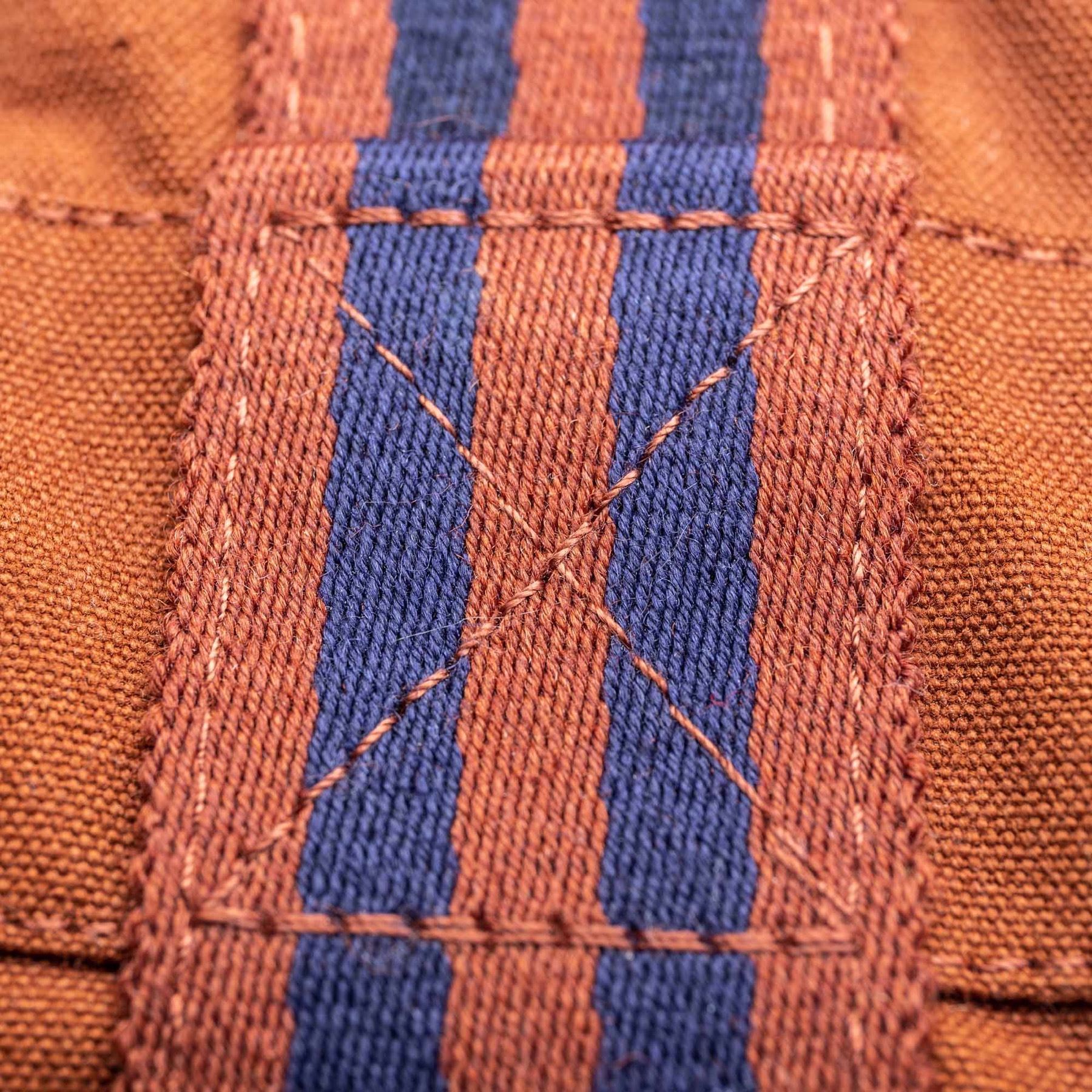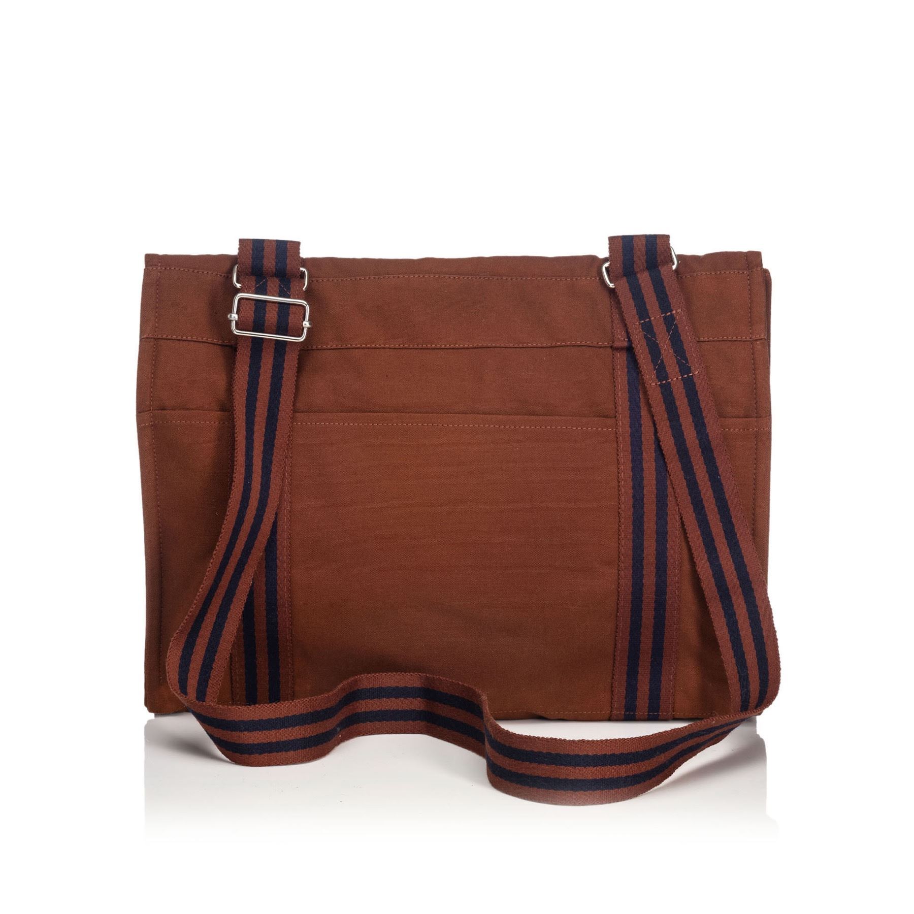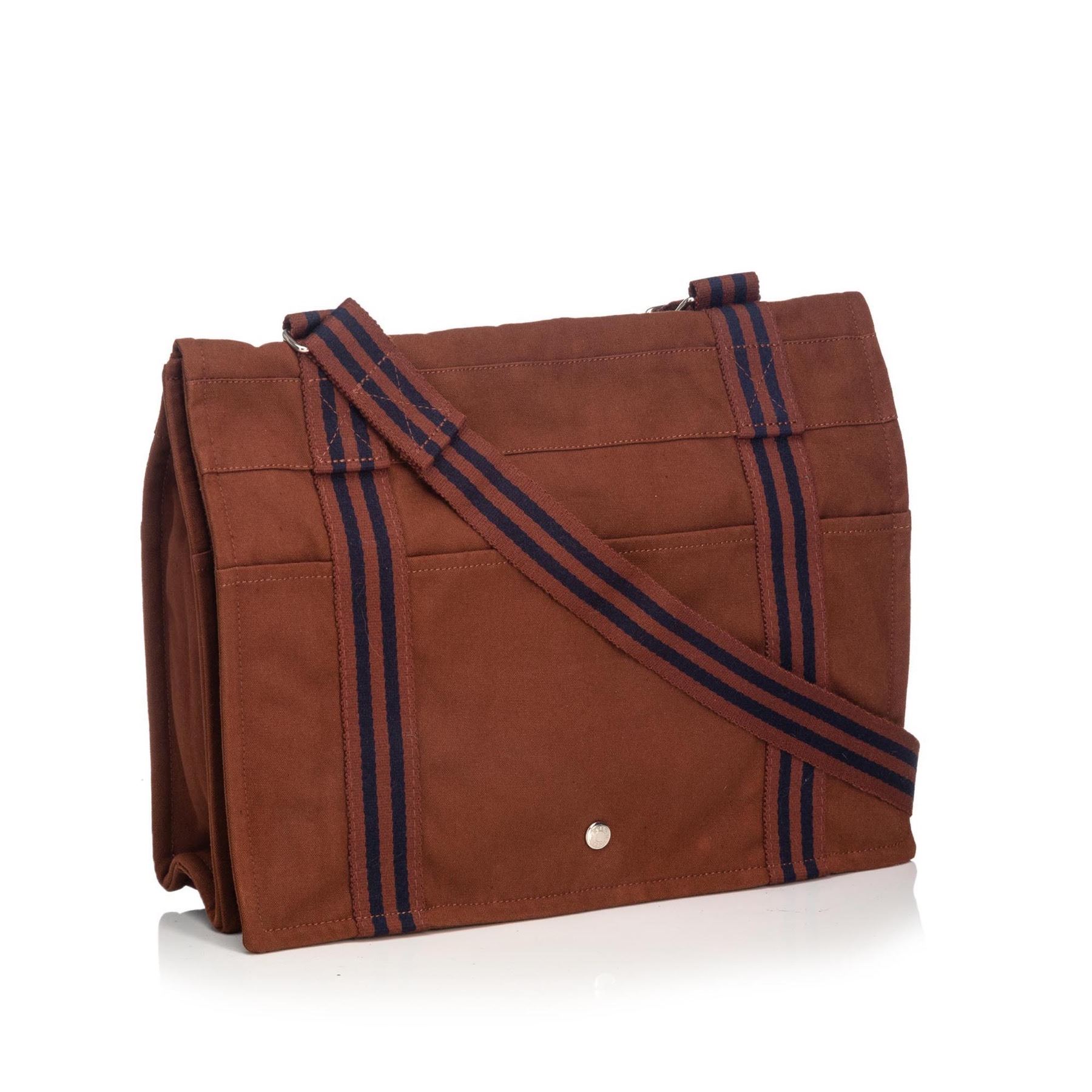The Fourre Tout Besace crossbody bag features a canvas body, back exterior slip pockets, an adjustable flat strap, a front flap with a magnetic closure, and an interior zip pocket. Fabric x Canvas Brown x Blue x Navy Size: 31 x 40.5 x 8.5 Card: NO Made in: France