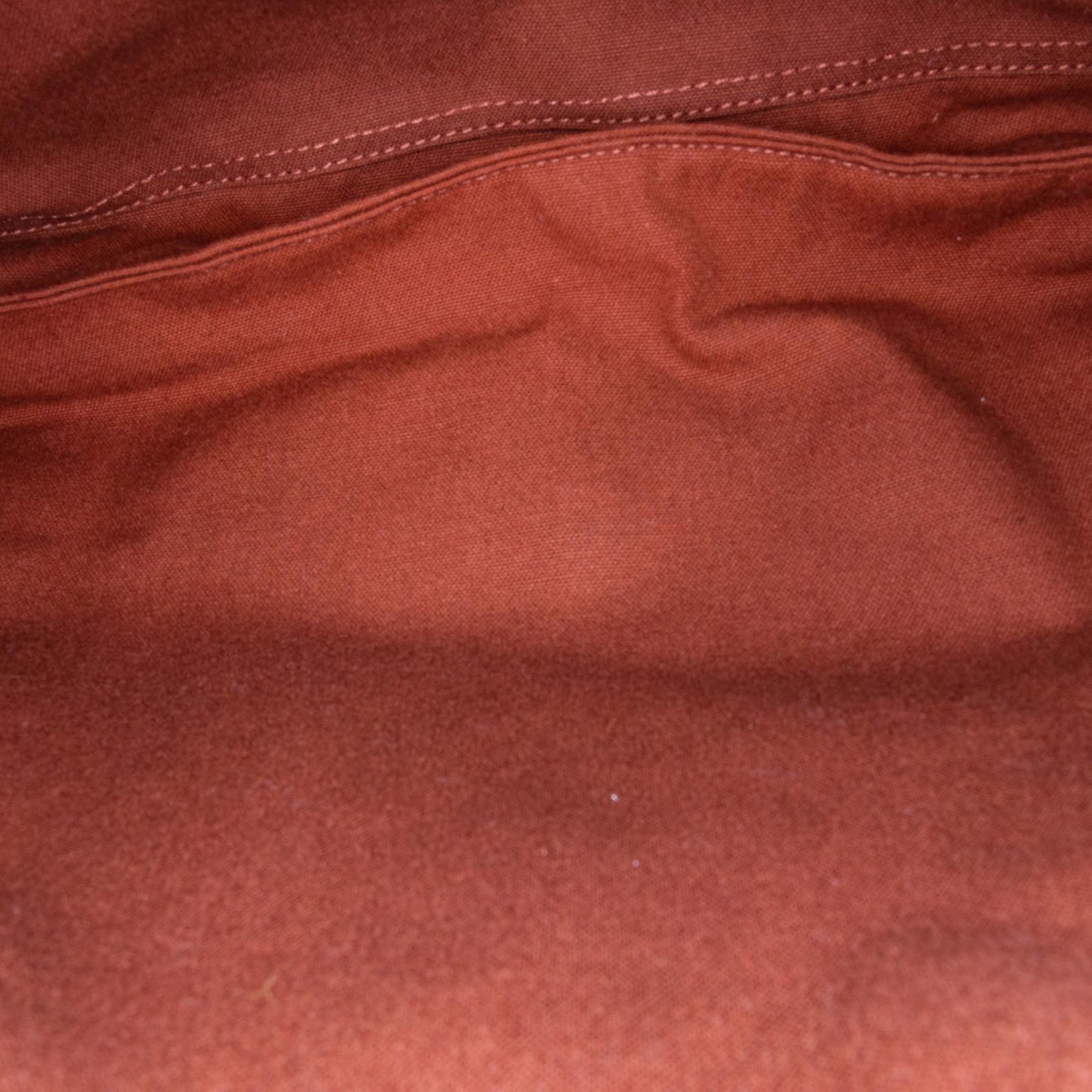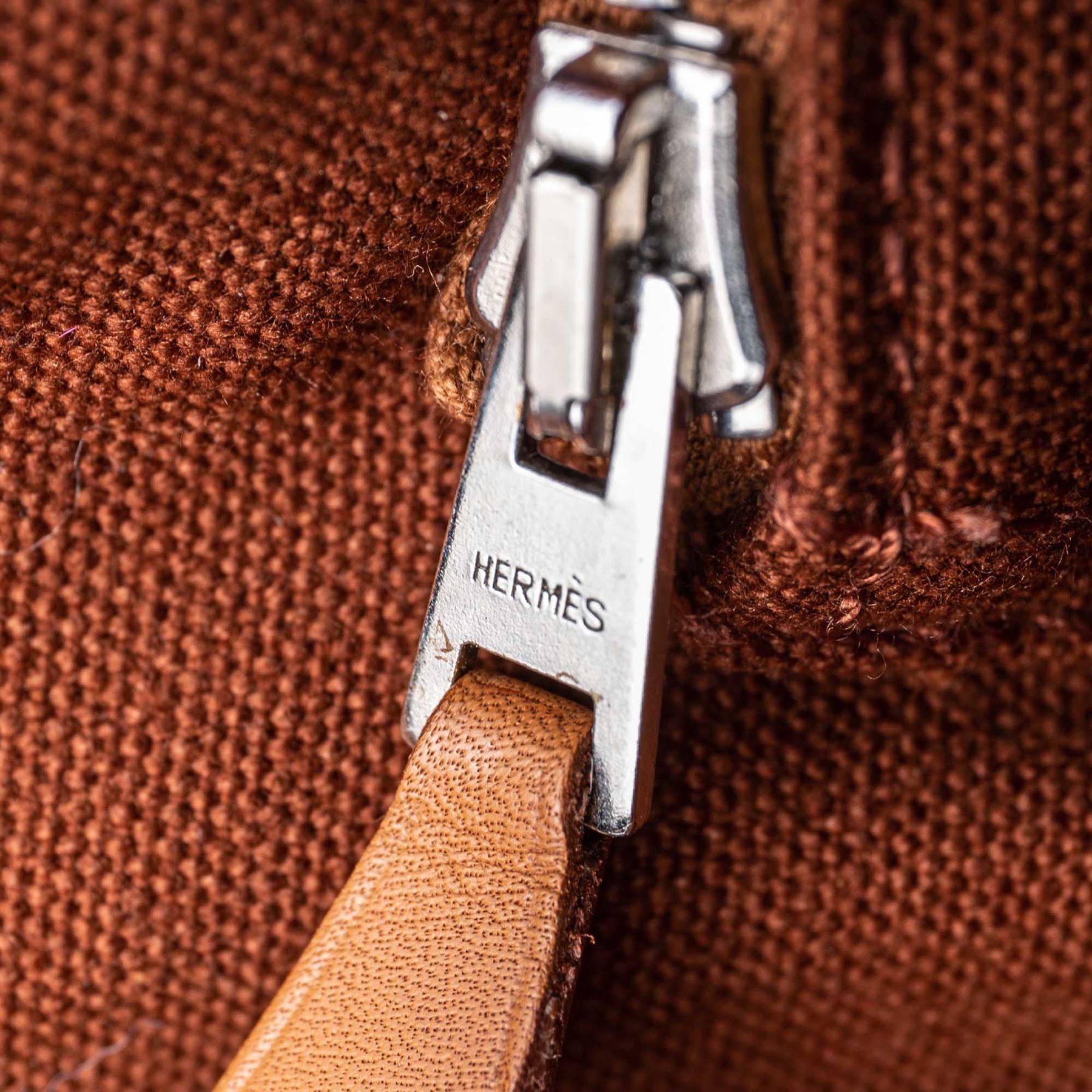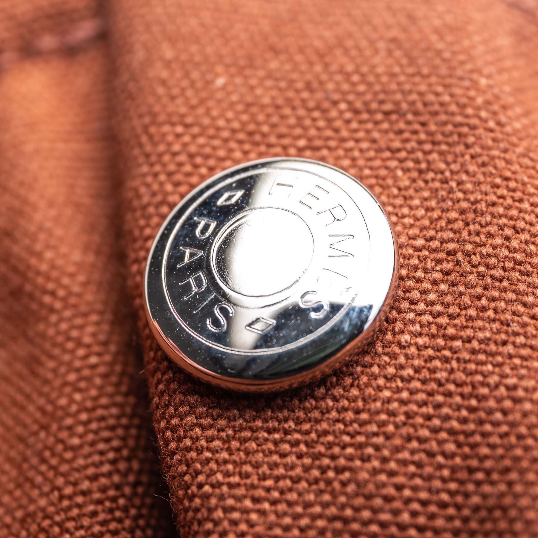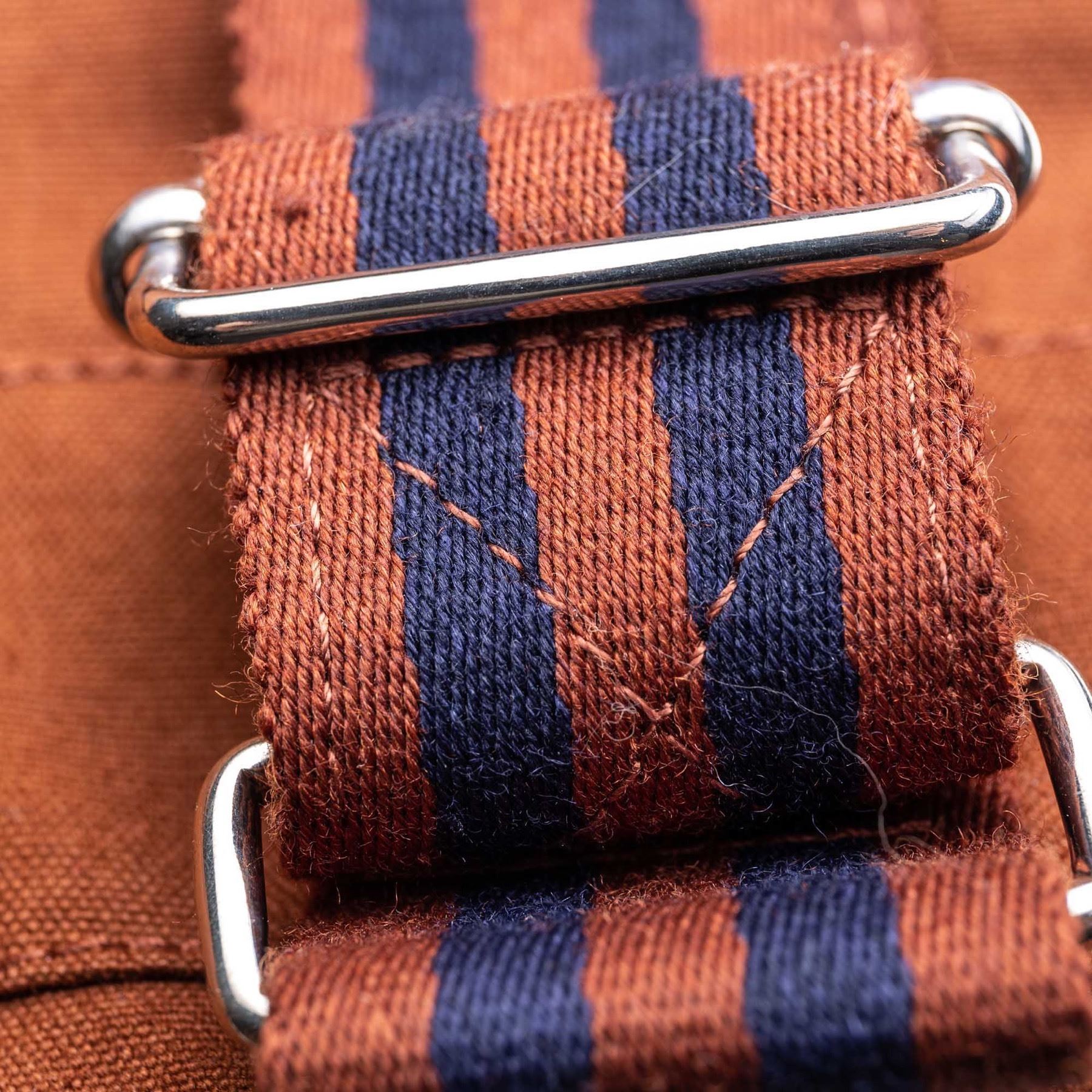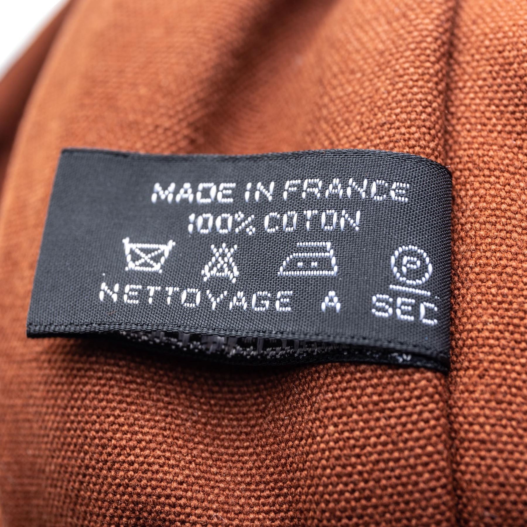 The Fourre Tout Besace crossbody bag features a canvas body, back exterior slip pockets, an adjustable flat strap, a front flap with a magnetic closure, and an interior zip pocket. Fabric x Canvas Brown x Blue x Navy Size: 31 x 40.5 x 8.5 Card: NO Made in: France