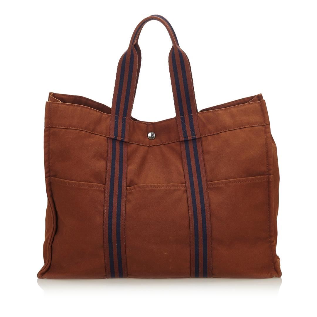 One Hermes Fourre Tout GM. The Fourre Tout GM tote features a canvas body, front and back exterior slip pockets, flat straps, an open top with a snap button closure, and an interior zip compartment.