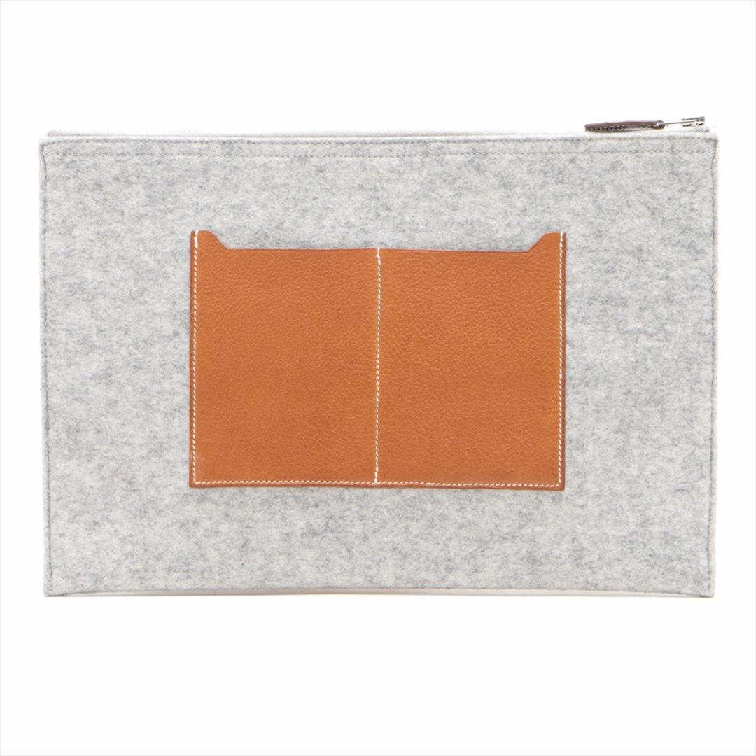 Hermes Gold Epsom Leather Wool TooDoo 37cm Clutch PHW. All available information is listed in the description and shown in the photos. Grey wool felt and Gold Epsom leather Hermes Pochette Toodoo 37 cm clutch with Palladium hardware, five slip pockets at exterior, tonal interior and zip closure at top. Height: 9.5" Width: 14.5" Depth: 0.25"