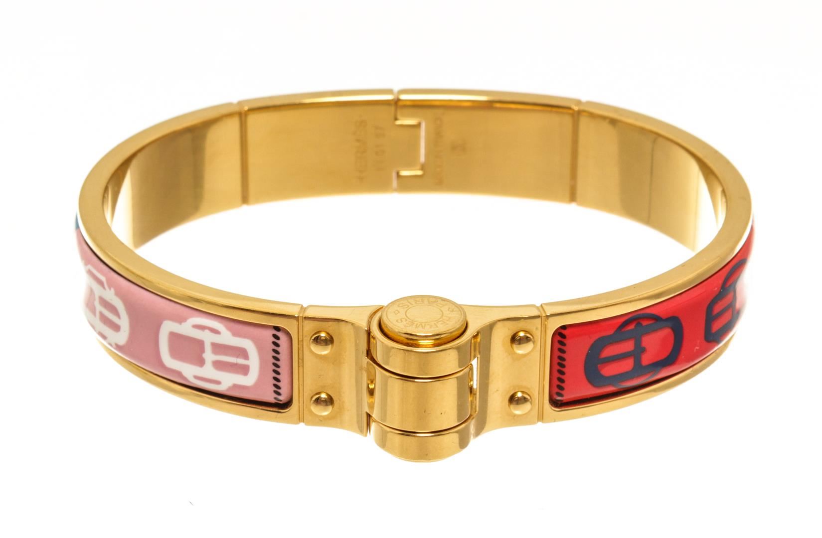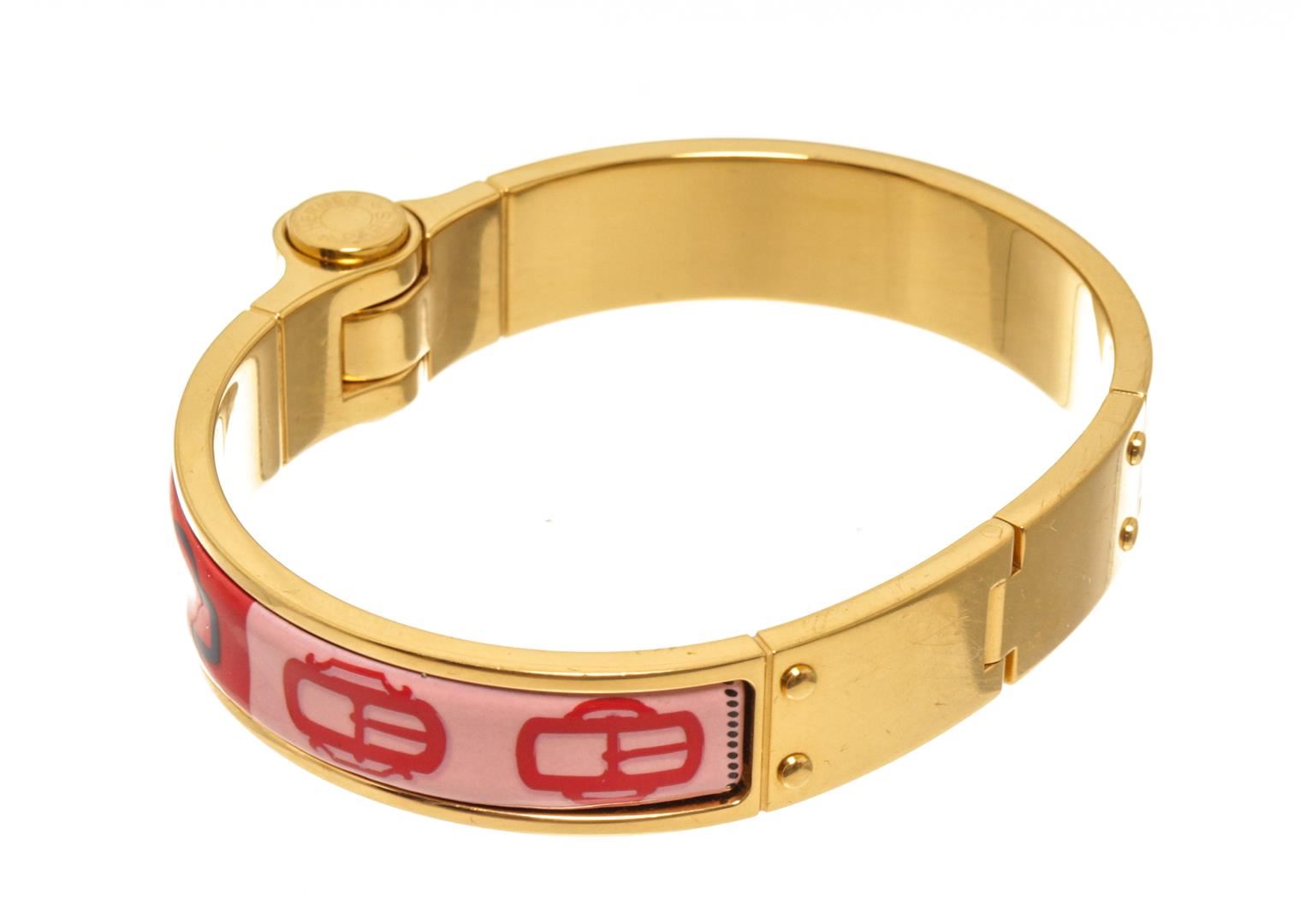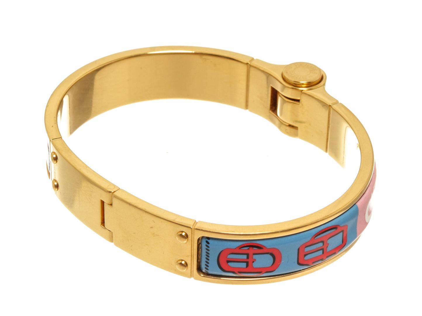 One Hermes Gold Hardware Charniere Bangle. Item is sold AS-IS. All available information is listed in the description and shown in the photo. Hermes gold hardware Charniere bangle with multicolor pattern, hinge, and a click closure.