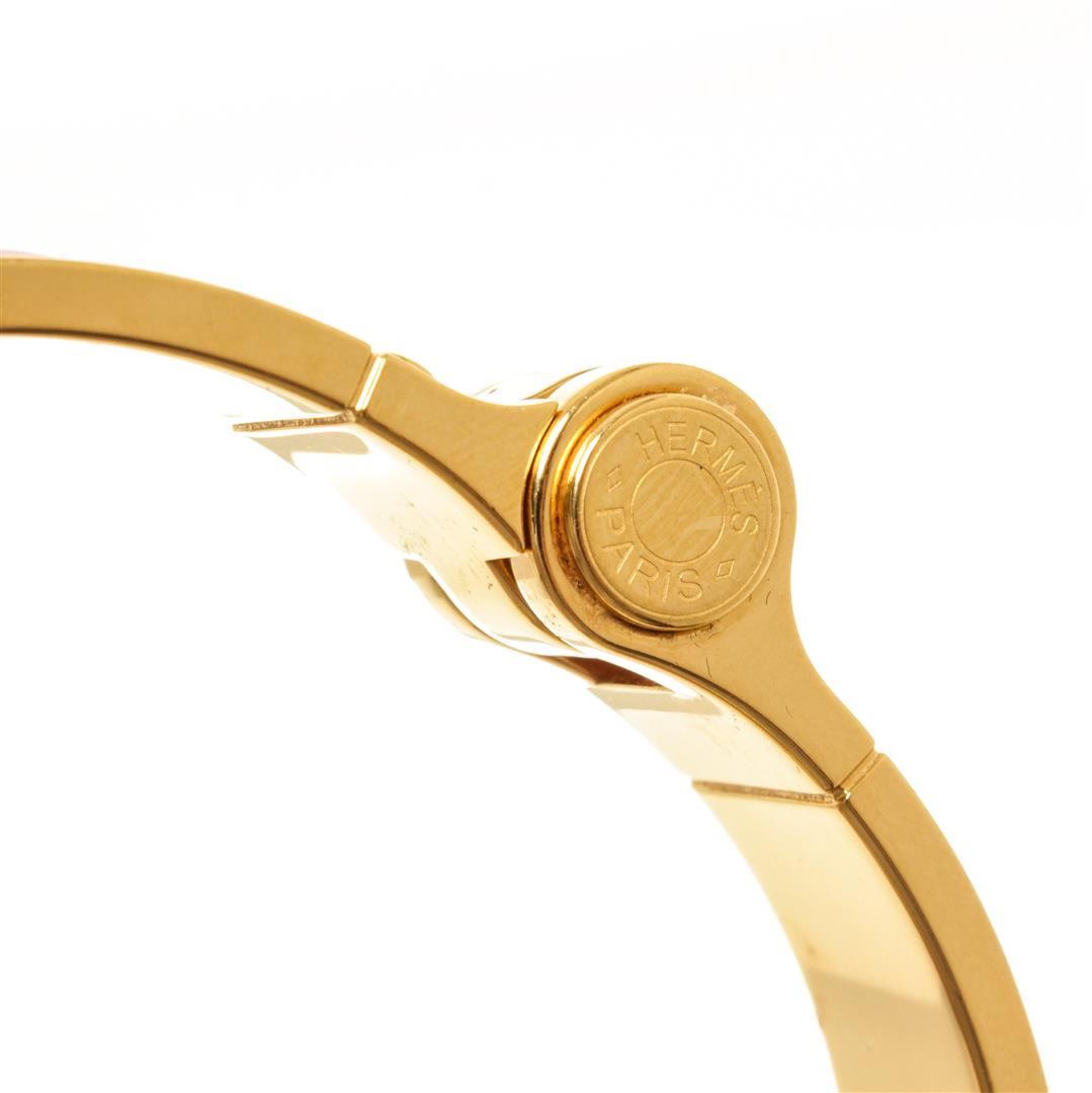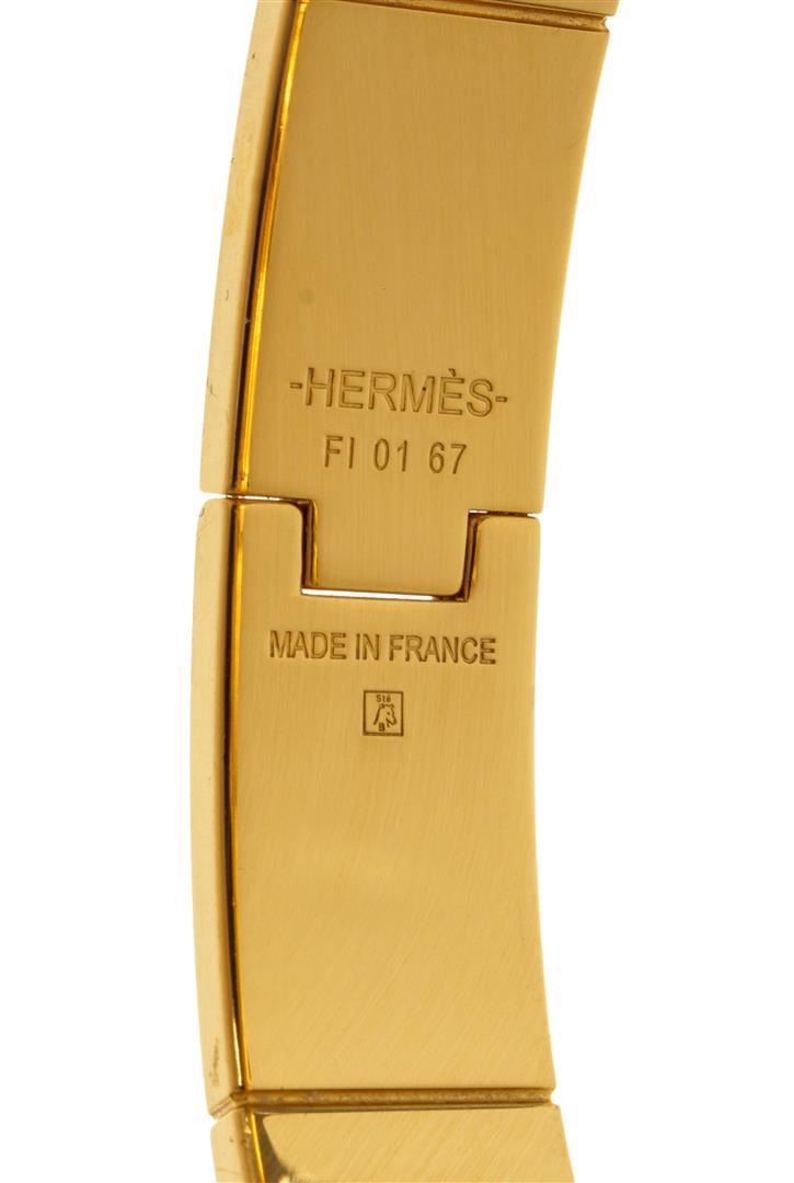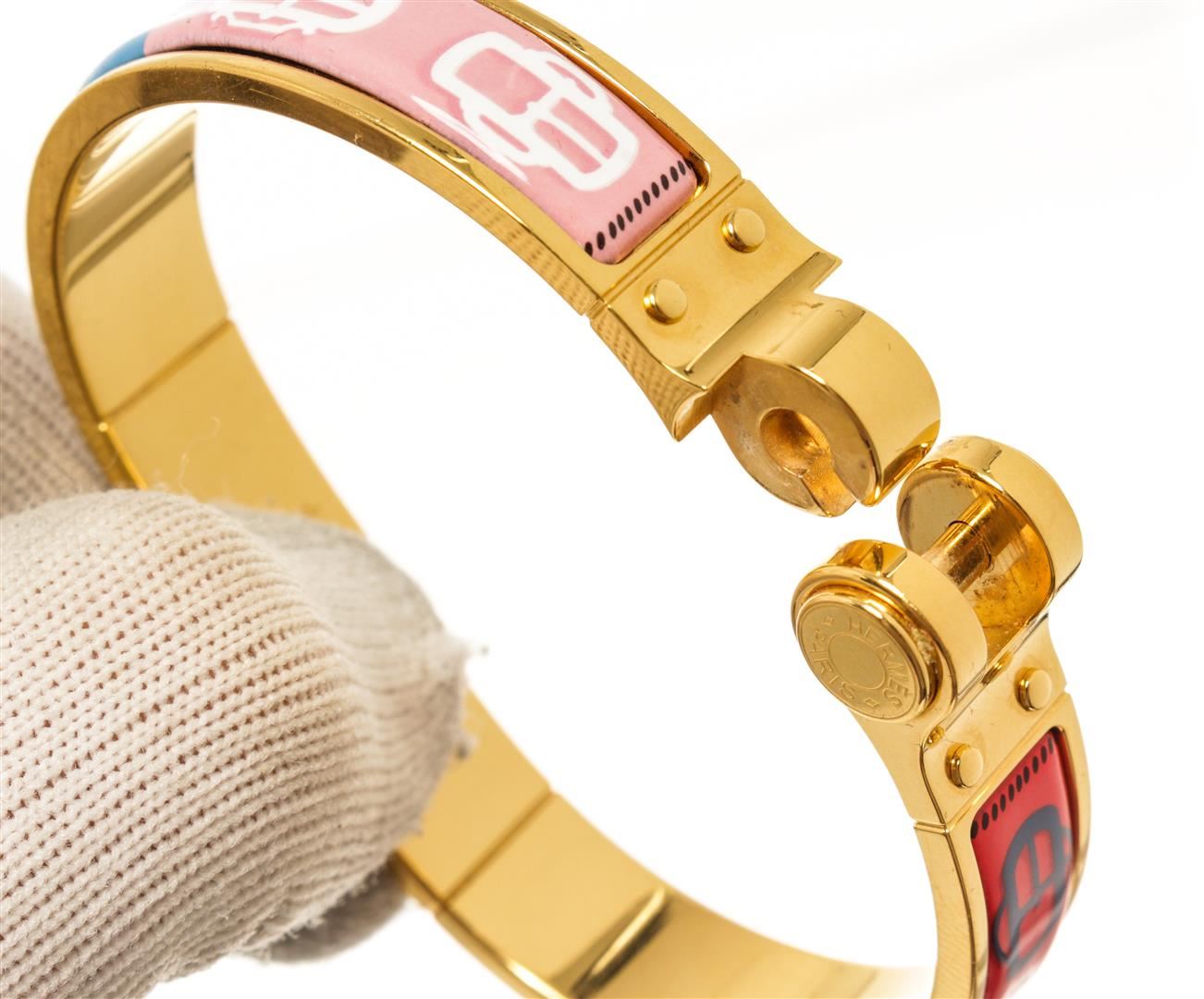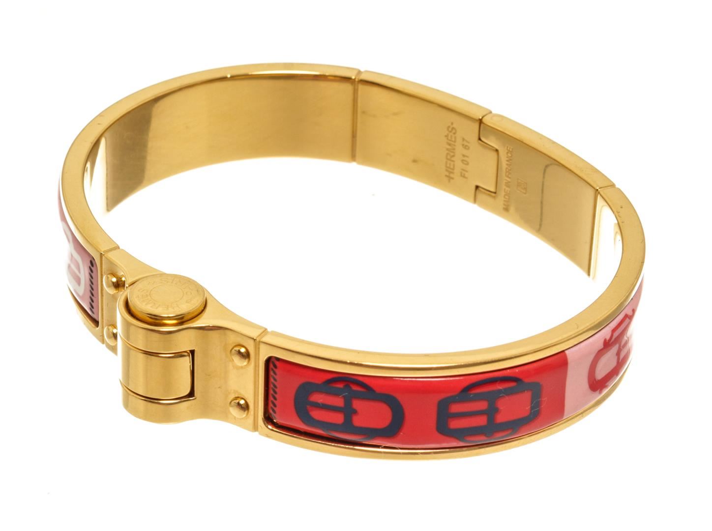 One Hermes Gold Hardware Charniere Bangle. Item is sold AS-IS. All available information is listed in the description and shown in the photo. Hermes gold hardware Charniere bangle with multicolor pattern, hinge, and a click closure.
