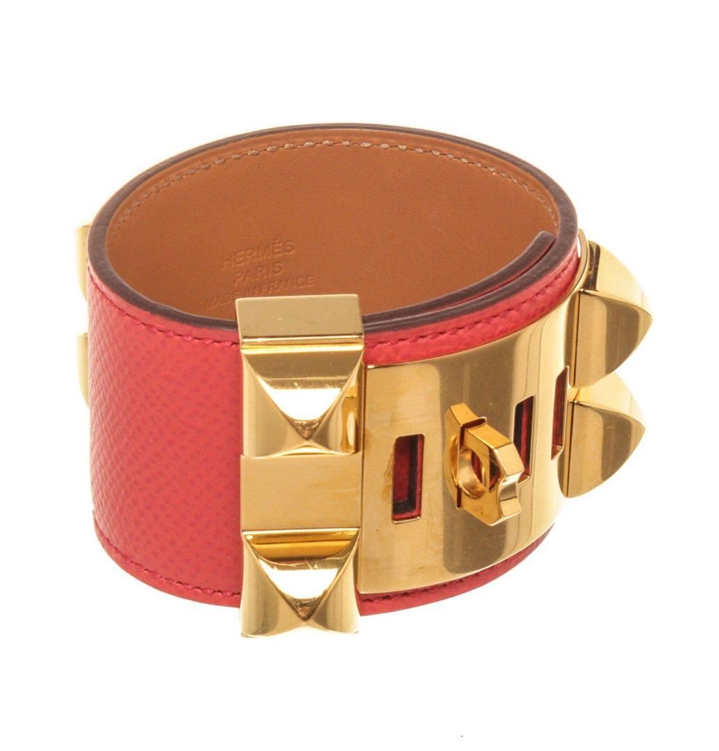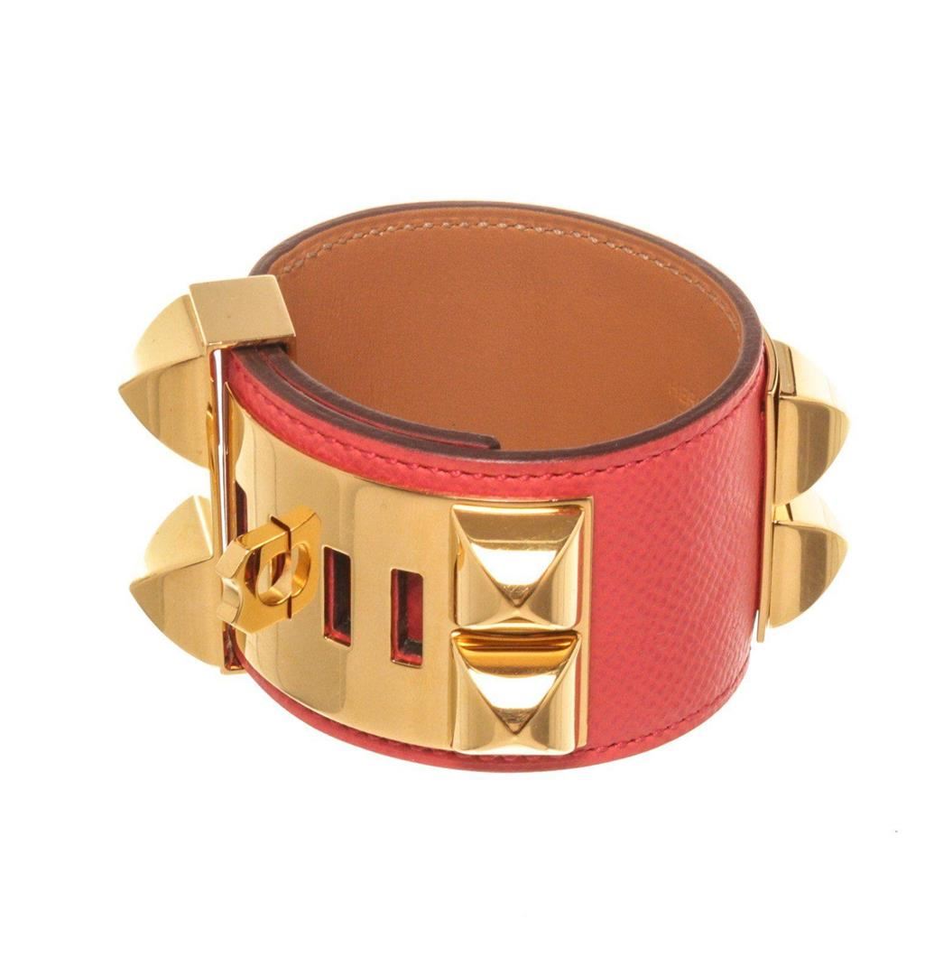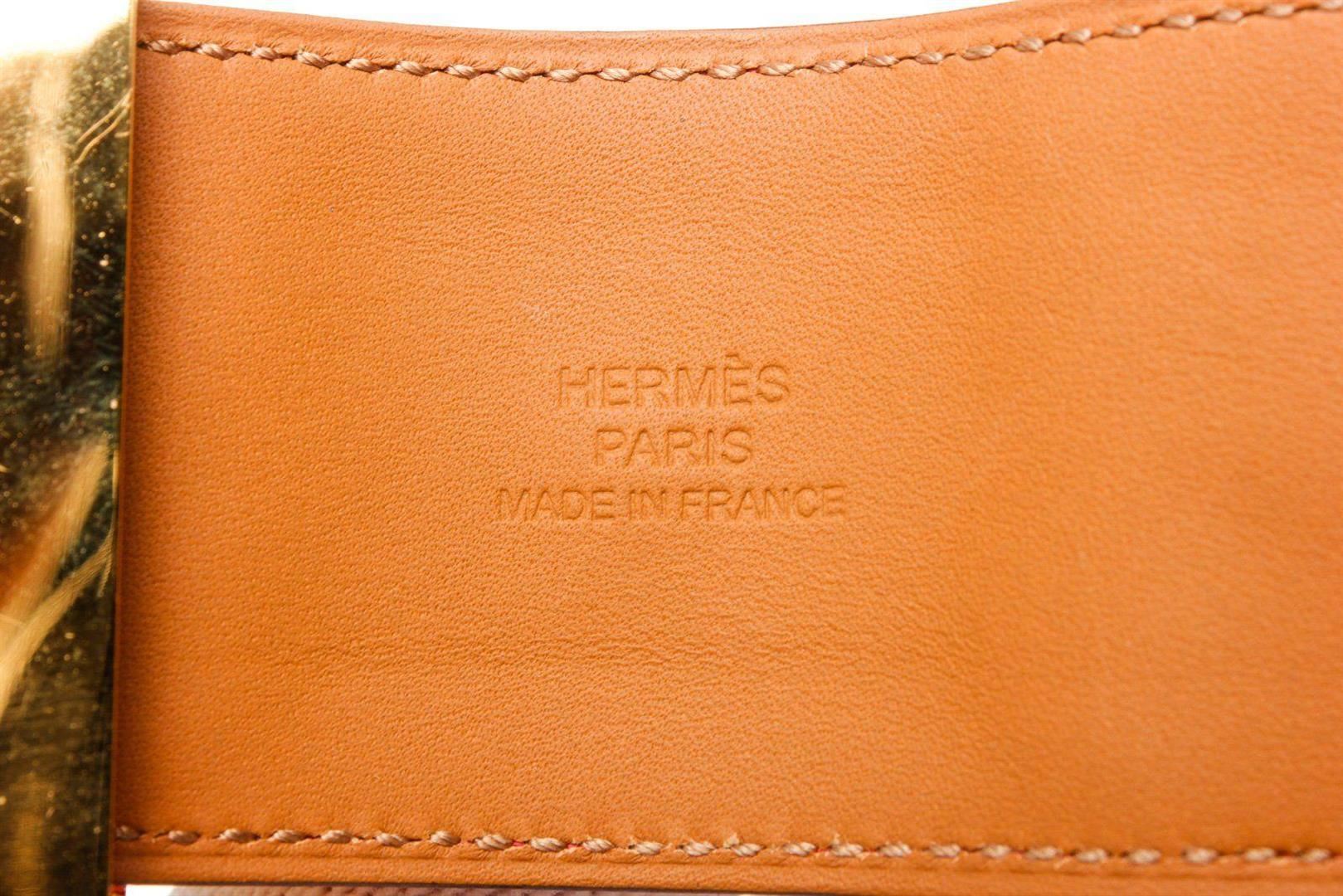 Hermes Gold Leather CDC Bracelet with gold-plated hardware and adjustable slide lock and peg-in-hole closures.