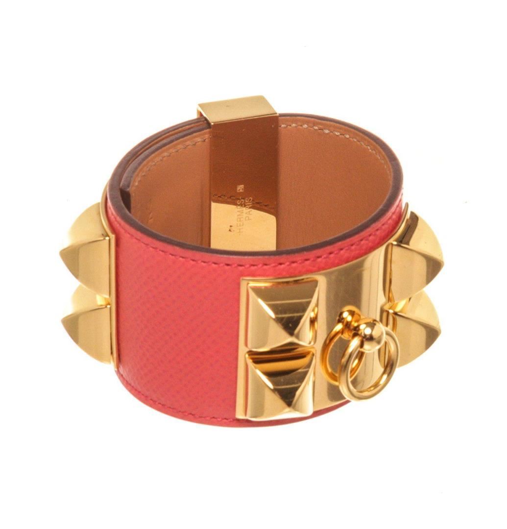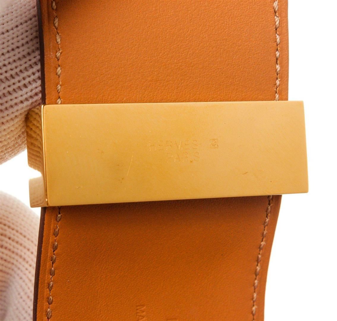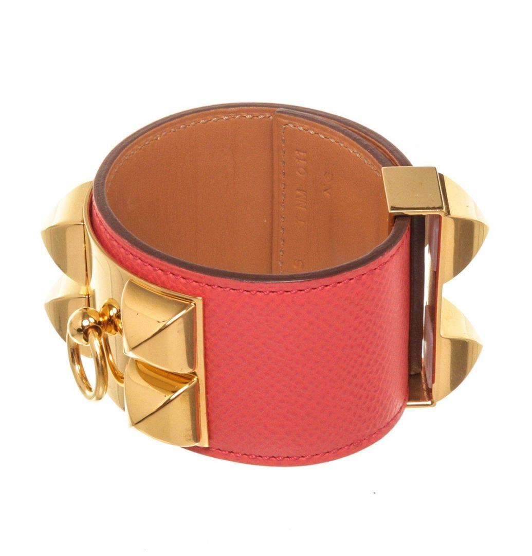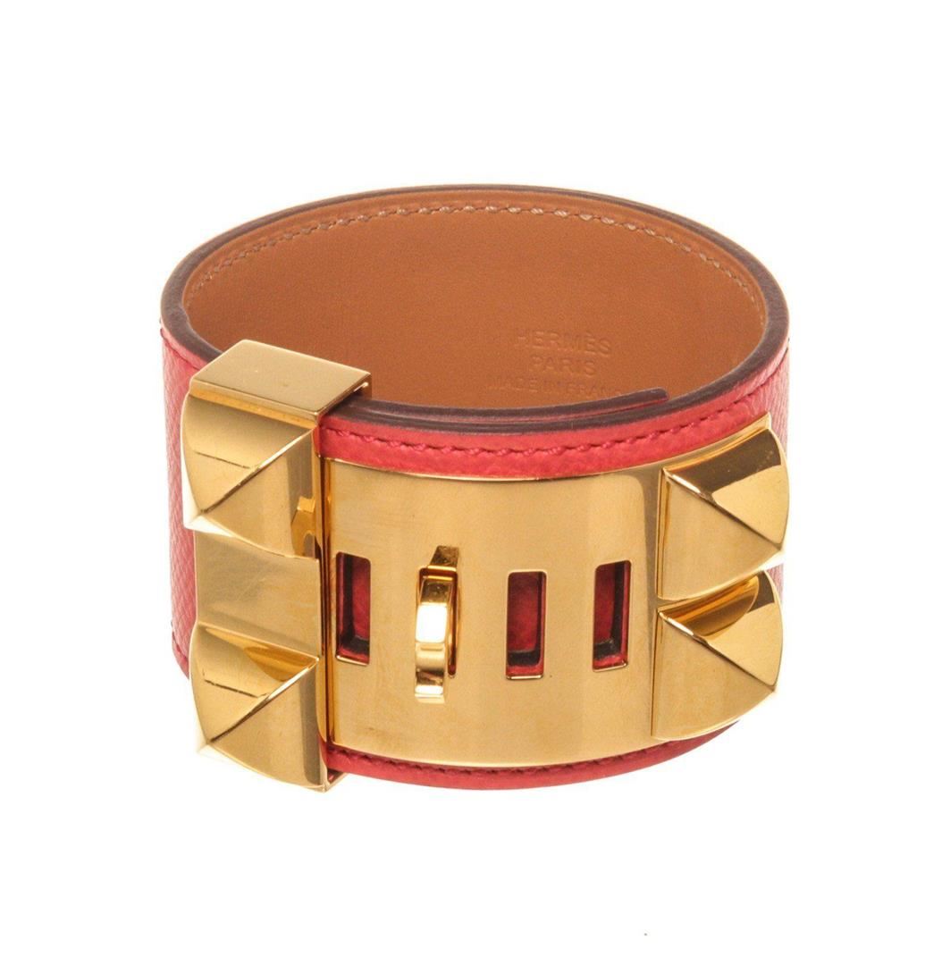 Hermes Gold Leather CDC Bracelet with gold-plated hardware and adjustable slide lock and peg-in-hole closures.