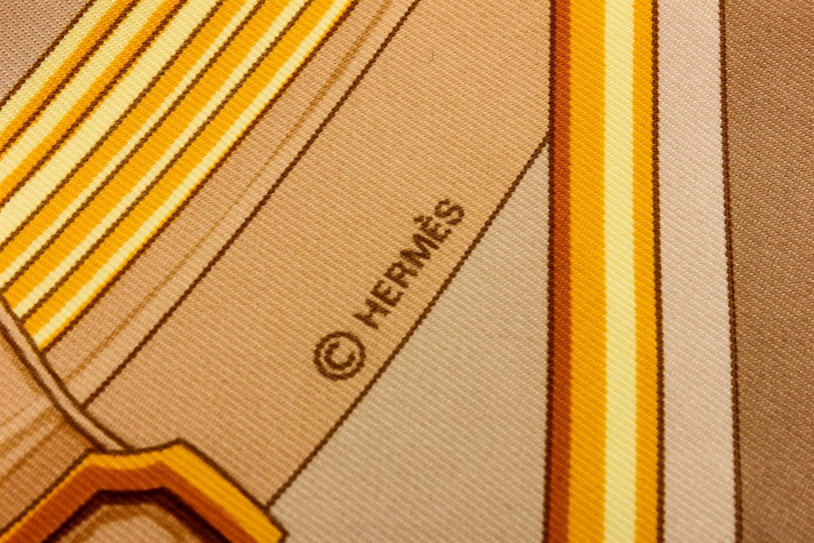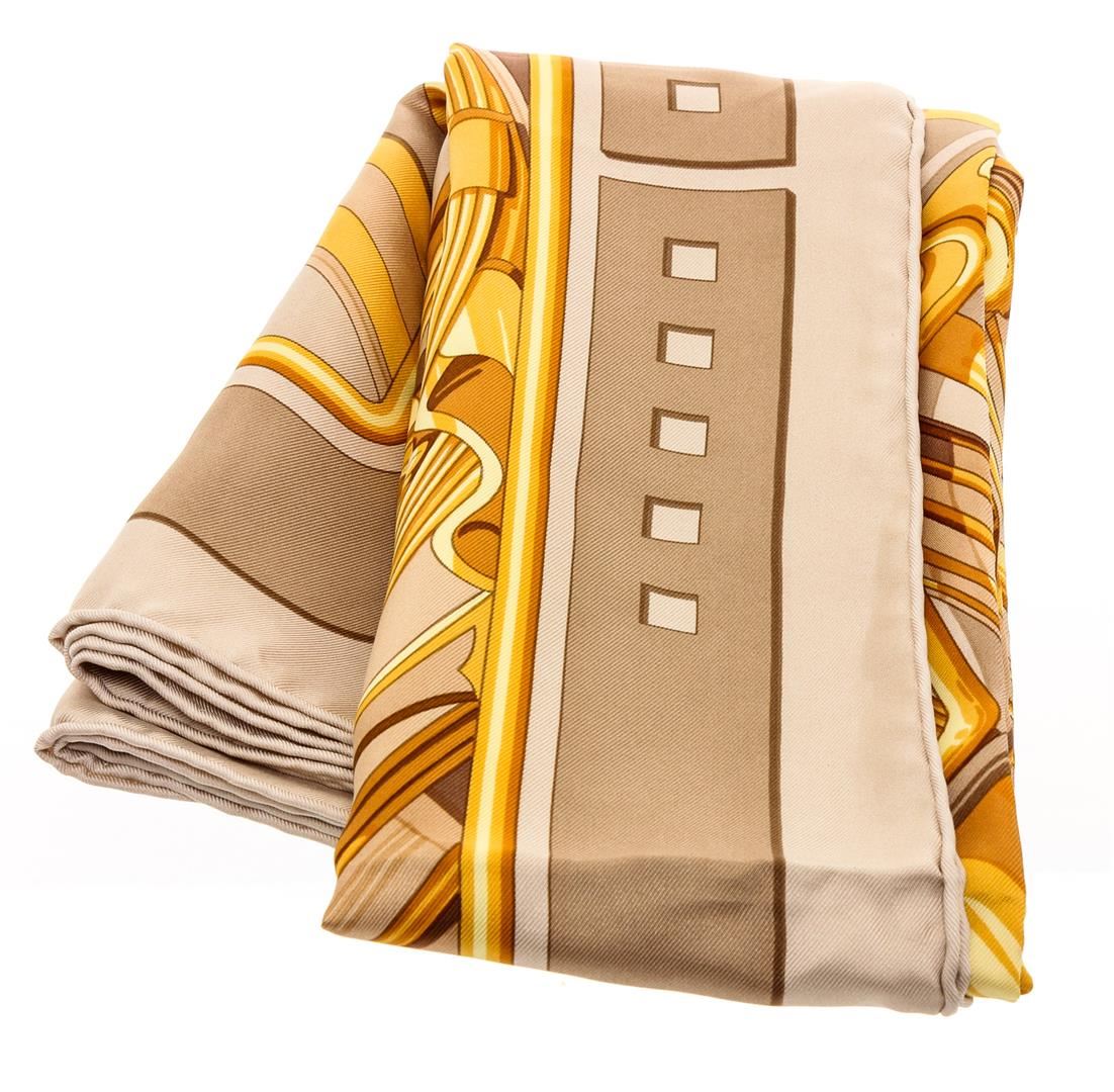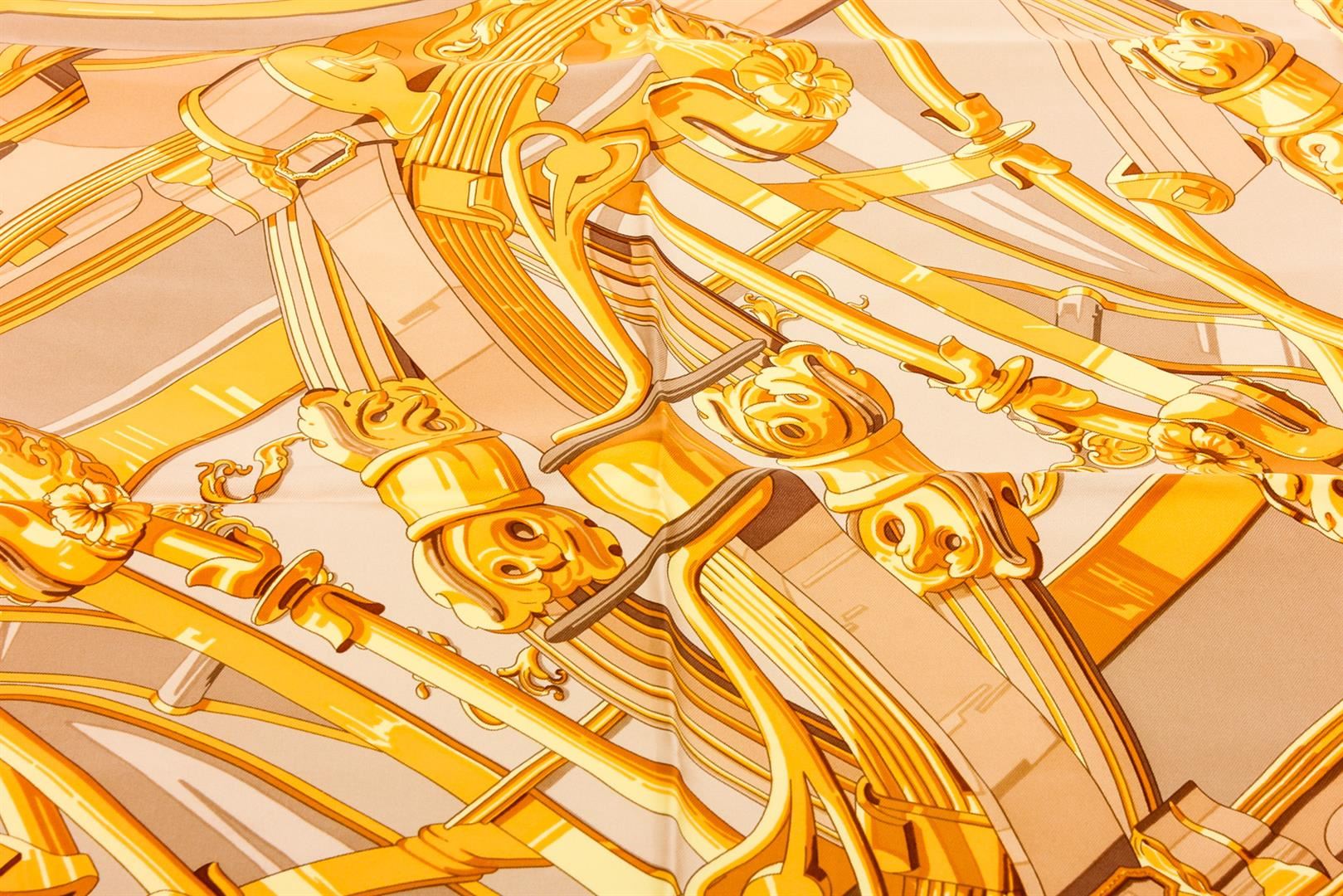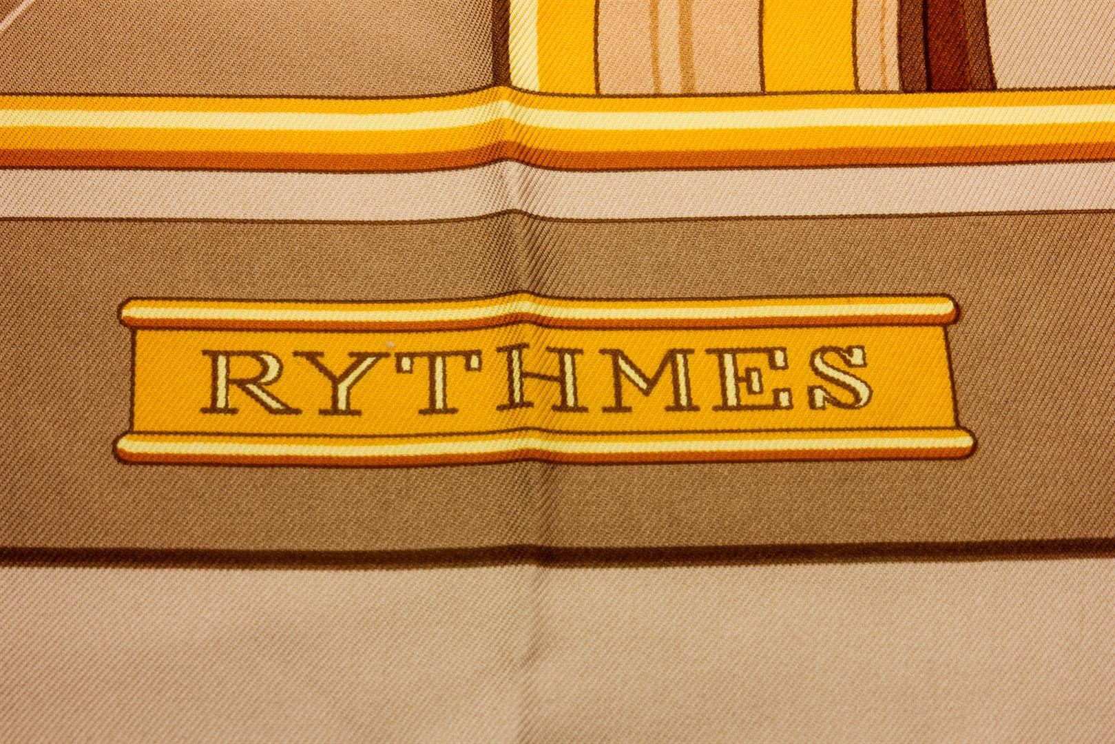 One Hermes Gold Multicolor Rythmes Silk Scarf. Gold and multicolor Hermès silk scarf with 'Rythmes' motif throughout and hand-rolled edges.