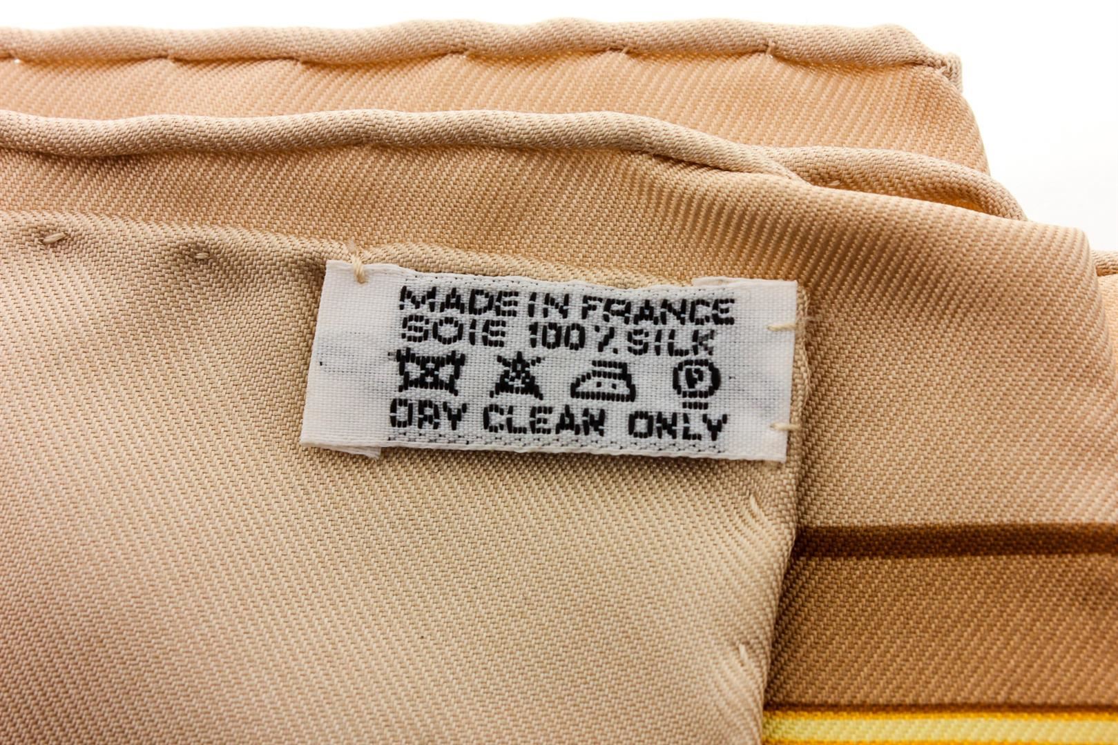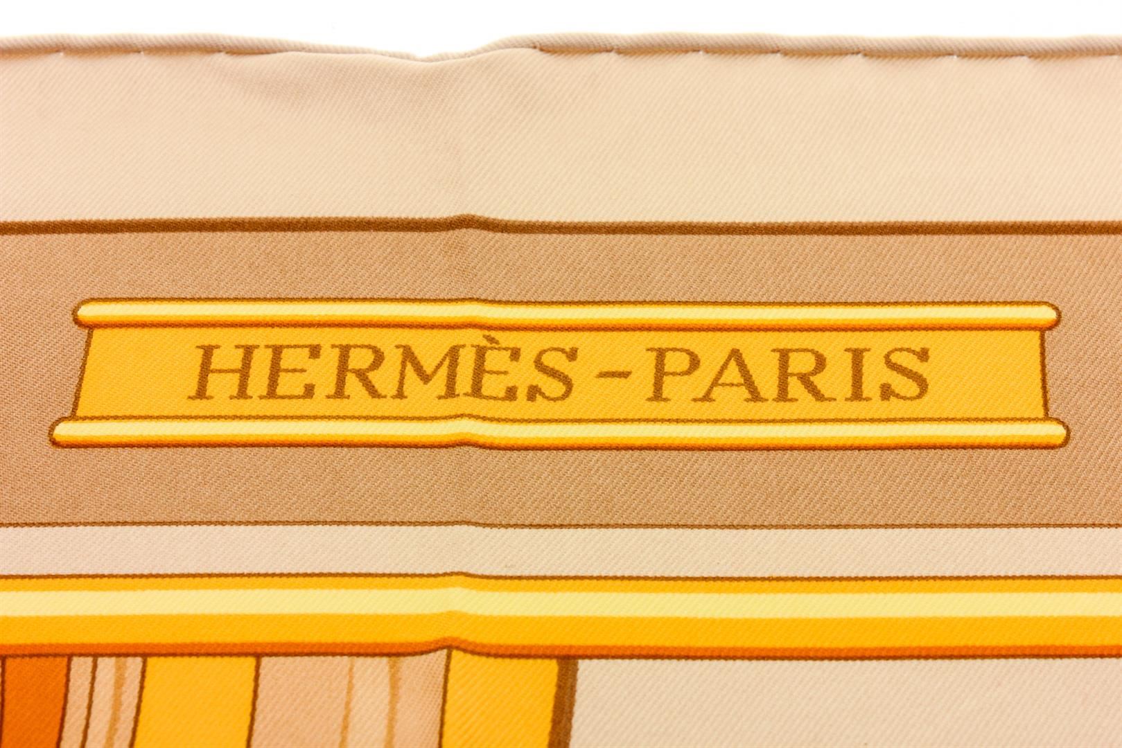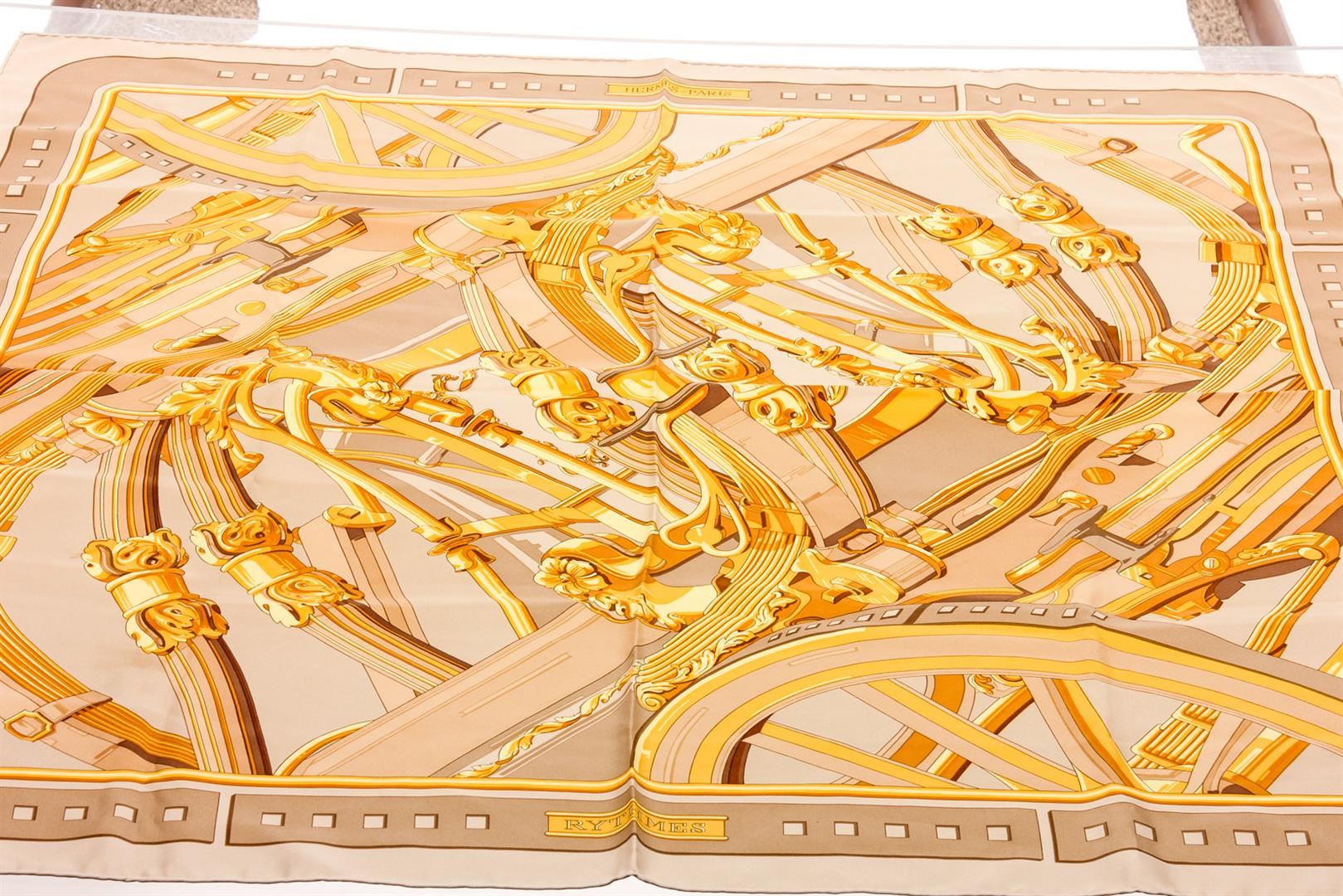 One Hermes Gold Multicolor Rythmes Silk Scarf. Gold and multicolor Hermès silk scarf with 'Rythmes' motif throughout and hand-rolled edges.