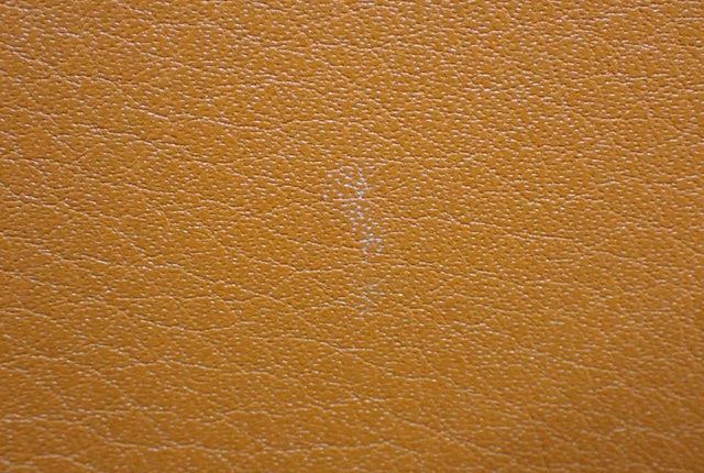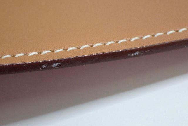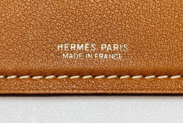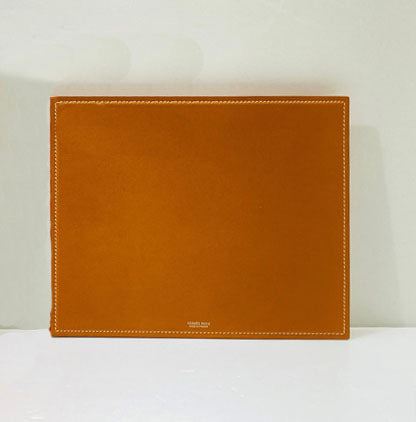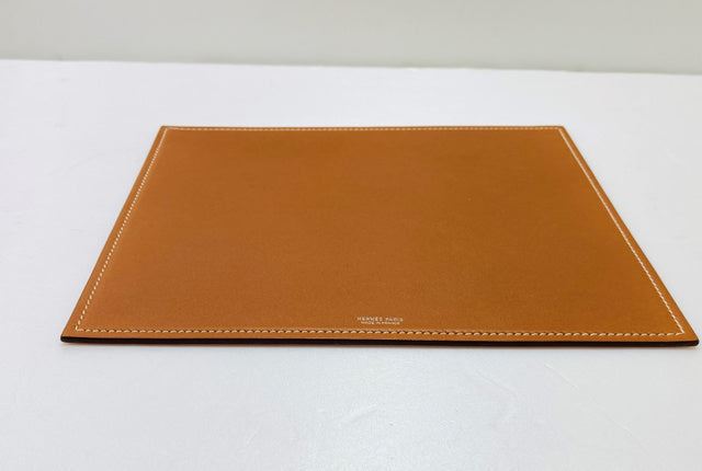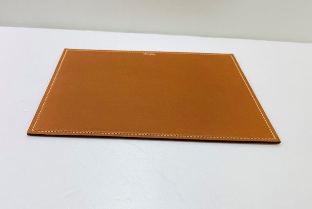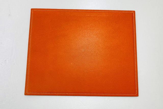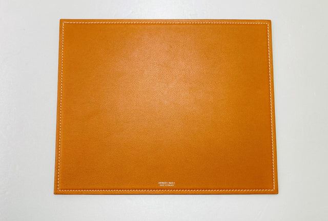 Hermes mouse pad is crafted in gold and orange Swift Calfskin leather with top stitched border and silvered brand stamp at front. Length 9.6", Width 7.8", Depth 0.1"