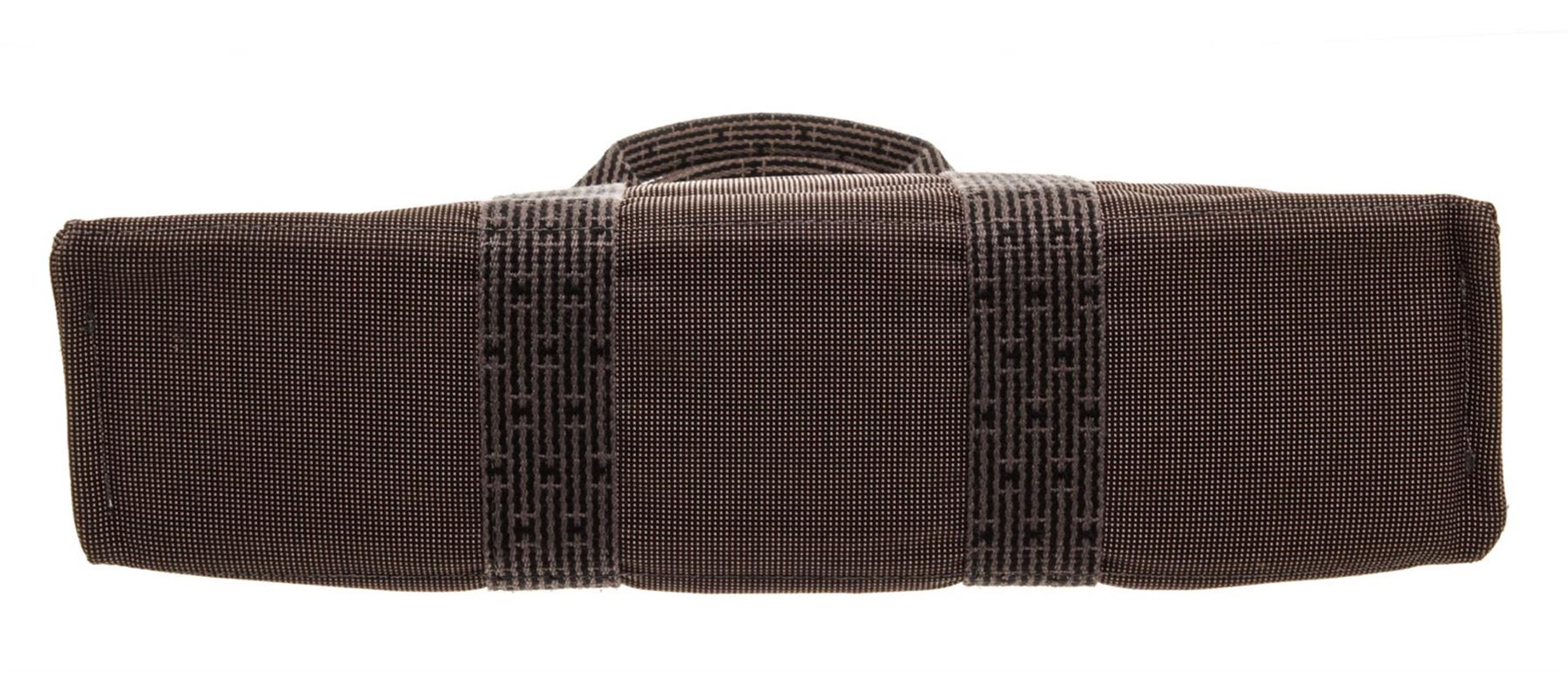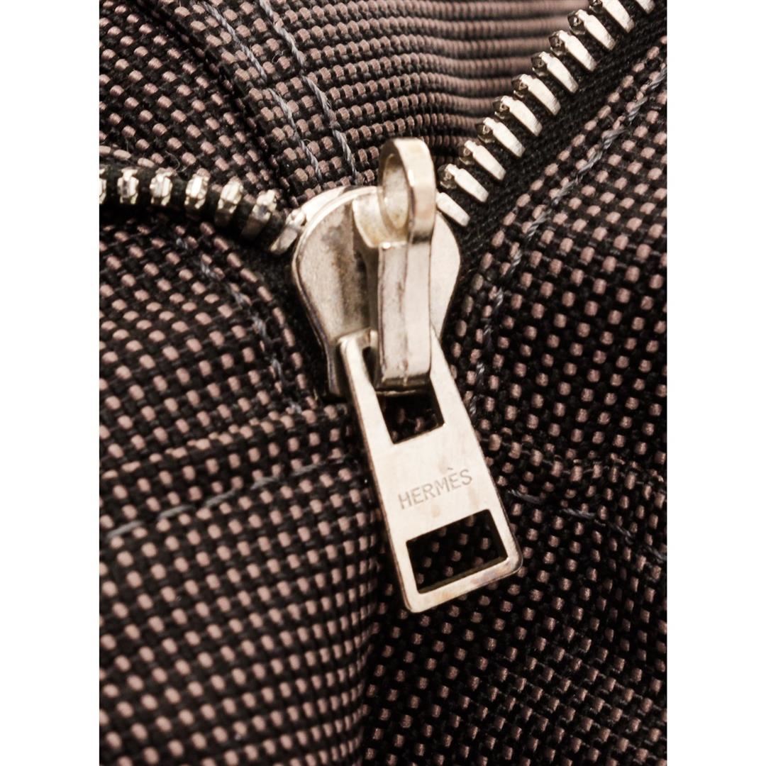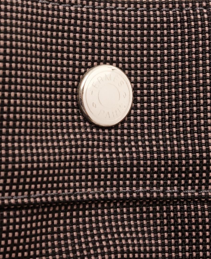 Light gray canvas Hermes Fourre Tout MM with palladium-plated hardware, tonal canvas trim, dual flat top handles, six exterior slit pockets, tonal canvas lining, single interior zip pocket and zip closure at top with additional three snap closures. Authentic.