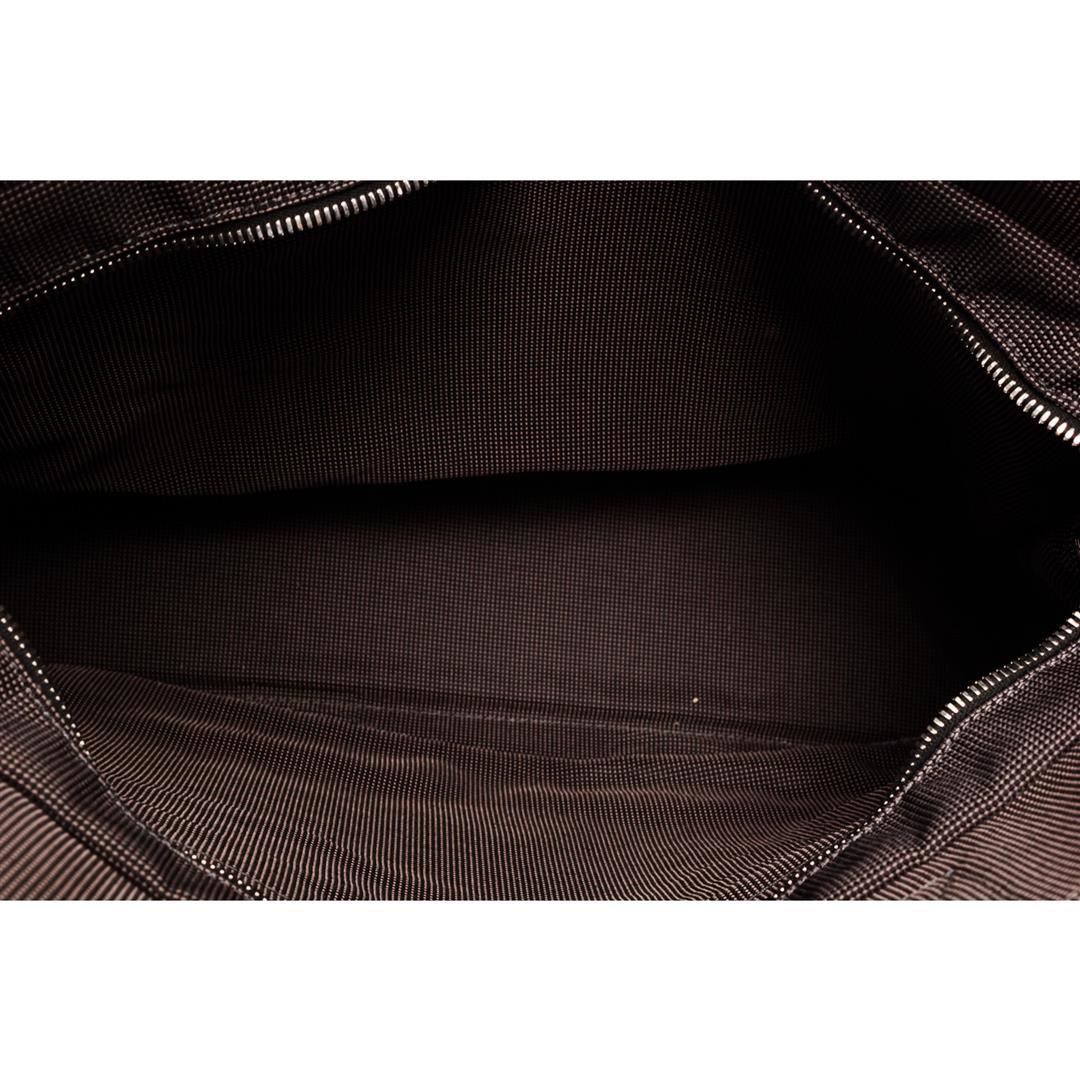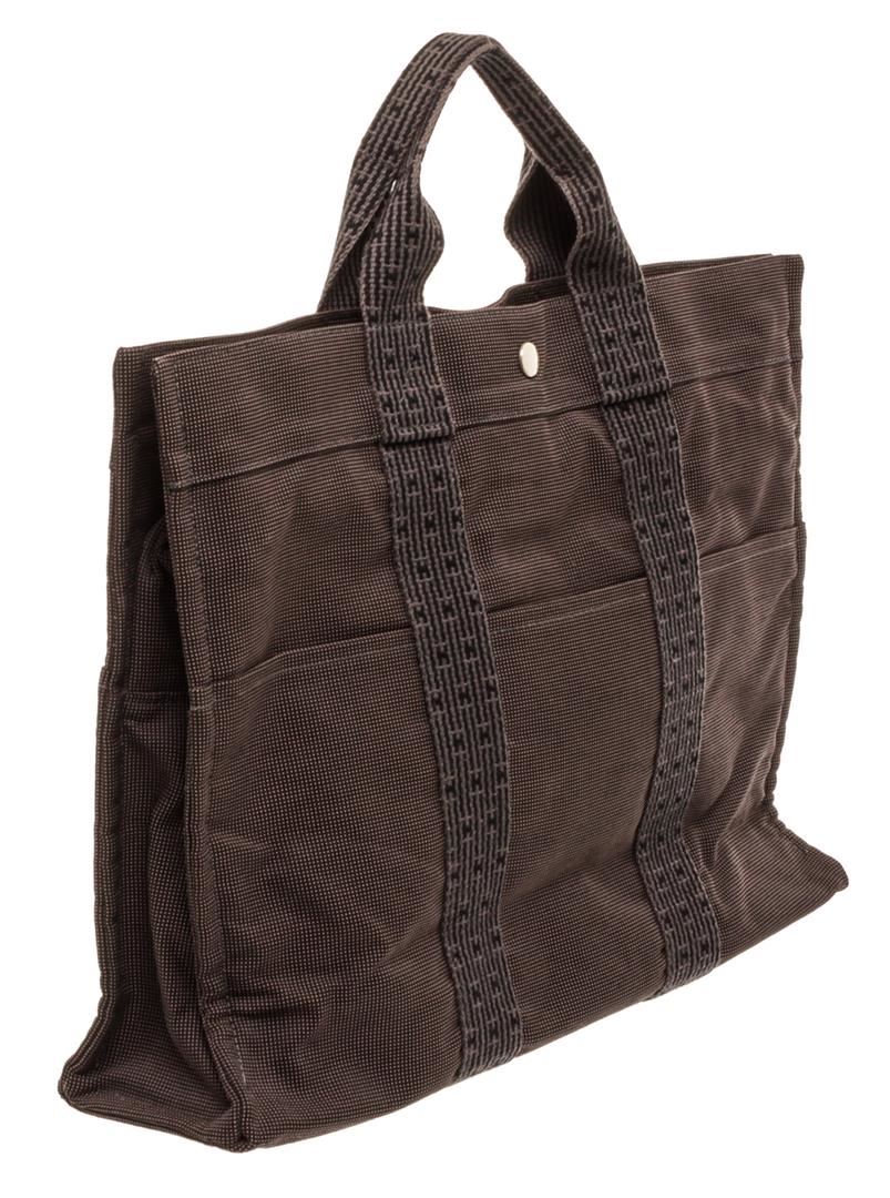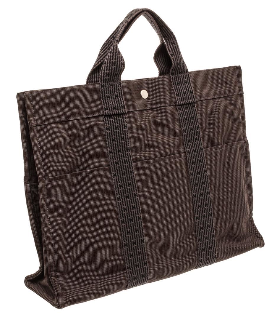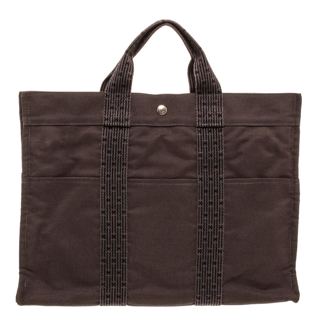 Light gray canvas Hermes Fourre Tout MM with palladium-plated hardware, tonal canvas trim, dual flat top handles, six exterior slit pockets, tonal canvas lining, single interior zip pocket and zip closure at top with additional three snap closures. Authentic.