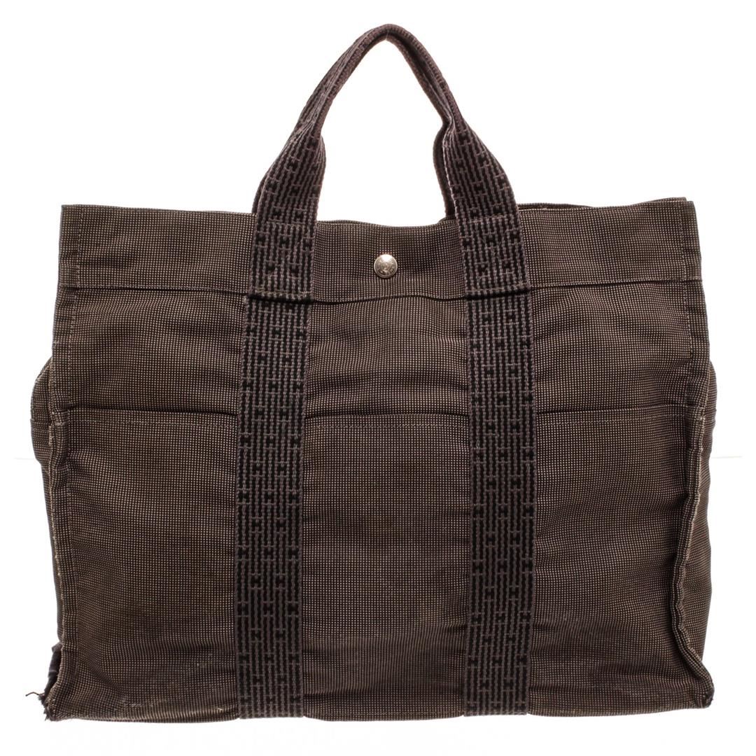 Light gray canvas Hermes Fourre Tout MM with palladium-plated hardware, tonal canvas trim, dual flat top handles, six exterior slit pockets, tonal canvas lining, single interior zip pocket and zip closure at top with additional three snap closures. Authentic.
