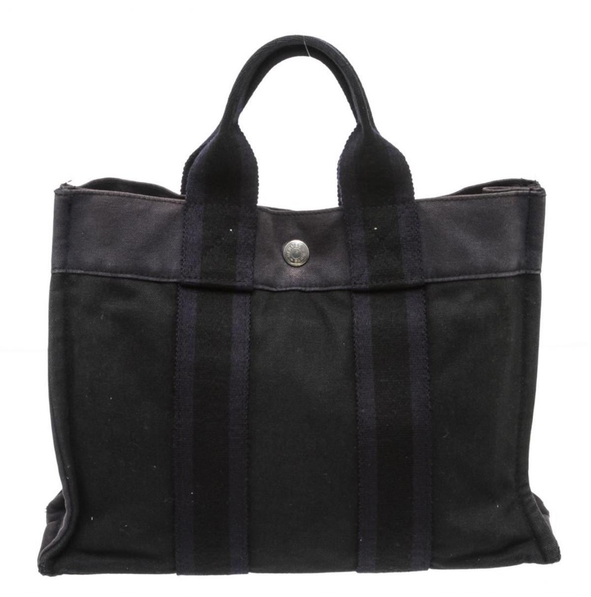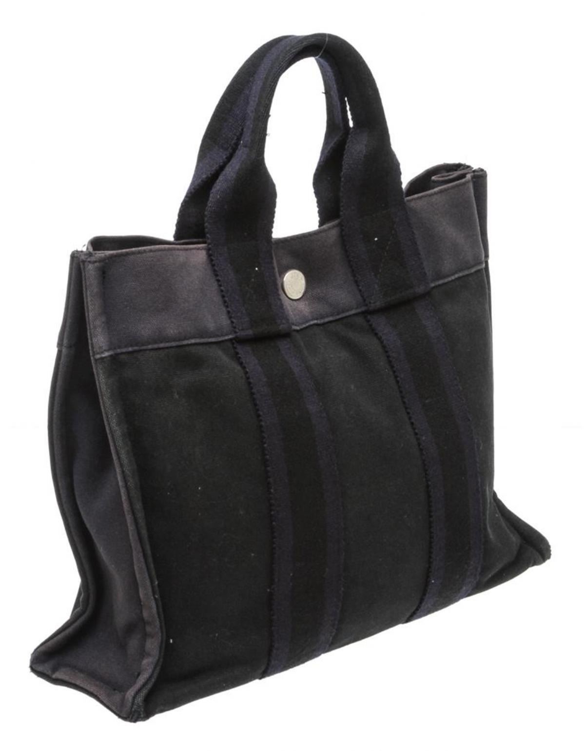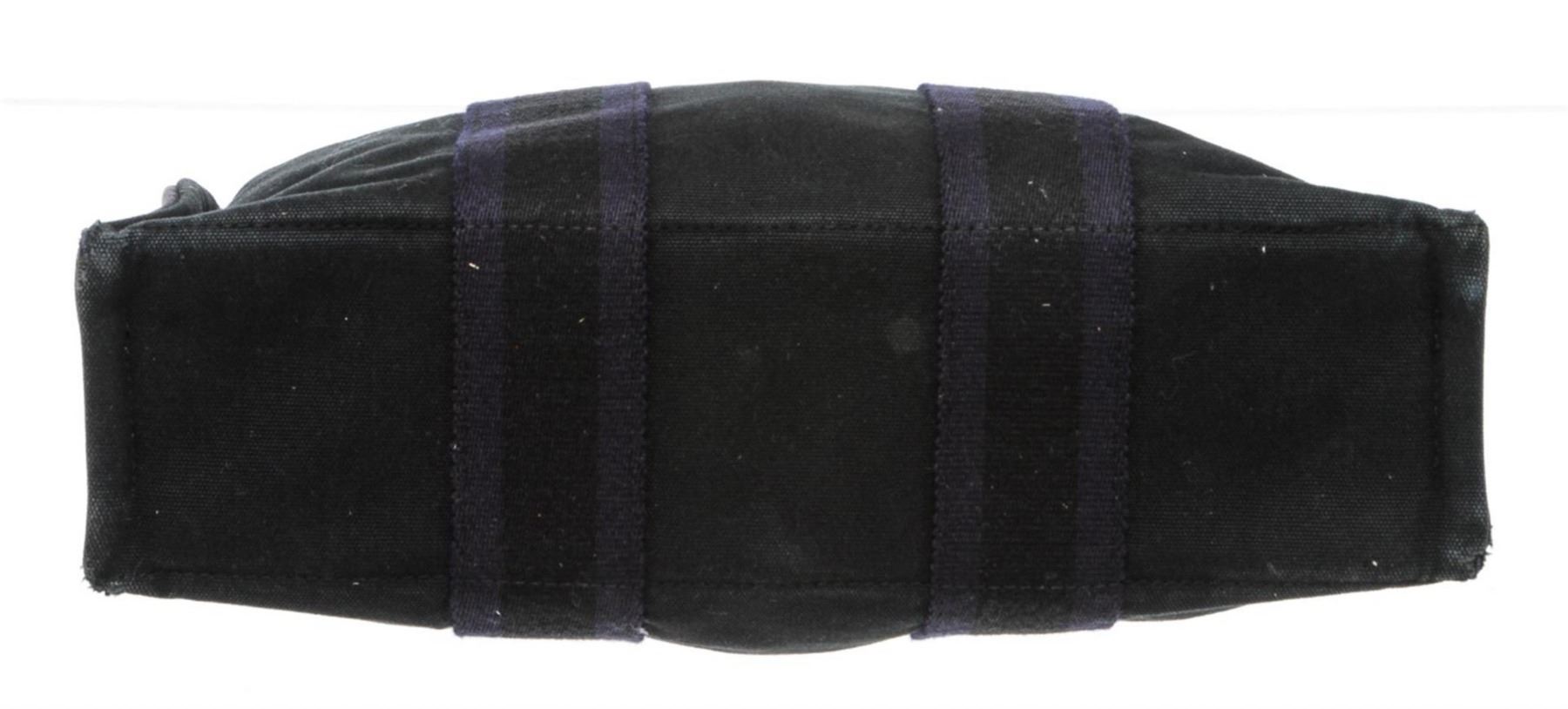 One Hermes Gray Dark Blue Canvas Sac Fourre PM Tote Bag. Hermes gray canvas Sac Fourre PM tote bag with dark blue stripe handles, interior zip pocket, and snap closure.