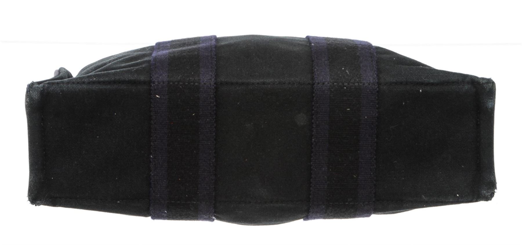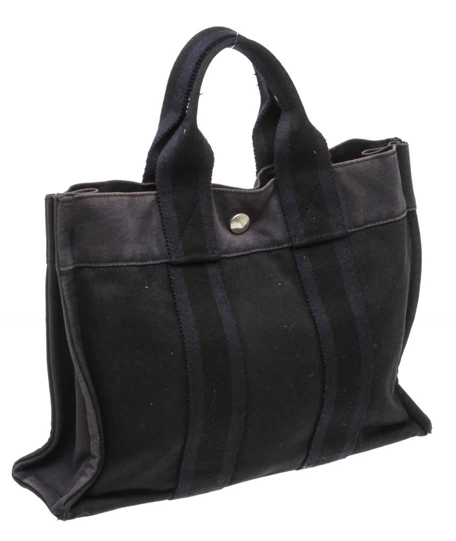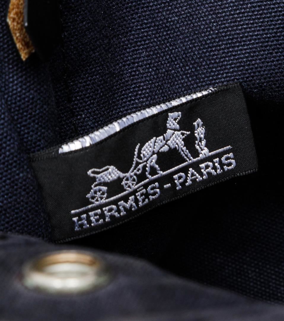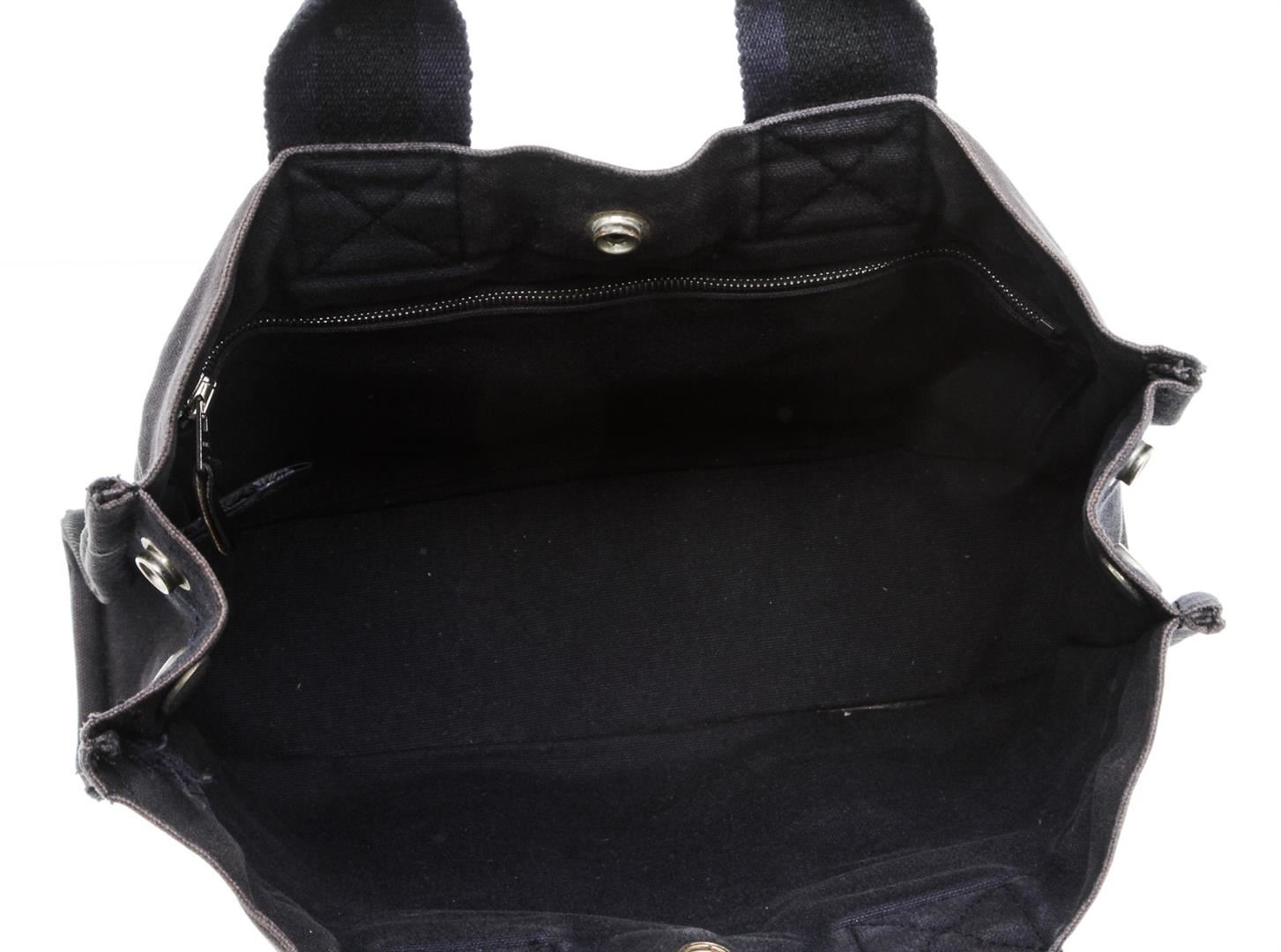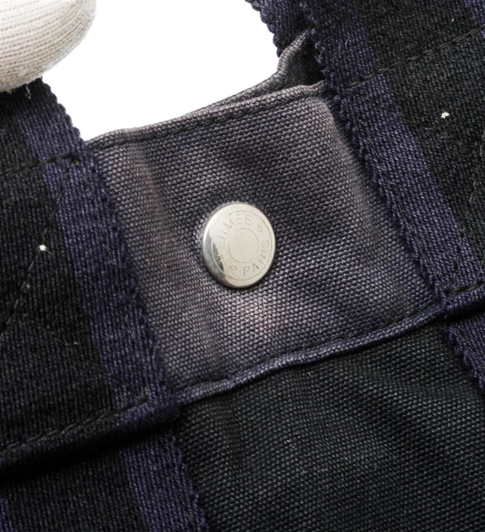One Hermes Gray Dark Blue Canvas Sac Fourre PM Tote Bag. Hermes gray canvas Sac Fourre PM tote bag with dark blue stripe handles, interior zip pocket, and snap closure.