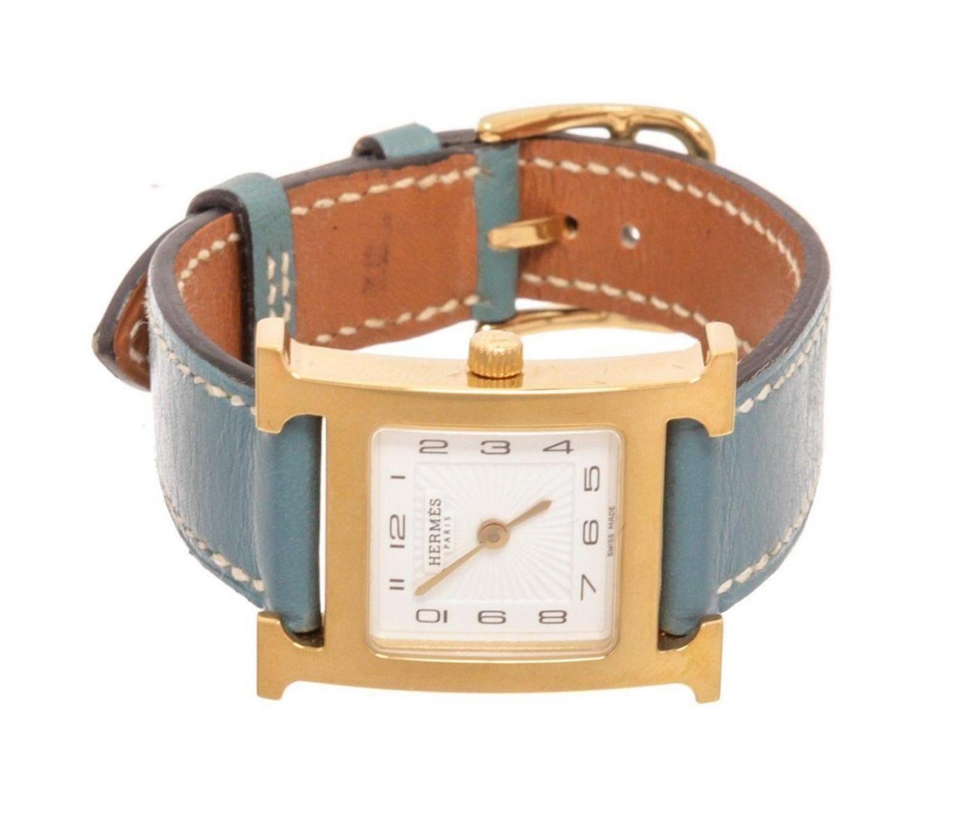 Hermes Gray Heure H 21MM Watch. Hermes Gray Heure H 21MM Watch with gold-tone hardware, trim leather and trun lock closure. MEASUREMENTS: Length 21 in / 53 cm Width 21 in / 53 cm Height 1 in / 3 cmCONDITION: Pre-Owned Good overall, please see photo