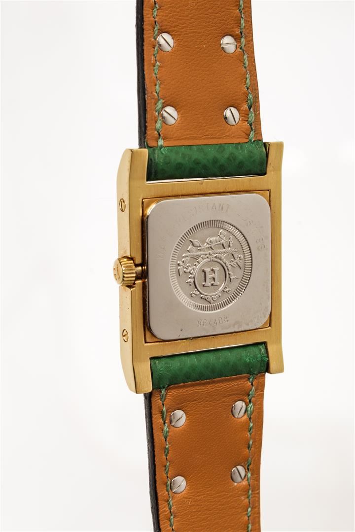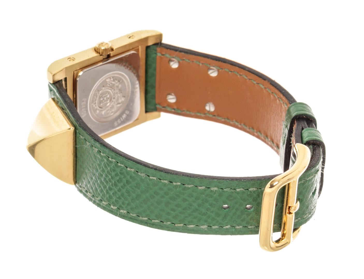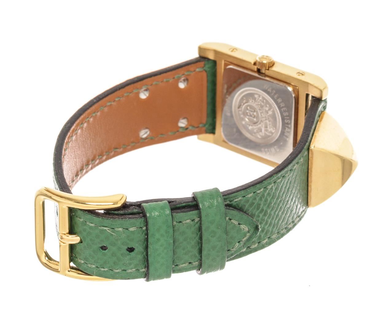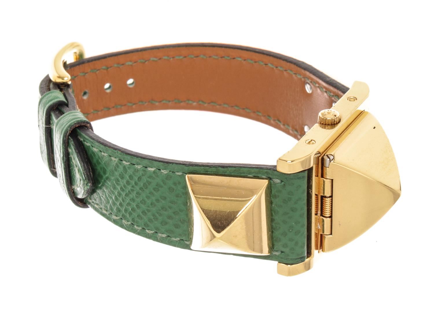 Hermes Green Gold Steel and Leather Medor PM Quartz Watch. All available information is listed in the description and shown in the photos. Hermes Green Gold Steel and Leather Medor PM Quartz Watch with made in courchevel leather this gold toned studded accents and flip cover to reveal a watch is chic and a bit edgy. this watch has a quartz movement. Height: 6.5" Width: 0.2" / 16.51 x 0.50 Cm