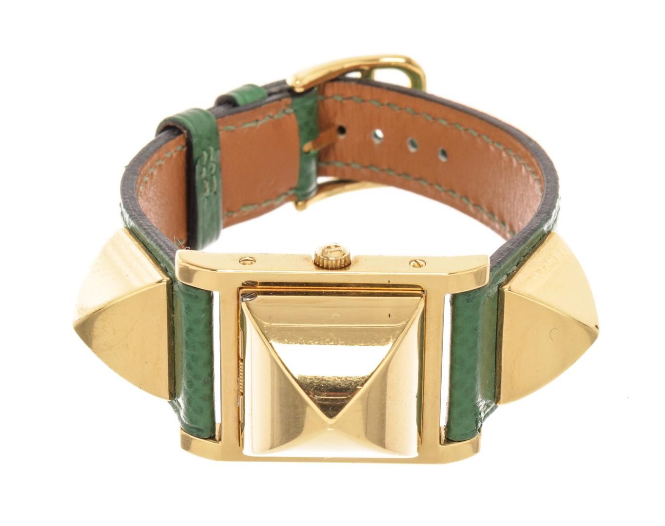 Hermes Green Gold Steel and Leather Medor PM Quartz Watch. All available information is listed in the description and shown in the photos. Hermes Green Gold Steel and Leather Medor PM Quartz Watch with made in courchevel leather this gold toned studded accents and flip cover to reveal a watch is chic and a bit edgy. this watch has a quartz movement. Height: 6.5" Width: 0.2" / 16.51 x 0.50 Cm