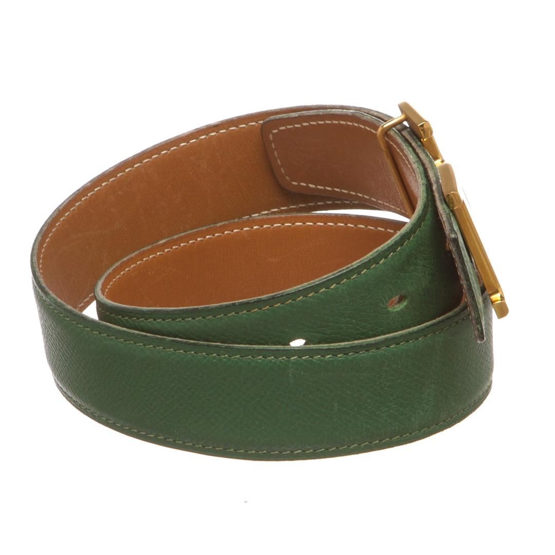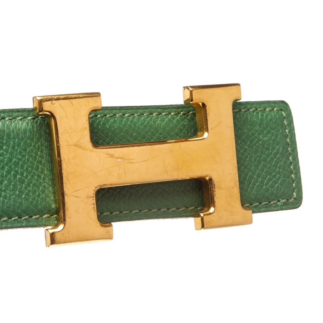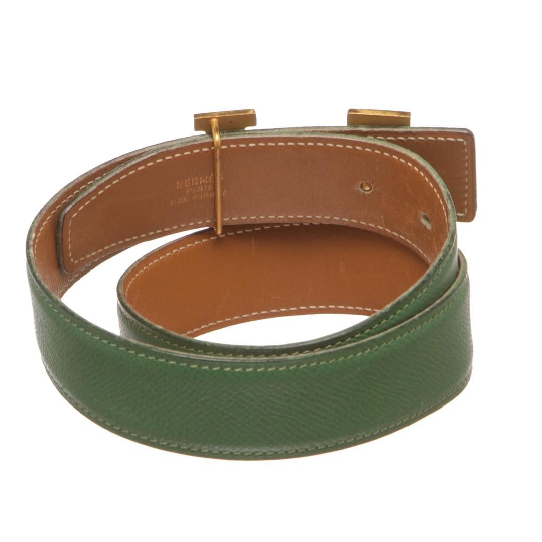 Green and Tan leather Hermès Reversible Constance belt with gold-plated H buckle featuring peg-in-hole closures. Designer size 60. Item is pre-owned. Item Dimensions: Length: 28"-30" Width: 1.25".