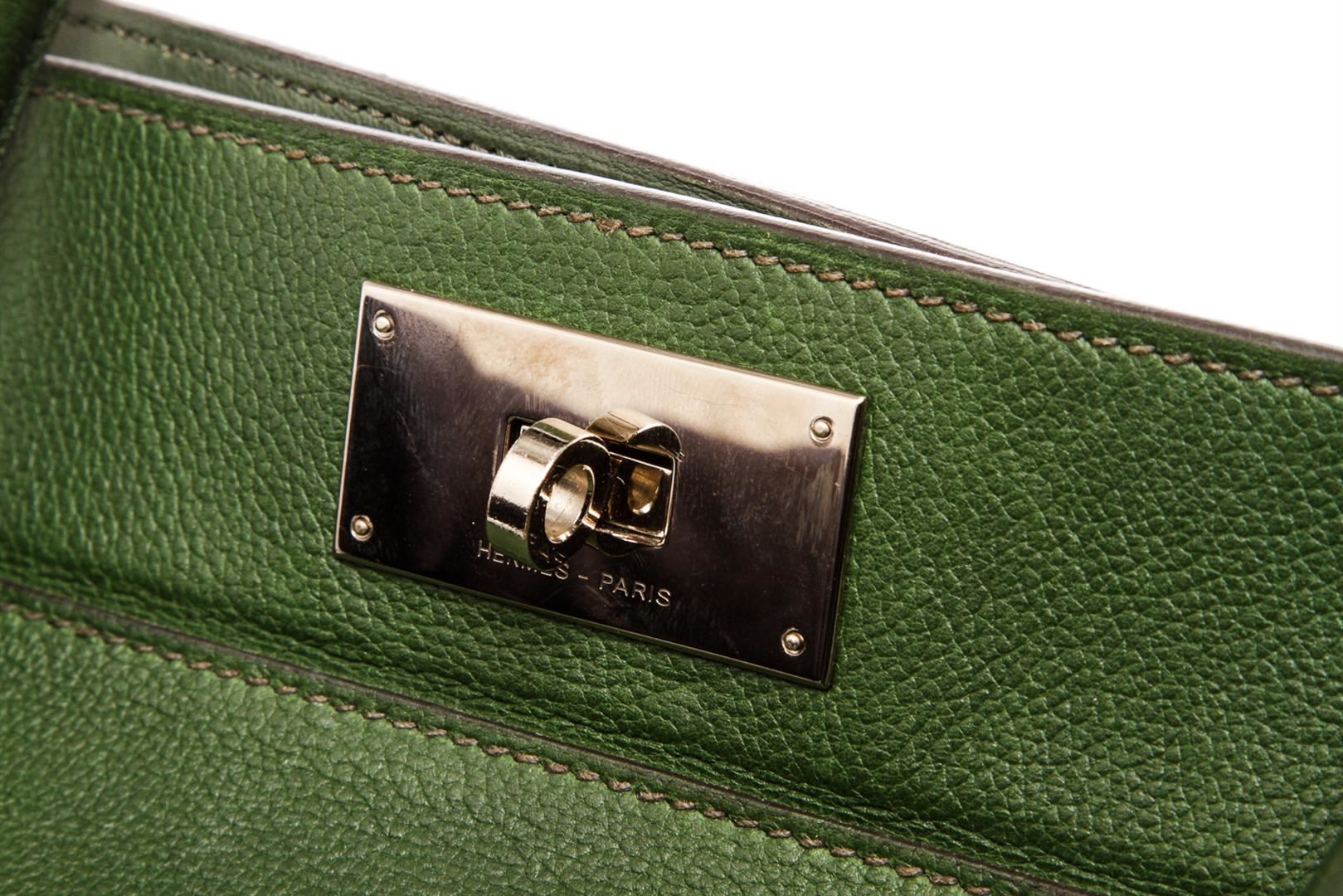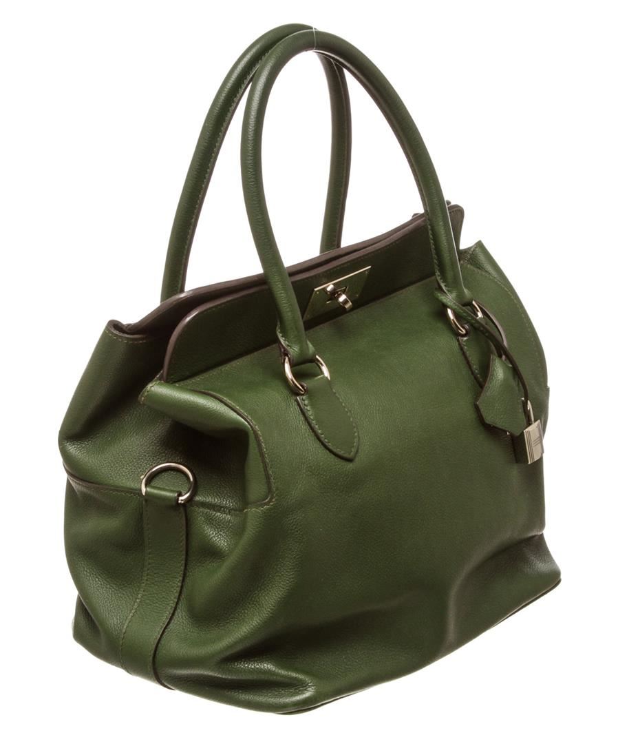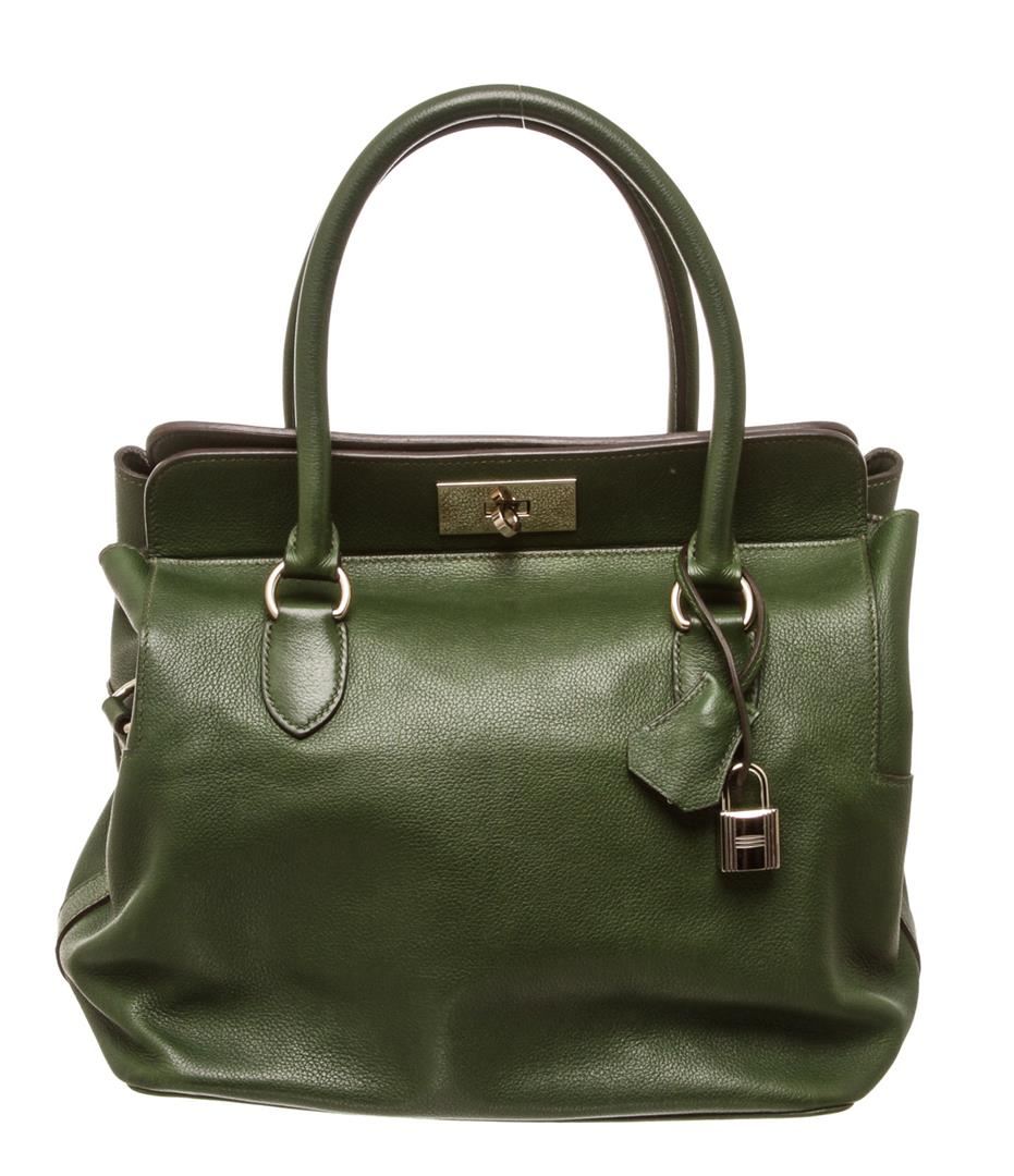 One Hermes Green Leather Toolbox Satchel Handbag. Crafted out of green leather, silver-tone hardware, dual rolled handles, and turn-lock closure at front. Inner green leather lining. SUG
