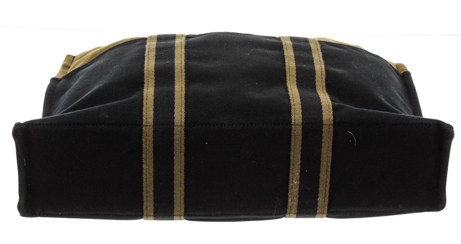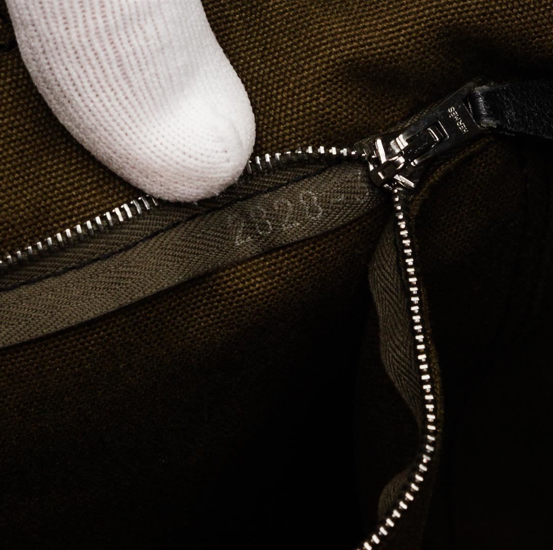 Hermes green and navy blue canvas Sac Fourre MM tote bag with stripe canvas handles, interior zip pocket, three exterior slip pockets on front and back, side snap pocket, and snap closure. Authentic.