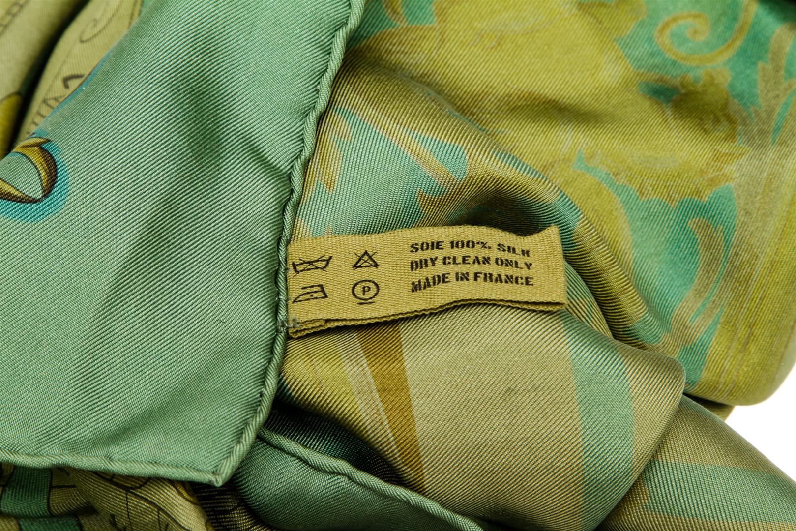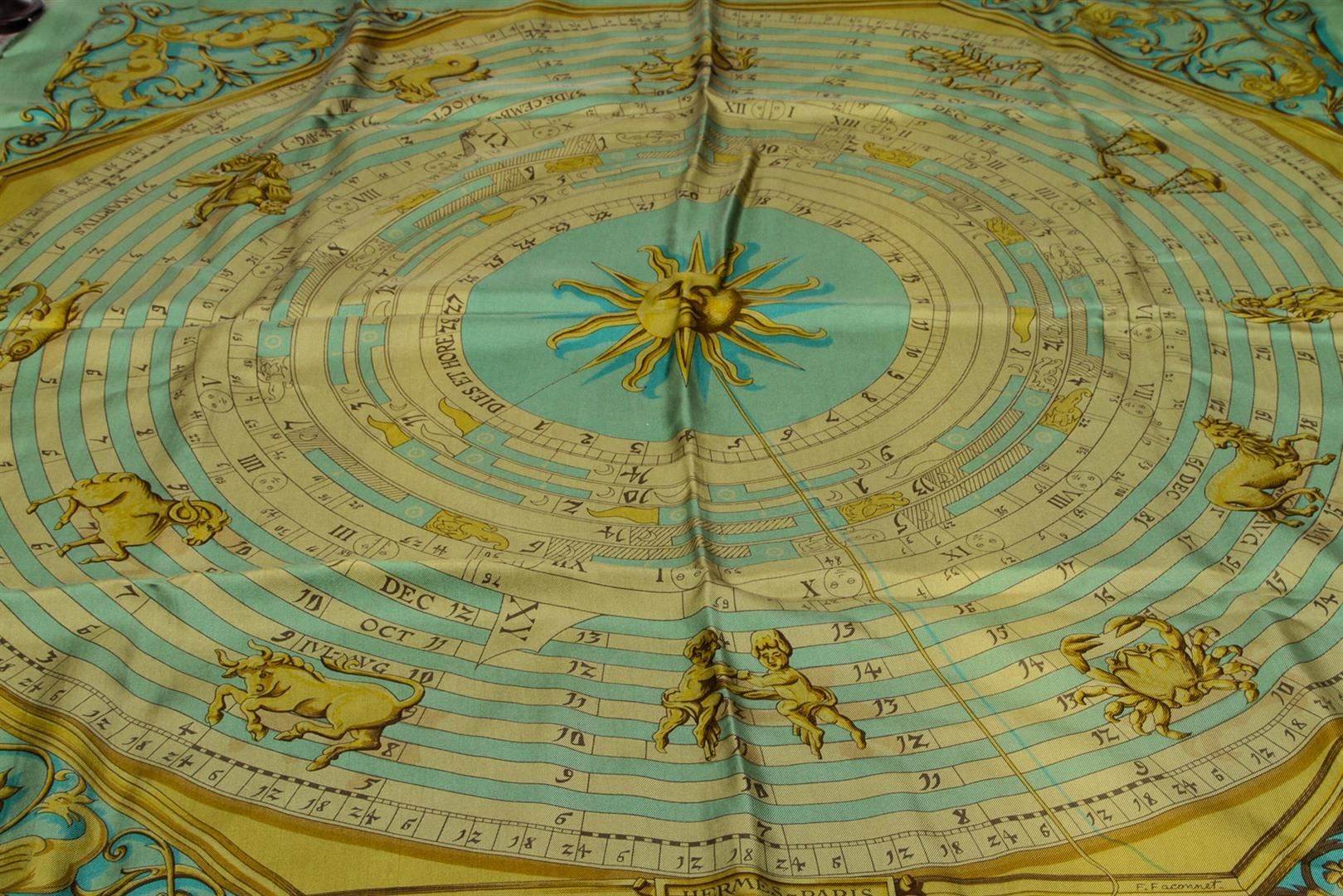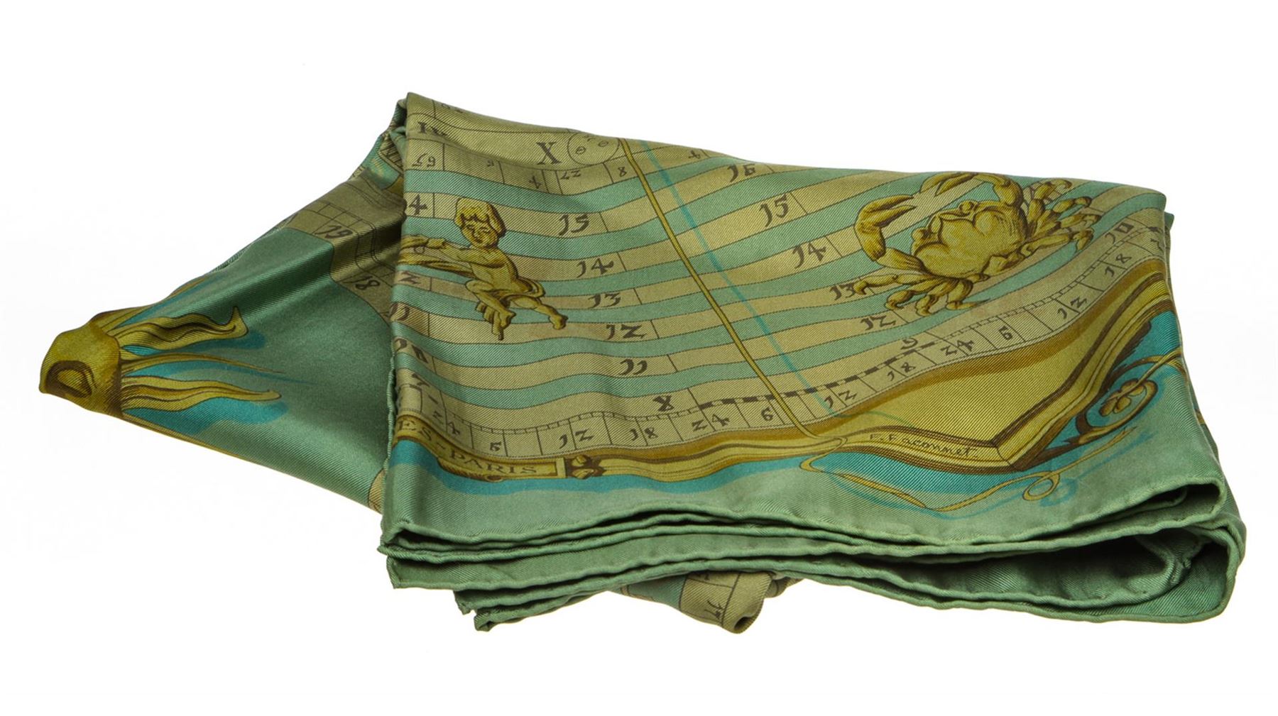 One Hermes Green Silk Astrology Calendar Scarf. Green Hermès silk scarf with 'Astrology Calendar' motif and hand rolled edges.
