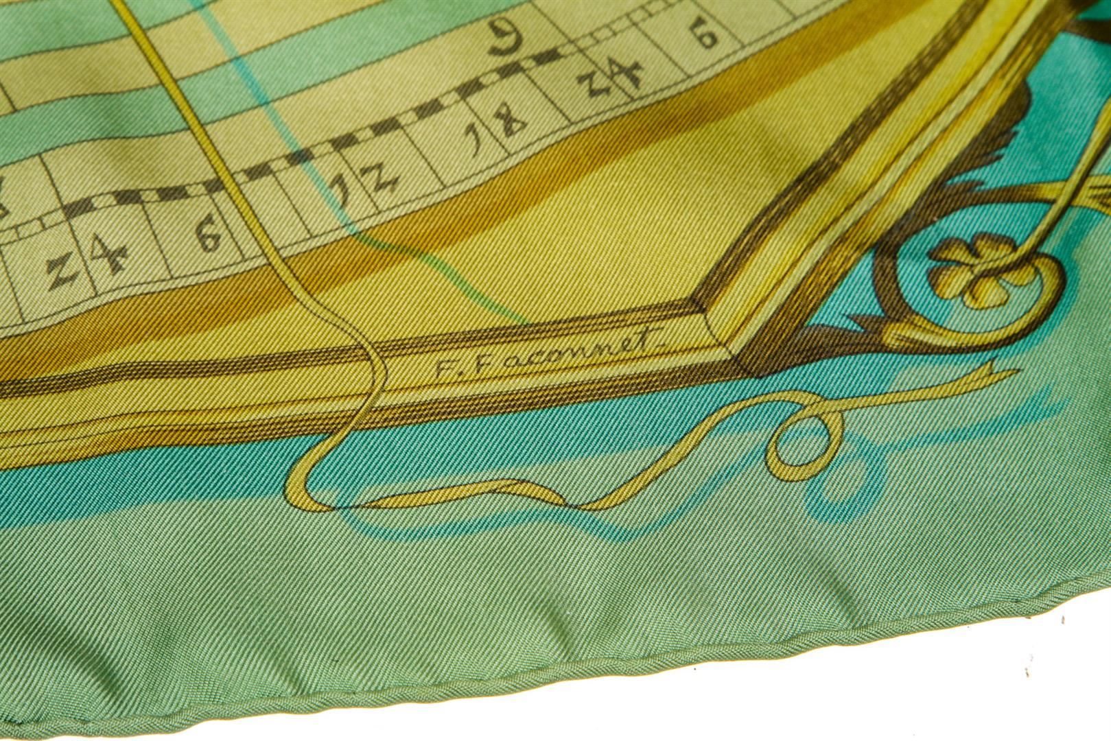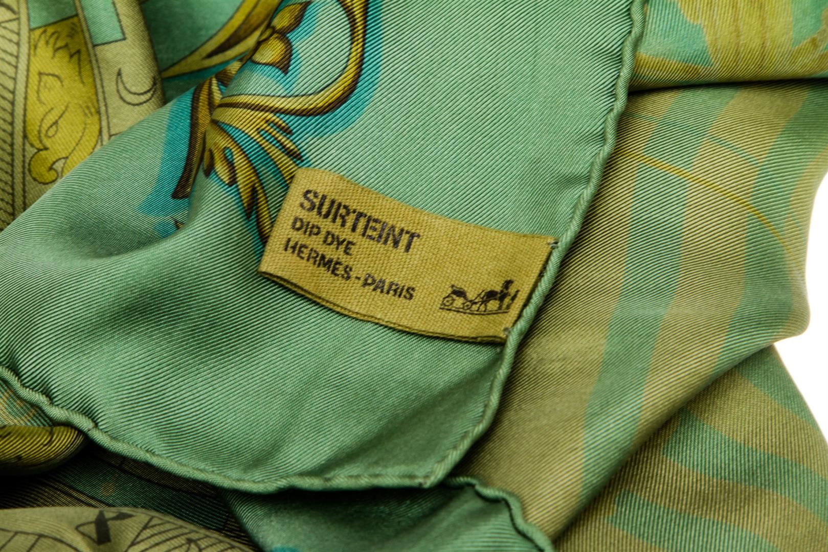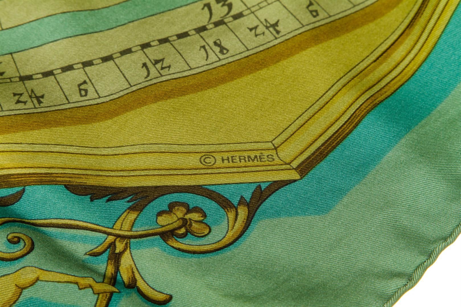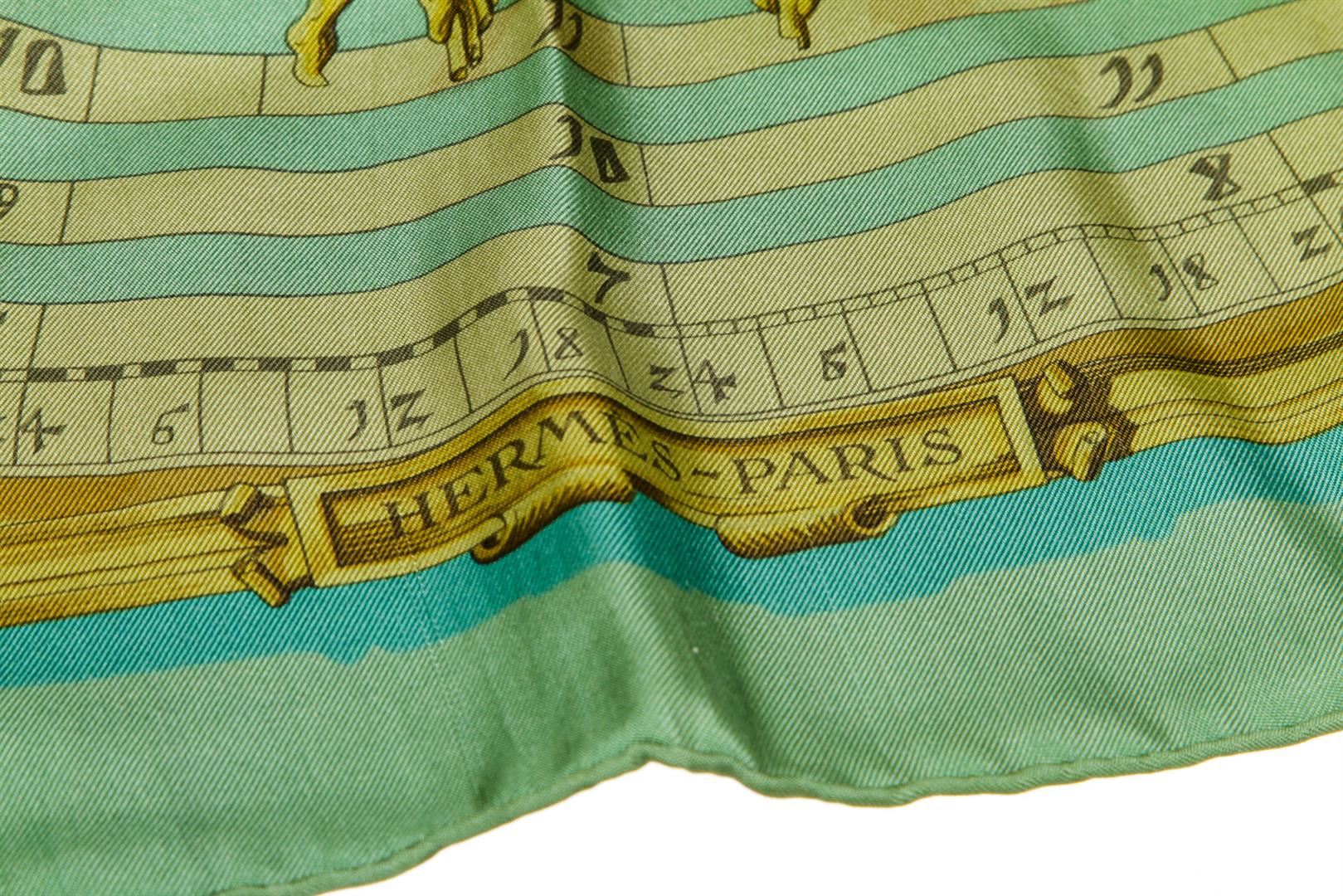 One Hermes Green Silk Astrology Calendar Scarf. Green Hermès silk scarf with 'Astrology Calendar' motif and hand rolled edges.