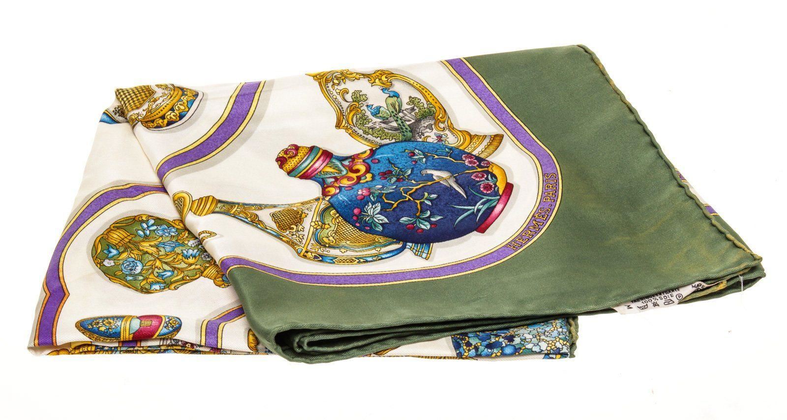 Hermes Green Silk Scarf, silk pattern Sesame scarf designed by Philippe Ledoux, hand rolled edges. Please note, 0.5cm stain on edge of item.