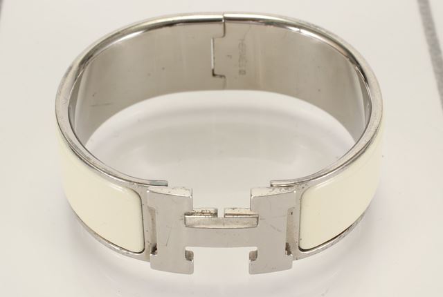 Ivory metal Hermes Clic Clac Wide bangle with Palladium hardware and CC turn-lock closure.