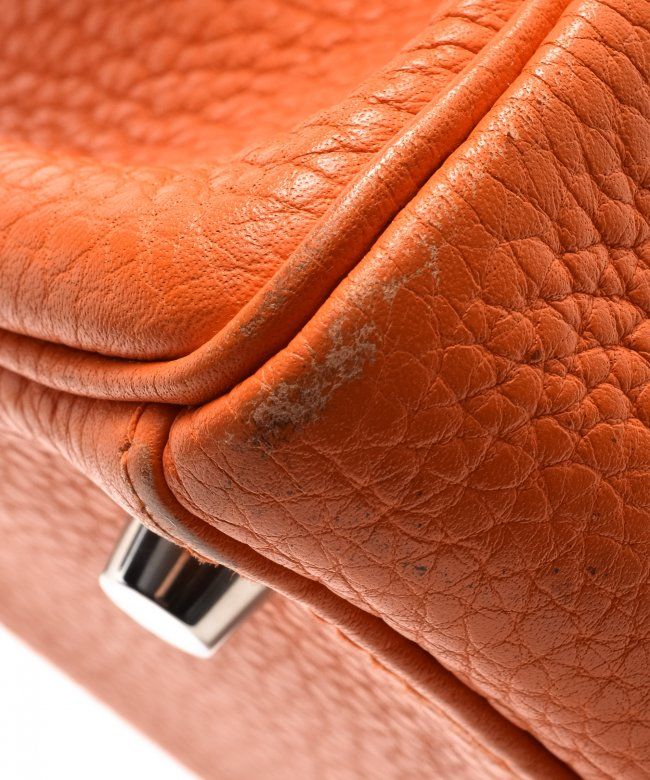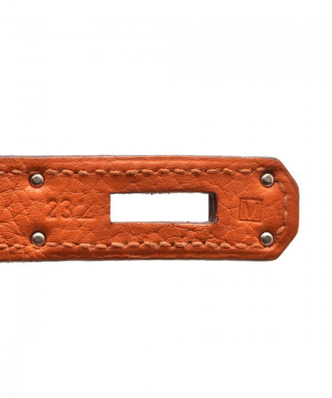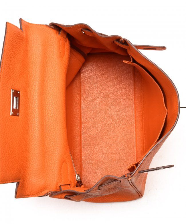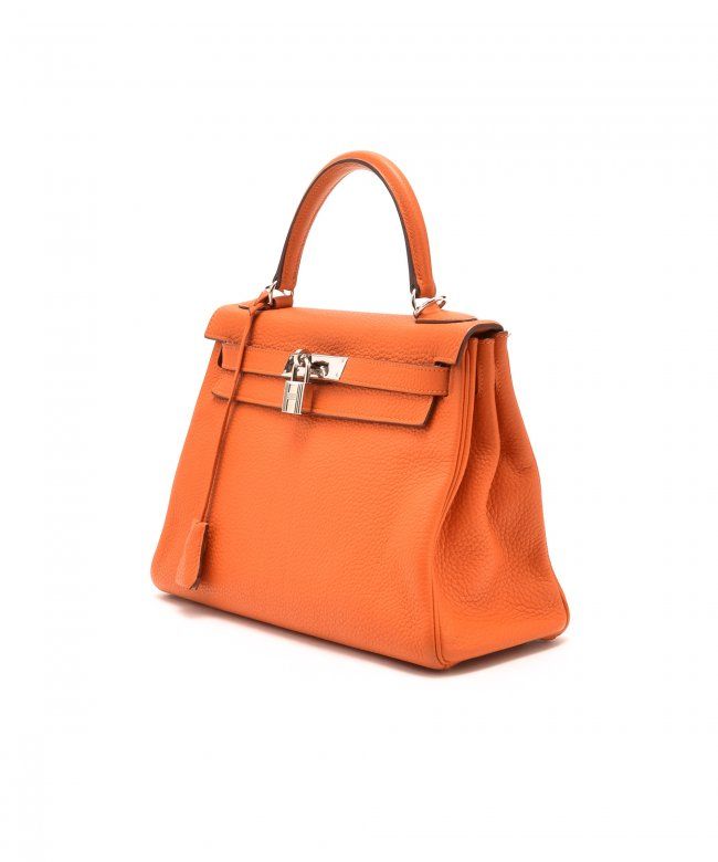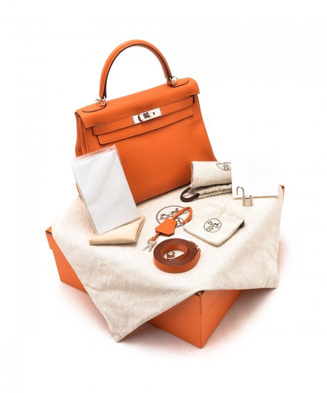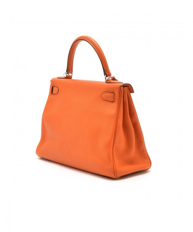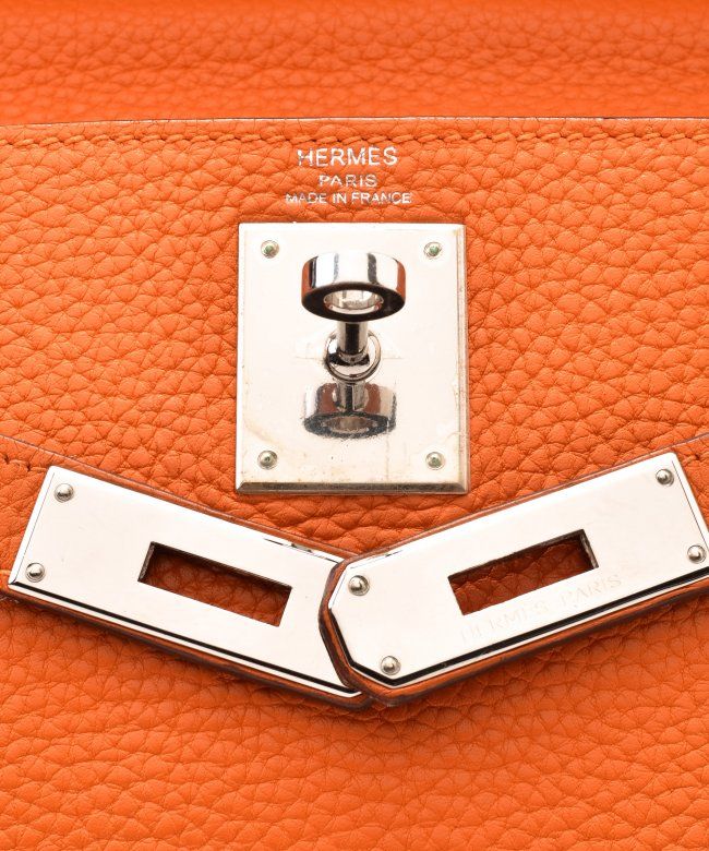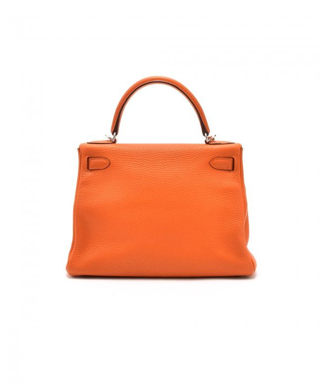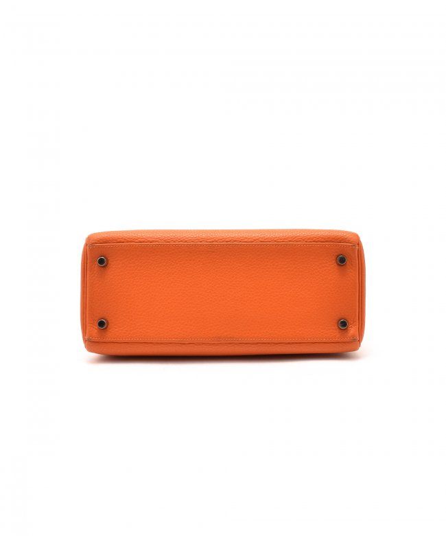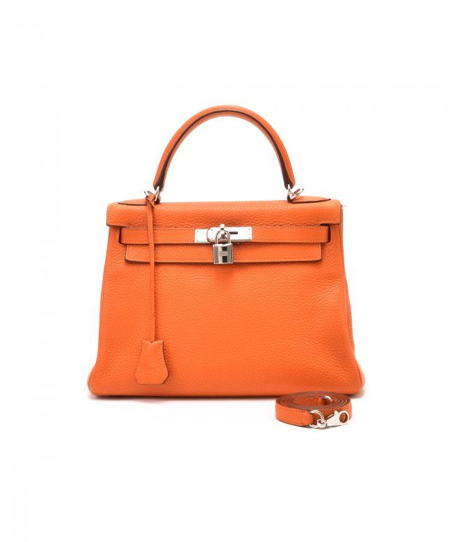 Hermes Kelly 28 (Stamp: Square M, Silver Hardware). Orange taurillon clemence leather body, trims and lining, Shoulder strap drop length: 44cm, Lightly worn corners, Minor scratches on hardware, Faint stains on inside pocket, Plastic protective seal is till on. Size: 28W x 20H x 11D. Includes: Box, Dust Bag, Key, Clochette, Lock, Straps, Pouch, Rain cover and protect felt.WF38985