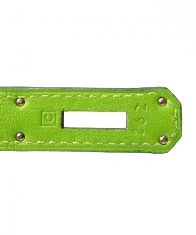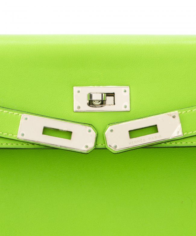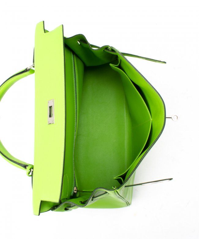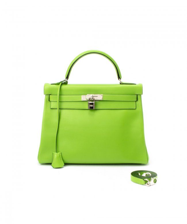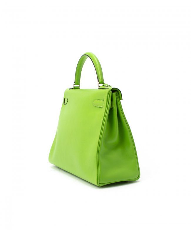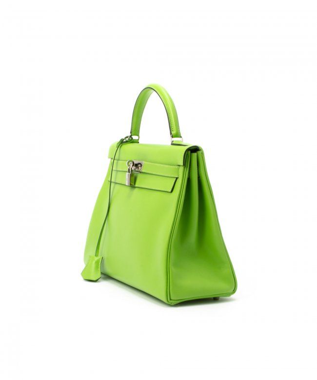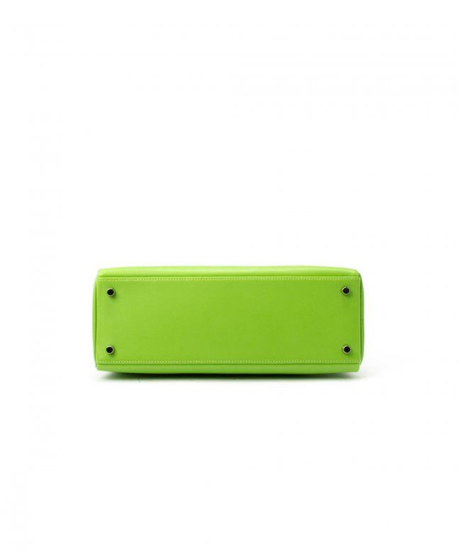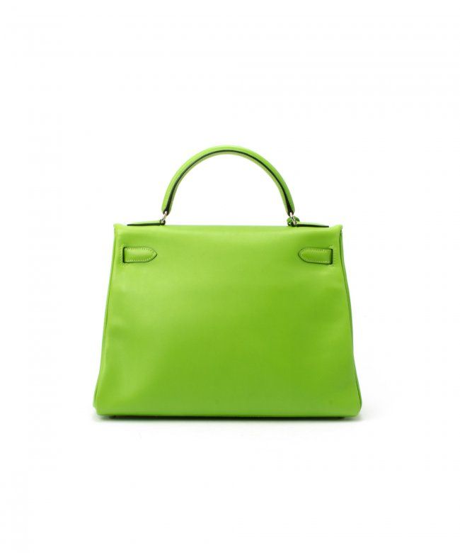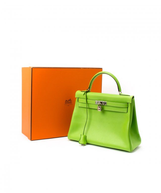 Hermes Kelly 32 (Stamp: Square C, Silver Hardware ). Style: Veau Gulliver, Color: Vert Cru, Protective Seal is Still On. Size: 32W x 23H x 10.5D. Includes: Original Box, Clochette, Key, Lock, Dust Bag, Straps. WF41985