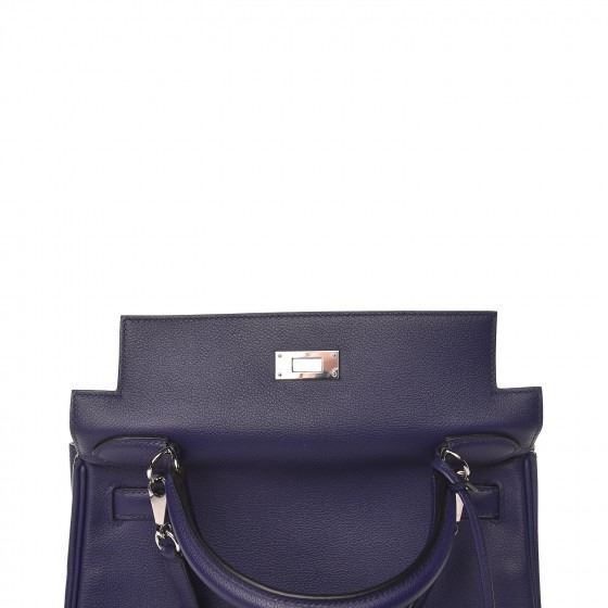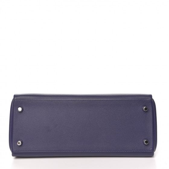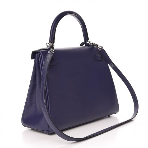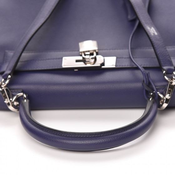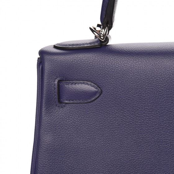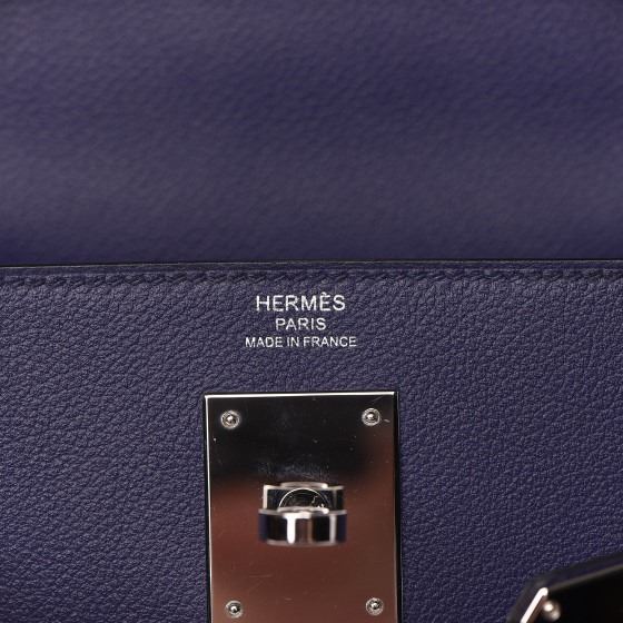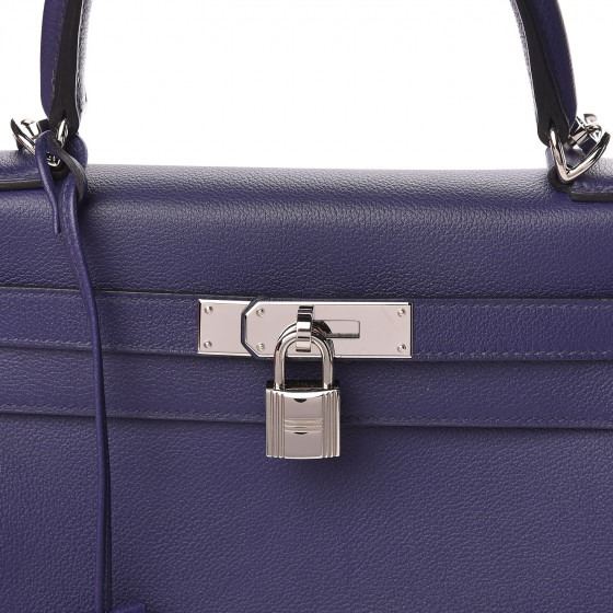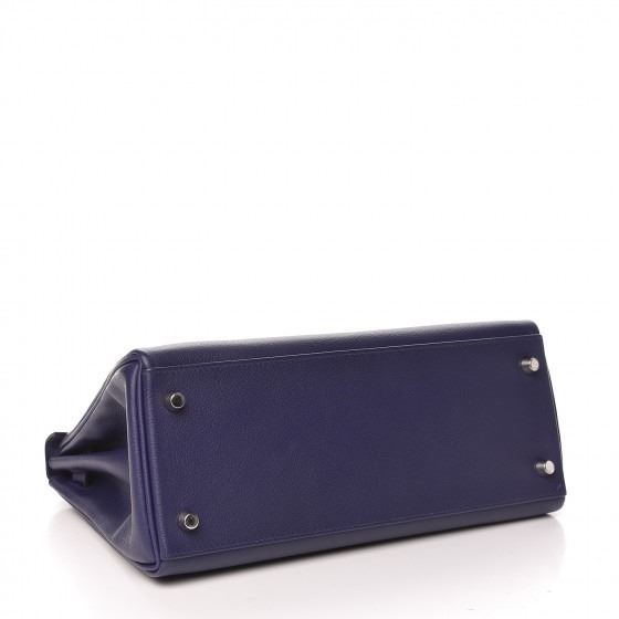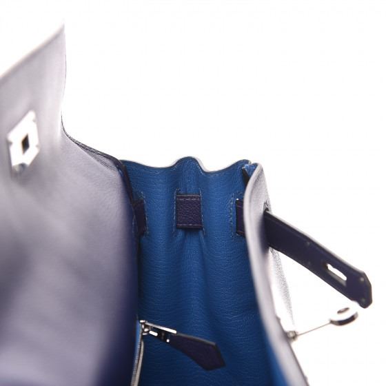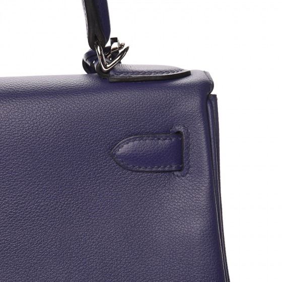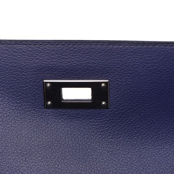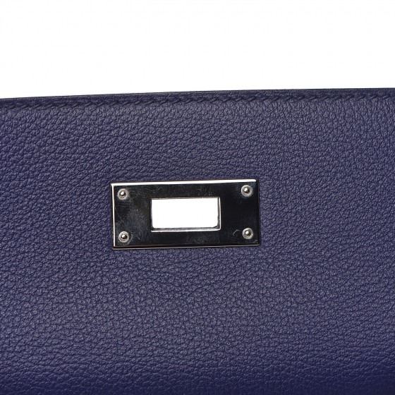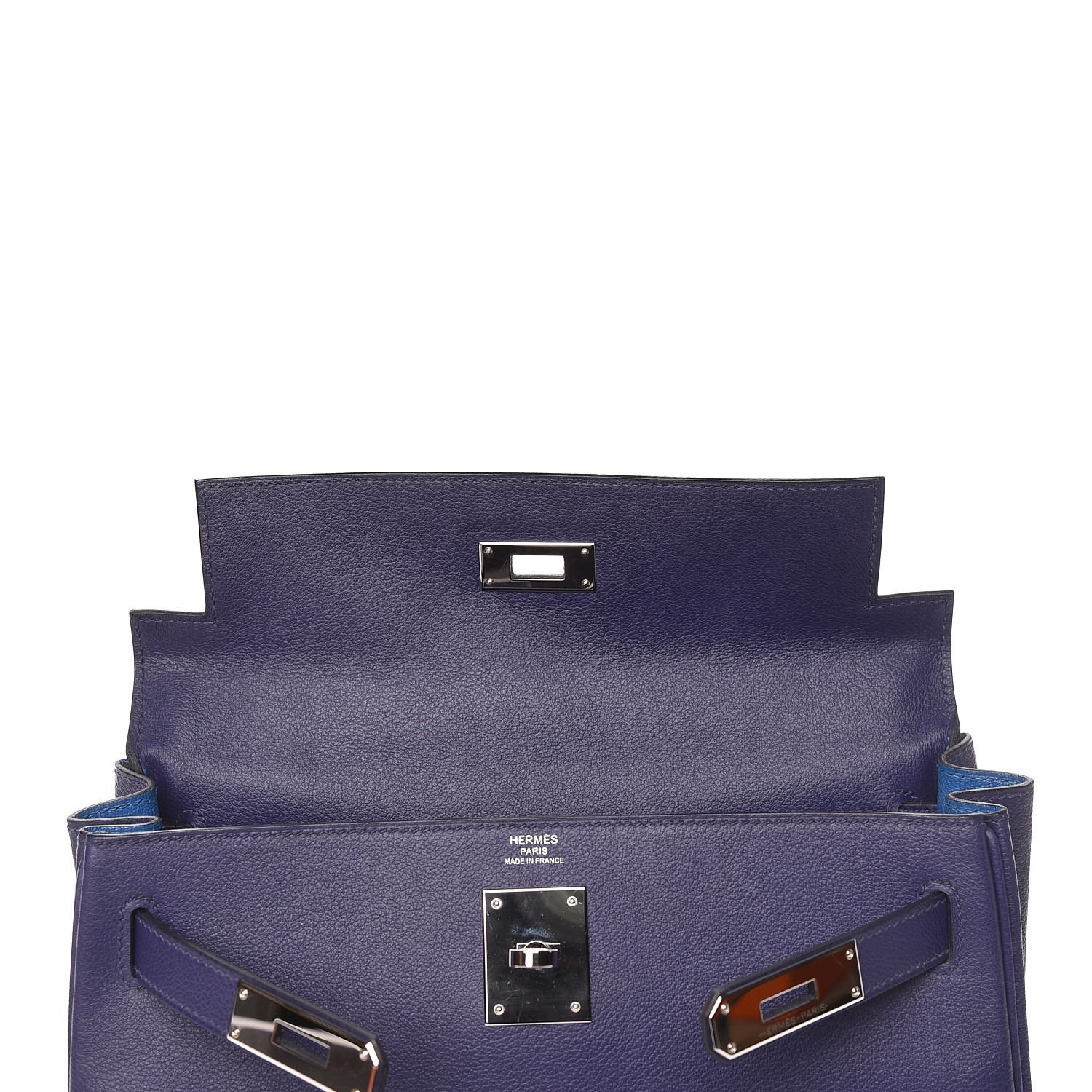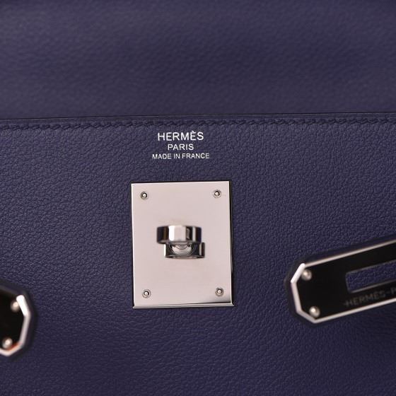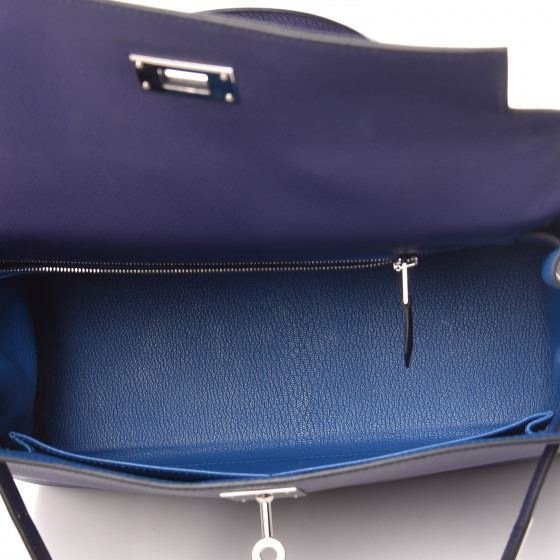 This handbag is crafted of rich veau evercolor calfskin leather in navy blue. The bag features a reinforced rolled leather top handle, an optional shoulder strap, a crossover flap and strap closure, palladium silver palladium plated hardware including a signature Kelly turn lock, a padlock, and a hanging clochette with keys. The flap opens to a matte bright blue leather interior with zipper and flat pockets.