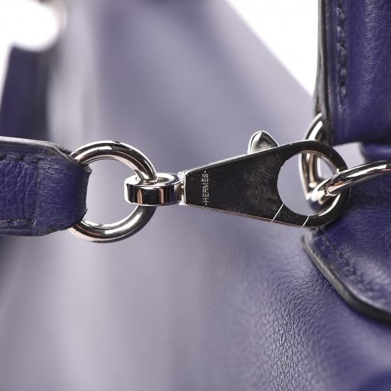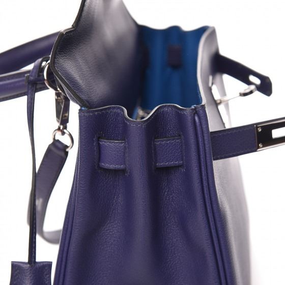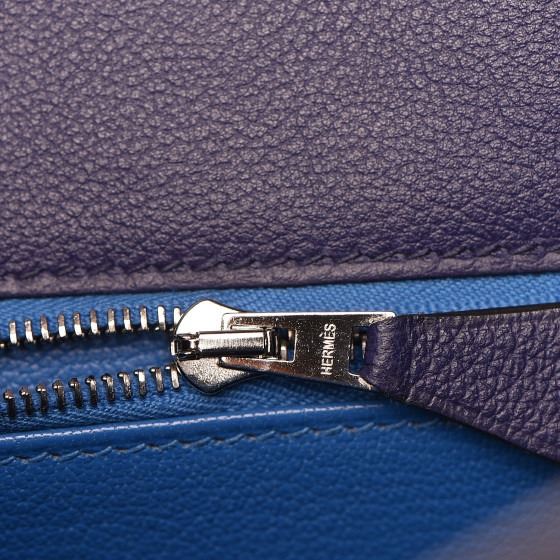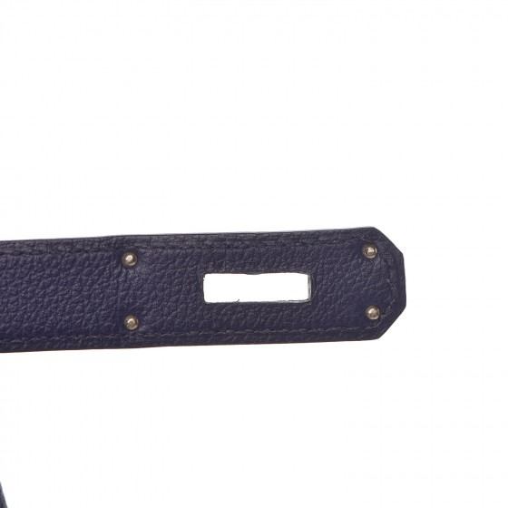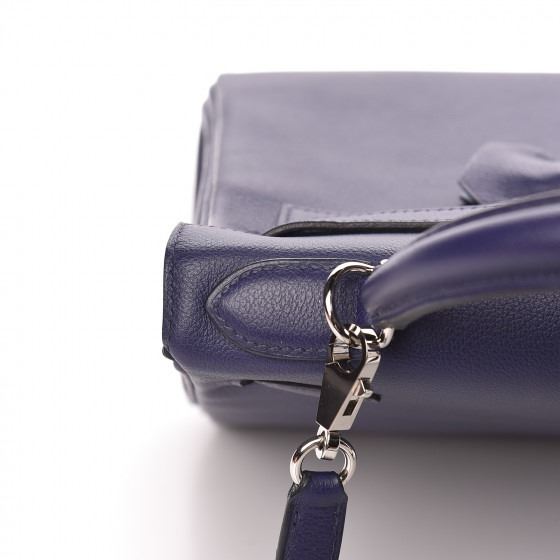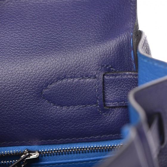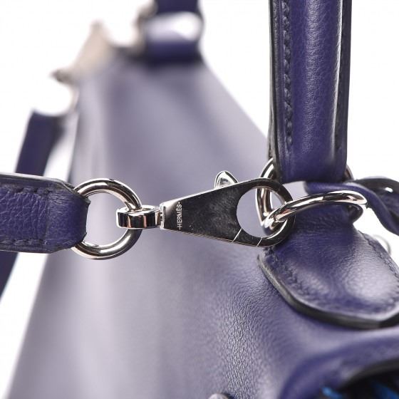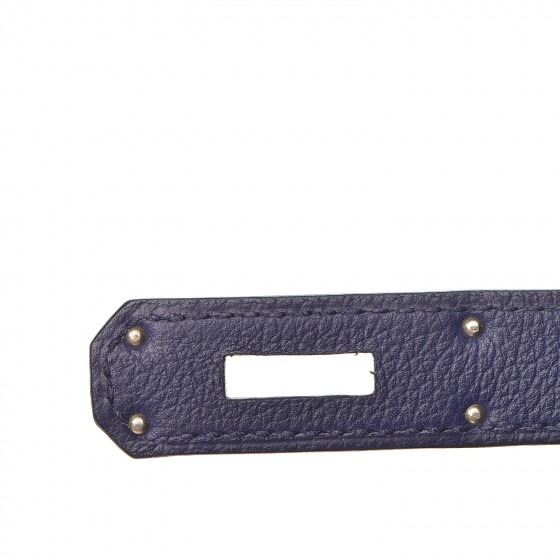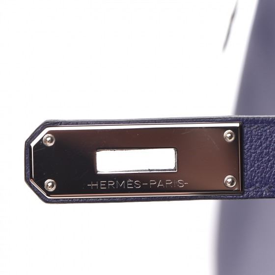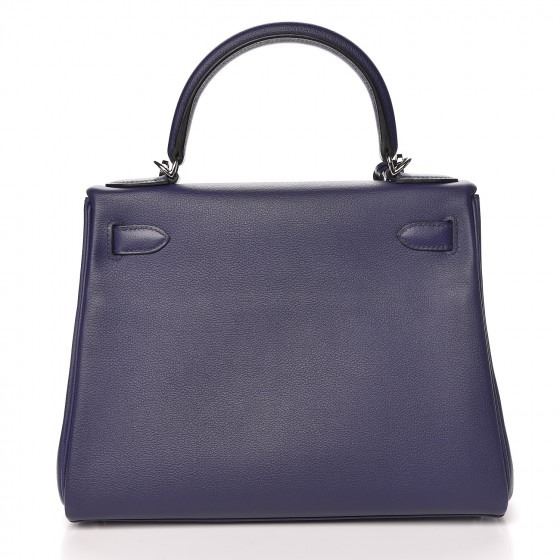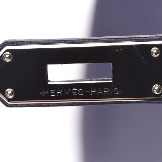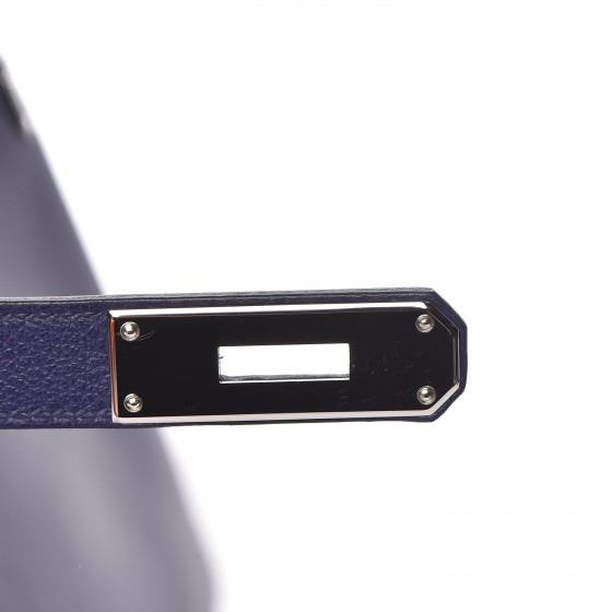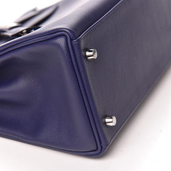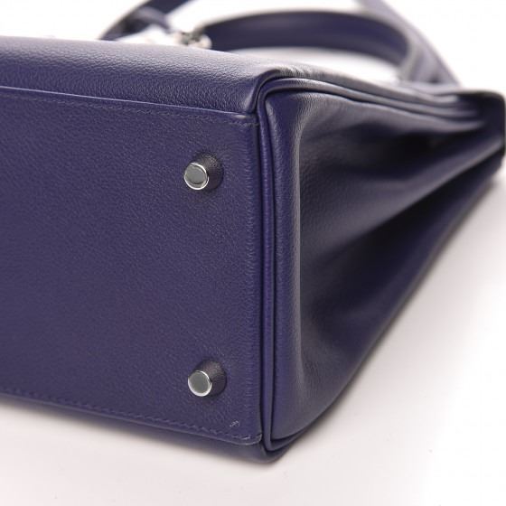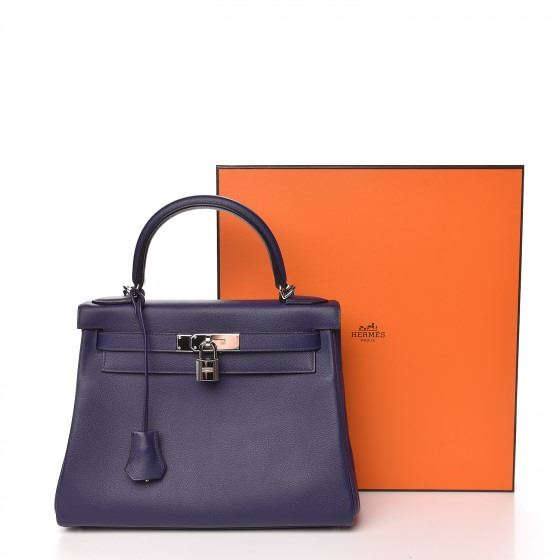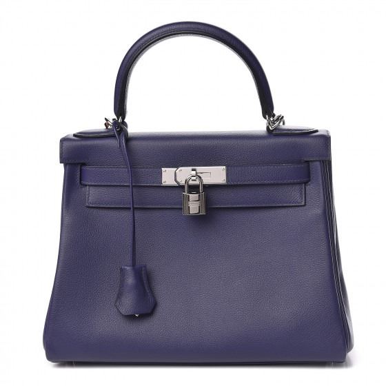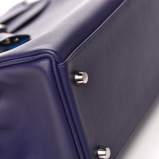 This handbag is crafted of rich veau evercolor calfskin leather in navy blue. The bag features a reinforced rolled leather top handle, an optional shoulder strap, a crossover flap and strap closure, palladium silver palladium plated hardware including a signature Kelly turn lock, a padlock, and a hanging clochette with keys. The flap opens to a matte bright blue leather interior with zipper and flat pockets.