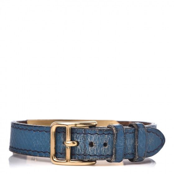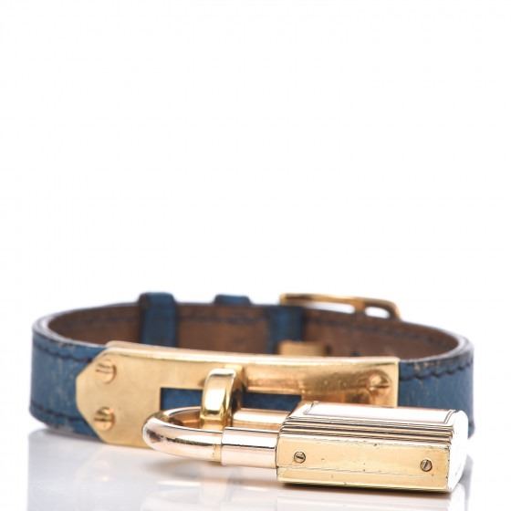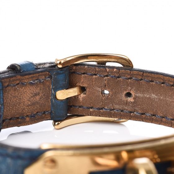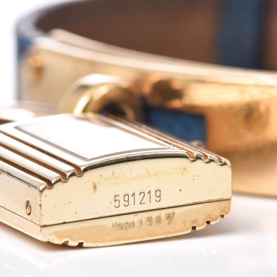 Bleu France watch is crafted of gold plated stainless steel and features a gold lock motif watch charm, blue courchevel calfskin leather, and a quartz movement.