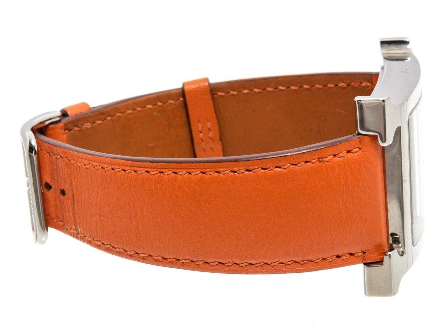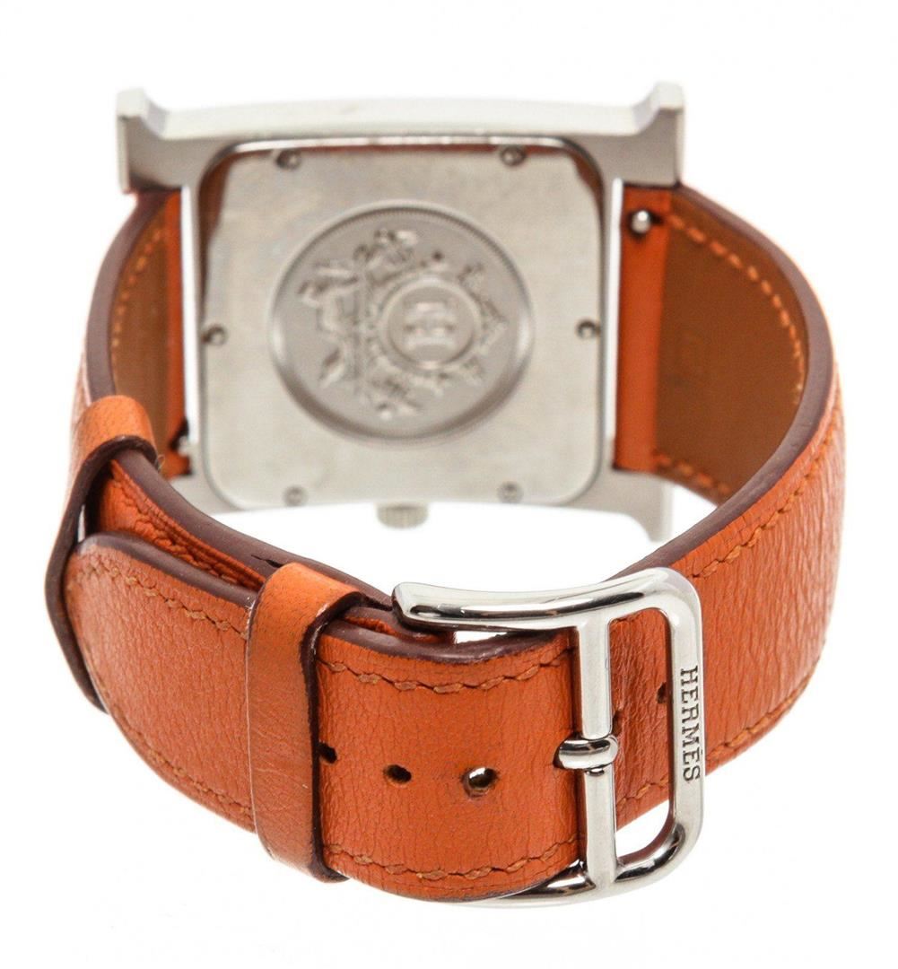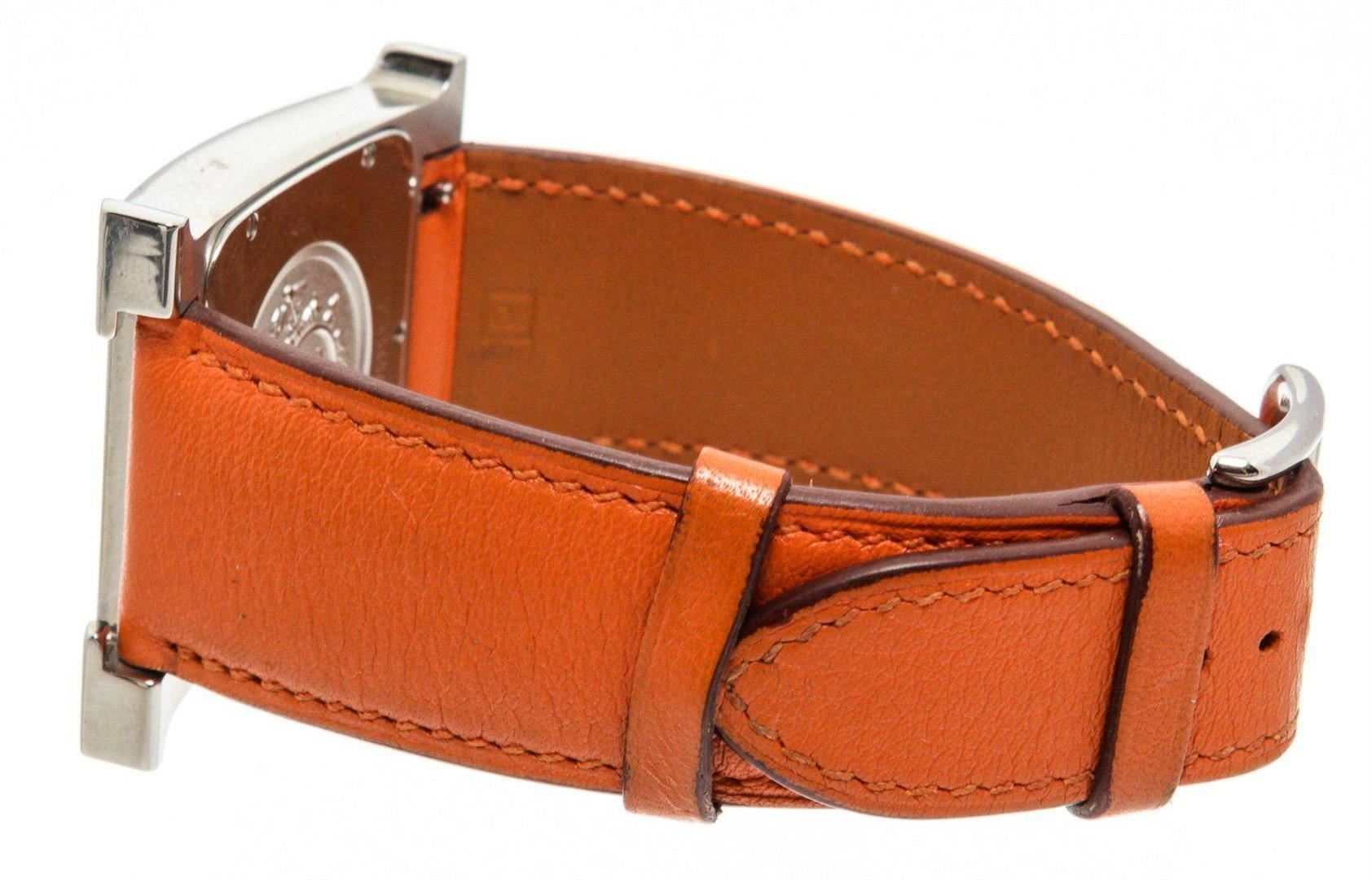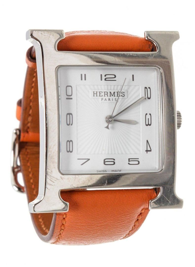 Stainless steel 30.5mm x 30.5mm Hermès Heure H watch featuring a quartz movement, smooth bezel, silver dial and orange leather strap with tang buckle. Measurements: Length: 1 in / 3 cm Width: 1 in / 3 cm 1 in / 3 cm Condition: Pre-Owned Good overall, please see photographs for detail.