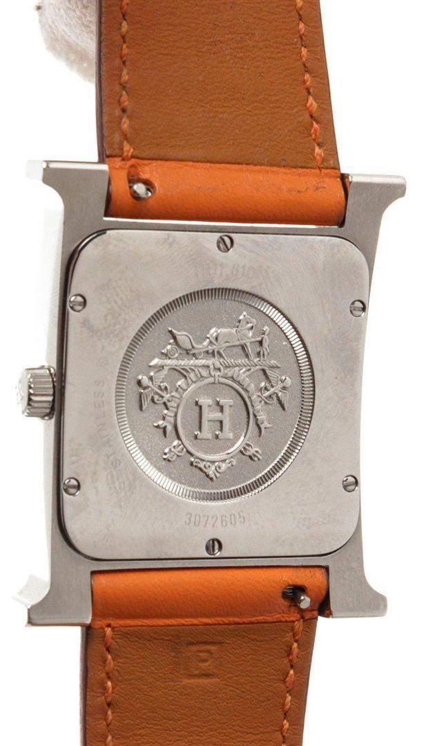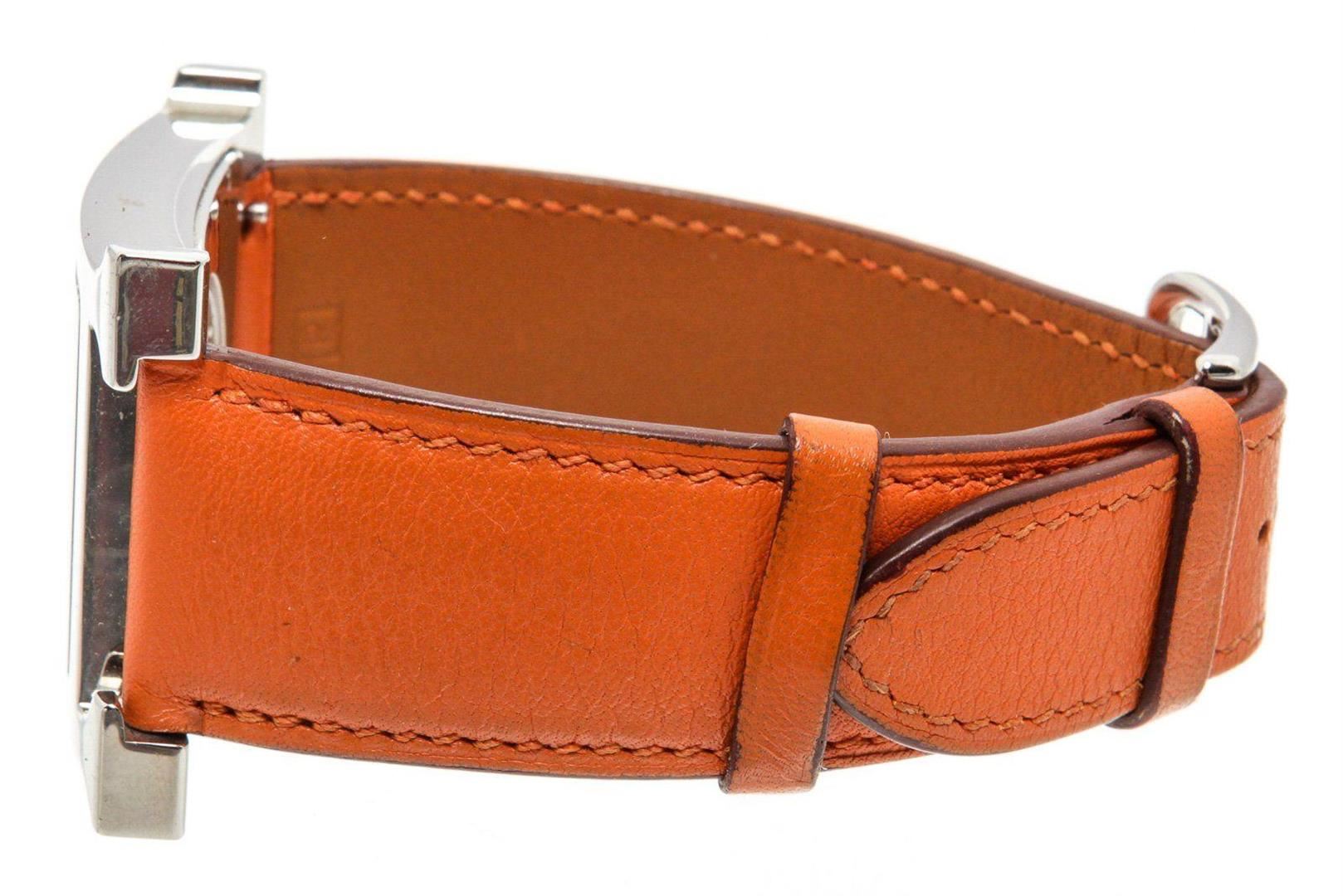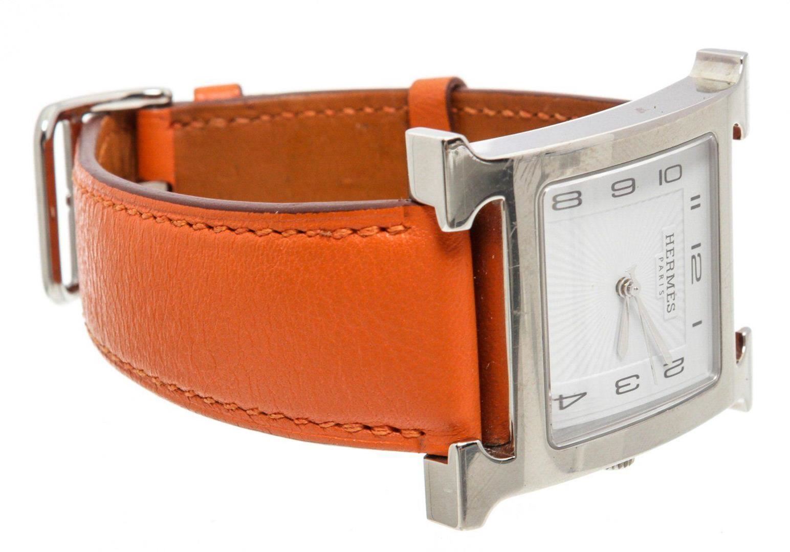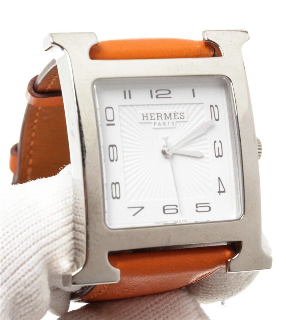 Stainless steel 30.5mm x 30.5mm Hermès Heure H watch featuring a quartz movement, smooth bezel, silver dial and orange leather strap with tang buckle. Measurements: Length: 1 in / 3 cm Width: 1 in / 3 cm 1 in / 3 cm Condition: Pre-Owned Good overall, please see photographs for detail.
