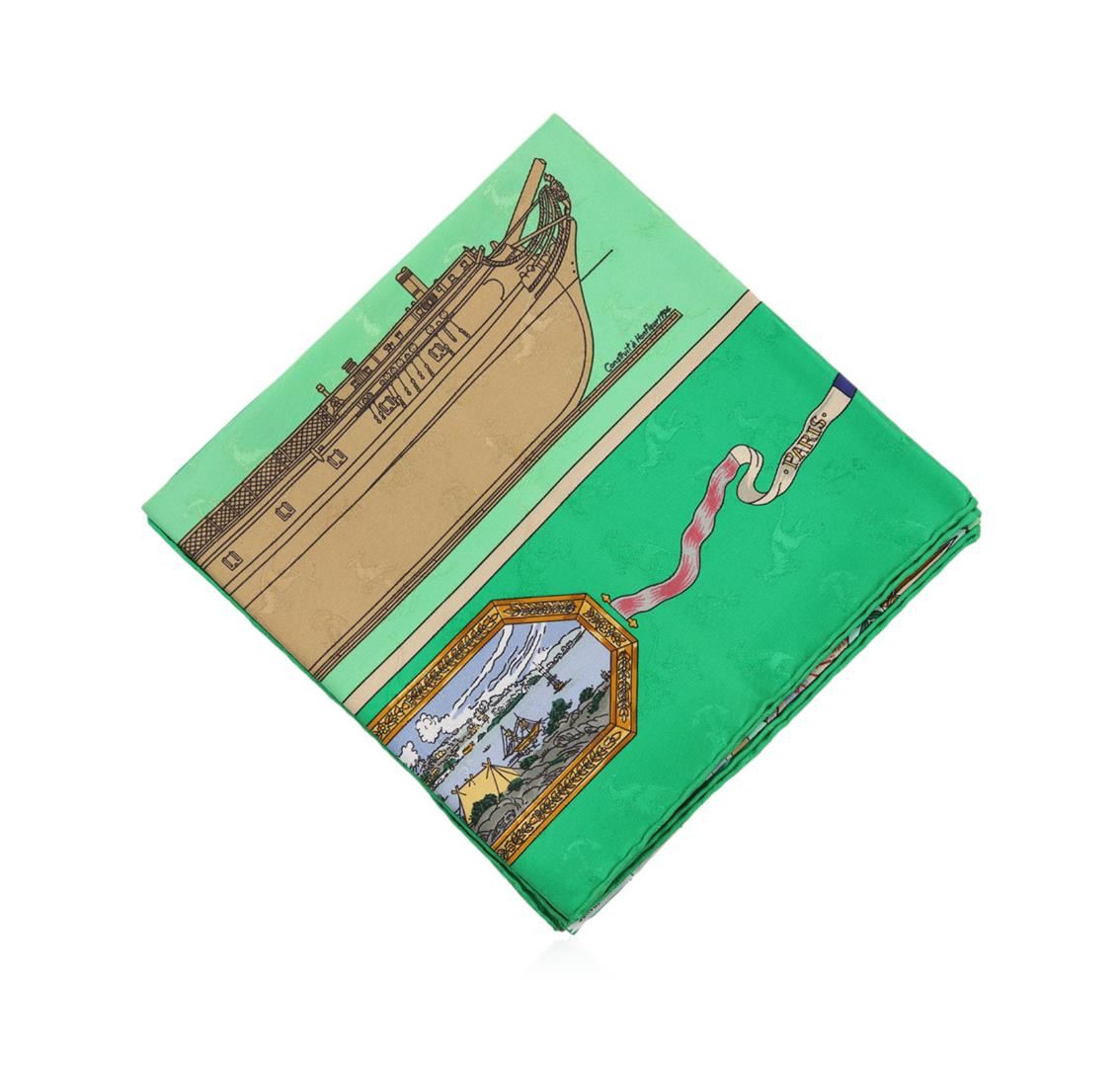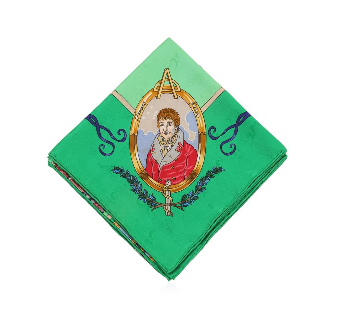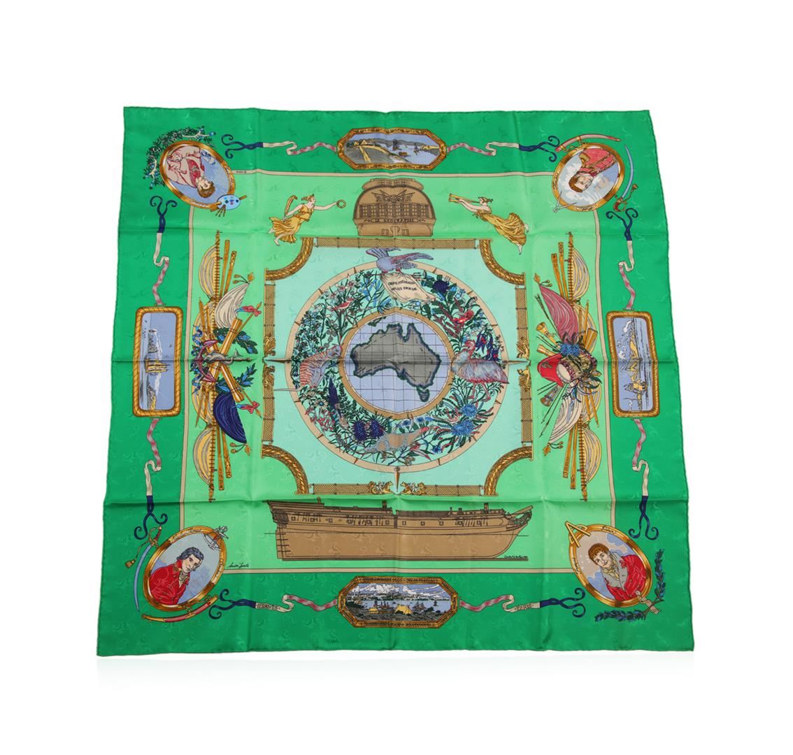 One Hermes silk scarf in good condition, measuring 90cm by 90cm. The scarf features the 'Le Geographe' design created by artist Sandra Laroche. The design features portraits of figures associated with the expedition of the ship Le Geographe, set against a green background with a kangaroo and anchor jacquard. Comes with an Hermes scarf box.
