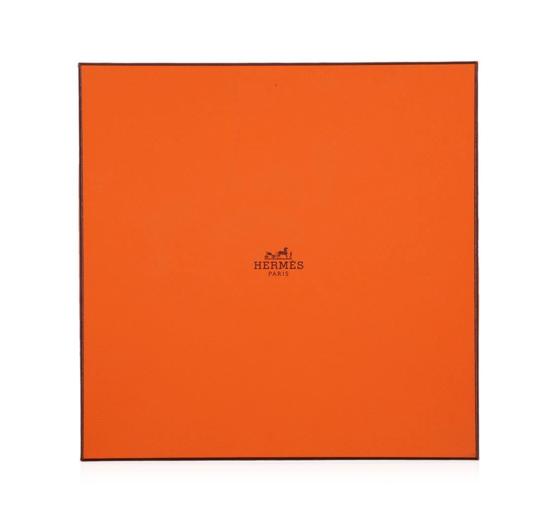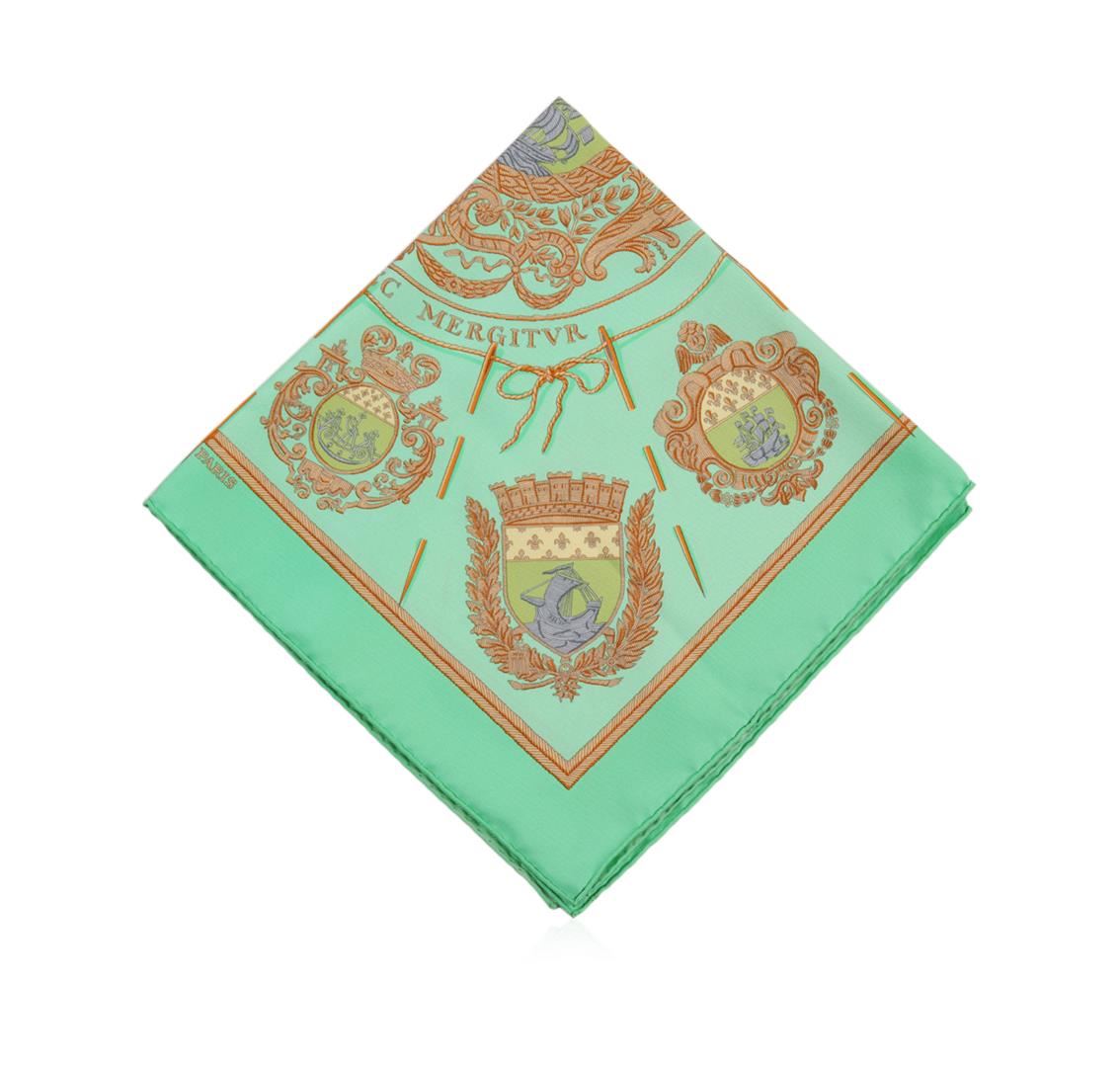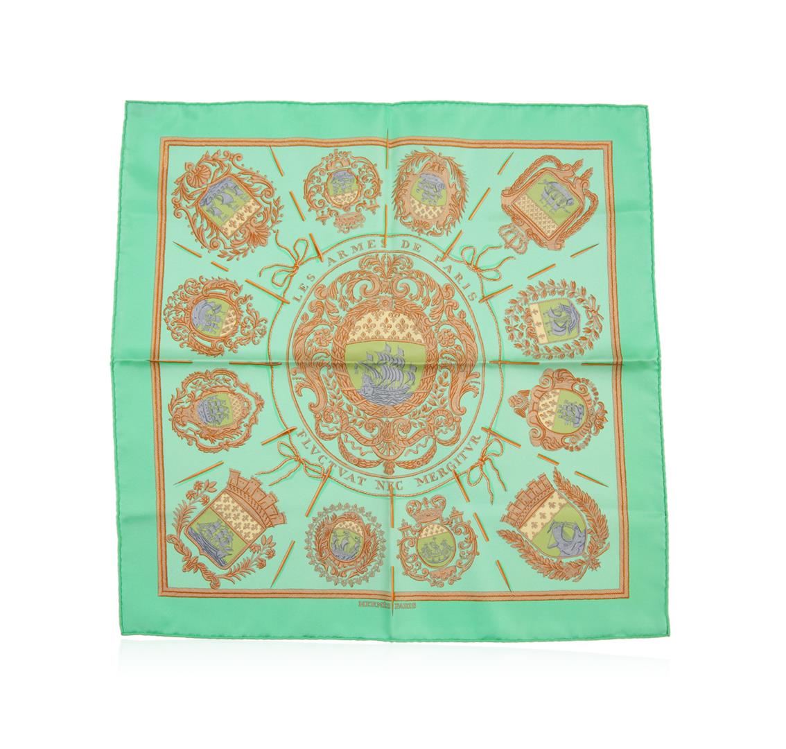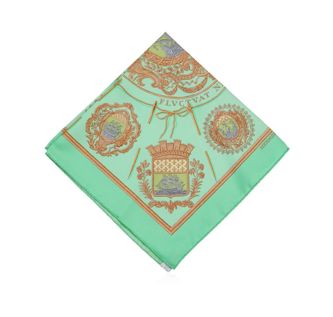 One Hermes silk scarf in good condition, measuring 40cm by 40cm. The scarf features the 'Les Armes de Paris' design created by artist Hugo Grygkar. The design features bronze needles and crests set against a sea foam green background. Comes with an Hermes scarf box.